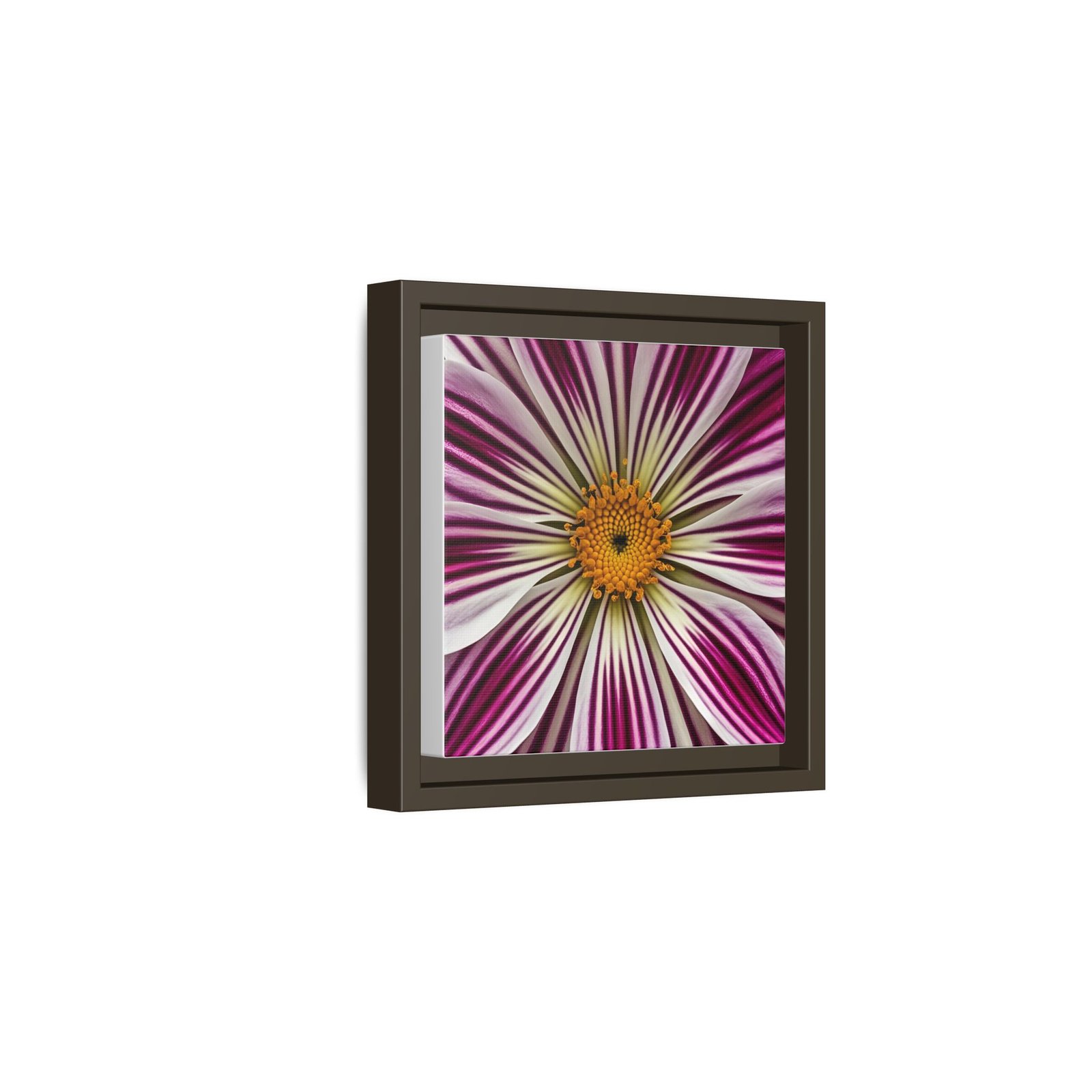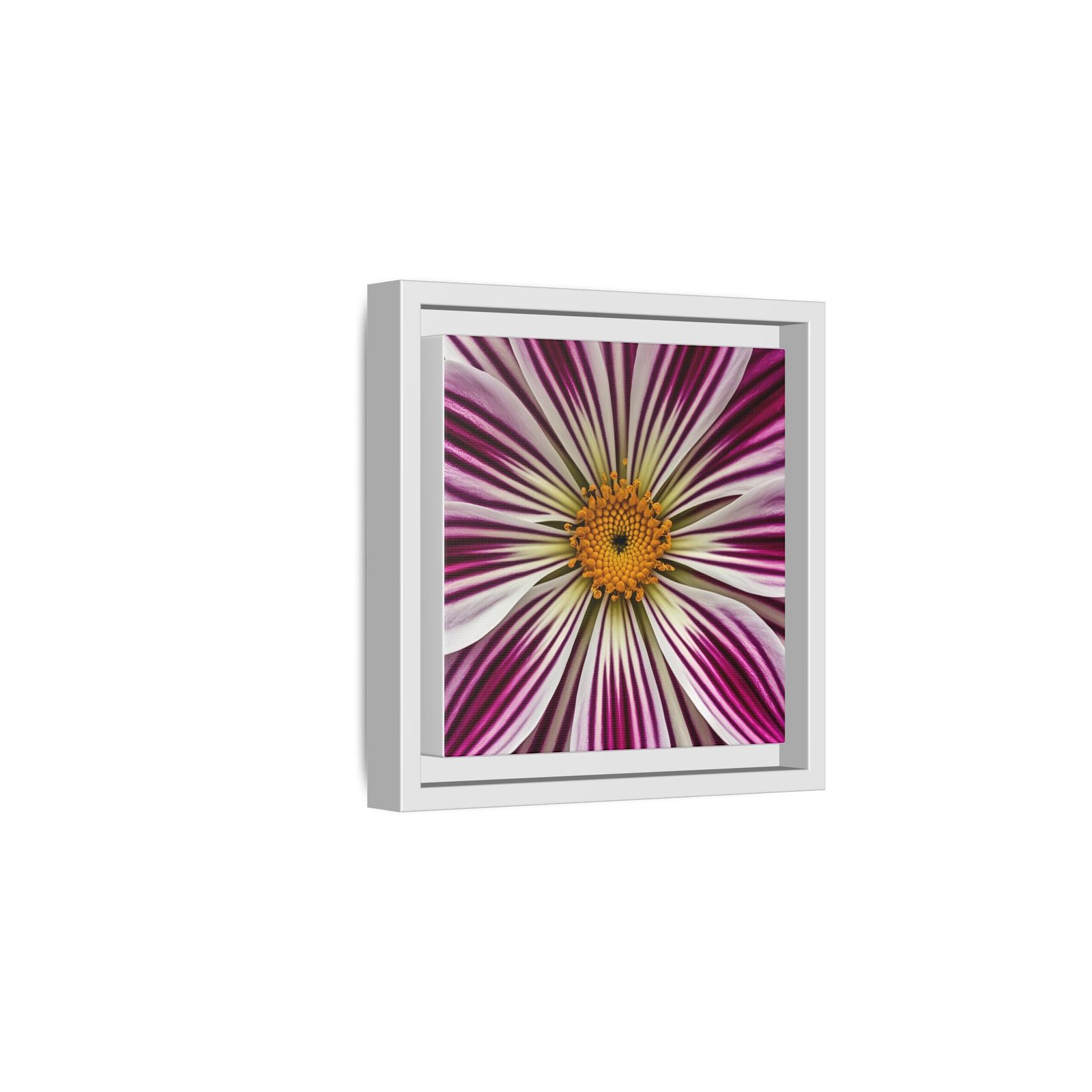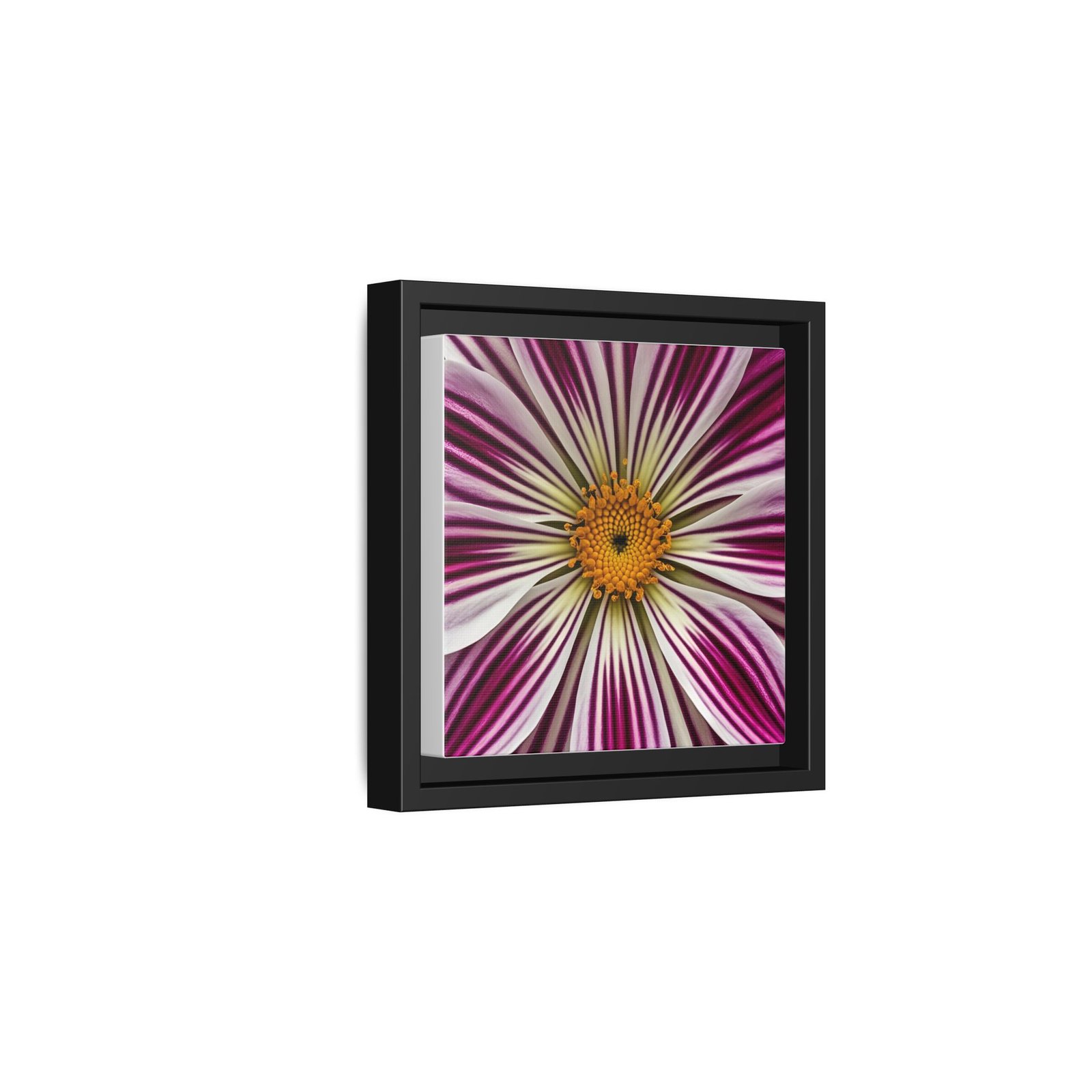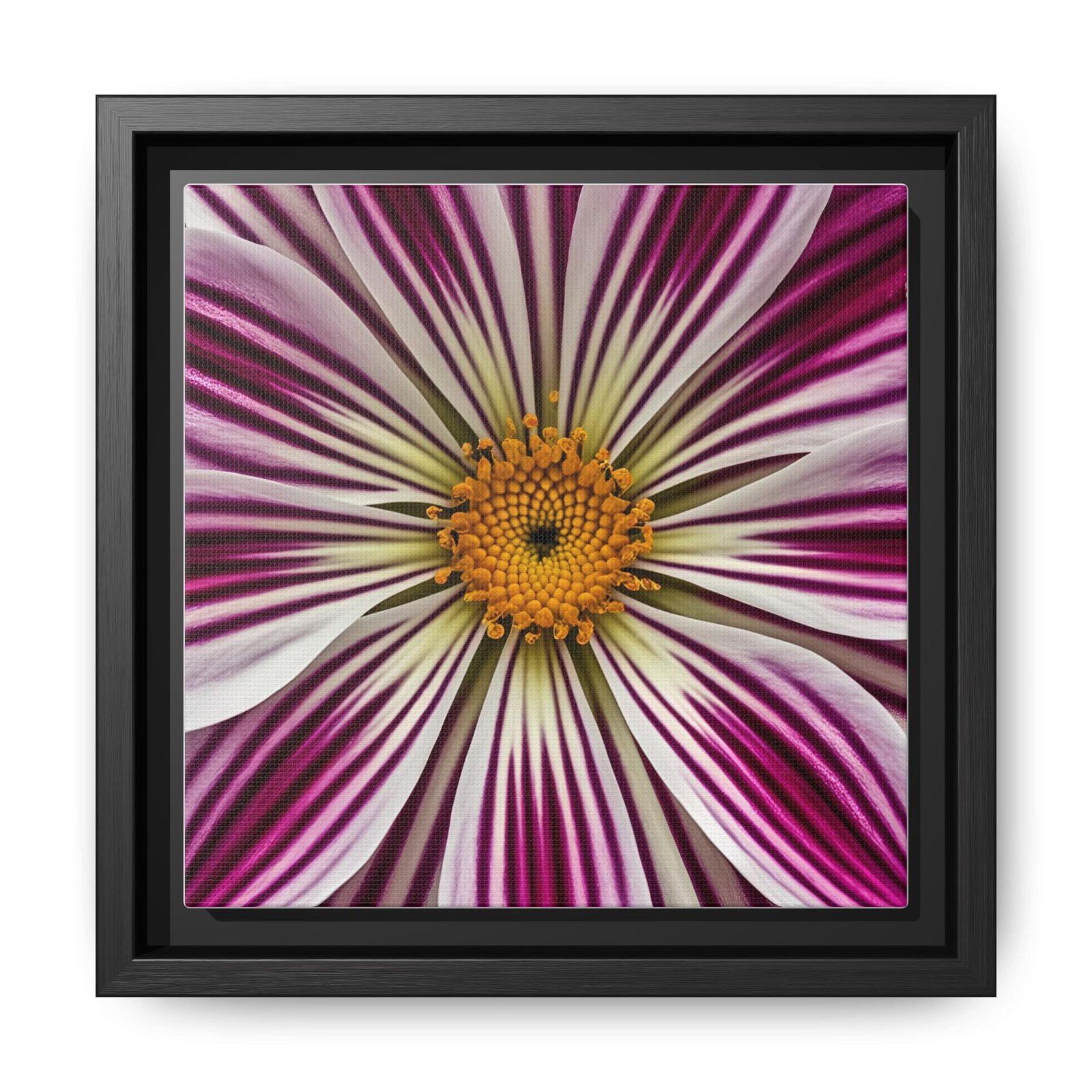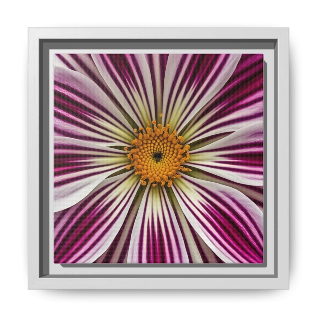 A framed matte canvas that brings close-up floral energy into any room. The square print captures a burst of magenta and white petals radiating from a warm golden center, rendered with bright, true-to-life color and rich detail. Housed in a slim pine frame with a matte finish, it hangs ready on the wall and blends easily with modern and eclectic décor. The textured canvas coating and latex-based, Greenguard Gold-certified inks keep the image vivid while meeting strict safety standards. Lightweight and sustainably built, this piece adds a focused pop of botanical color to entryways, desks, or cozy reading nooks.