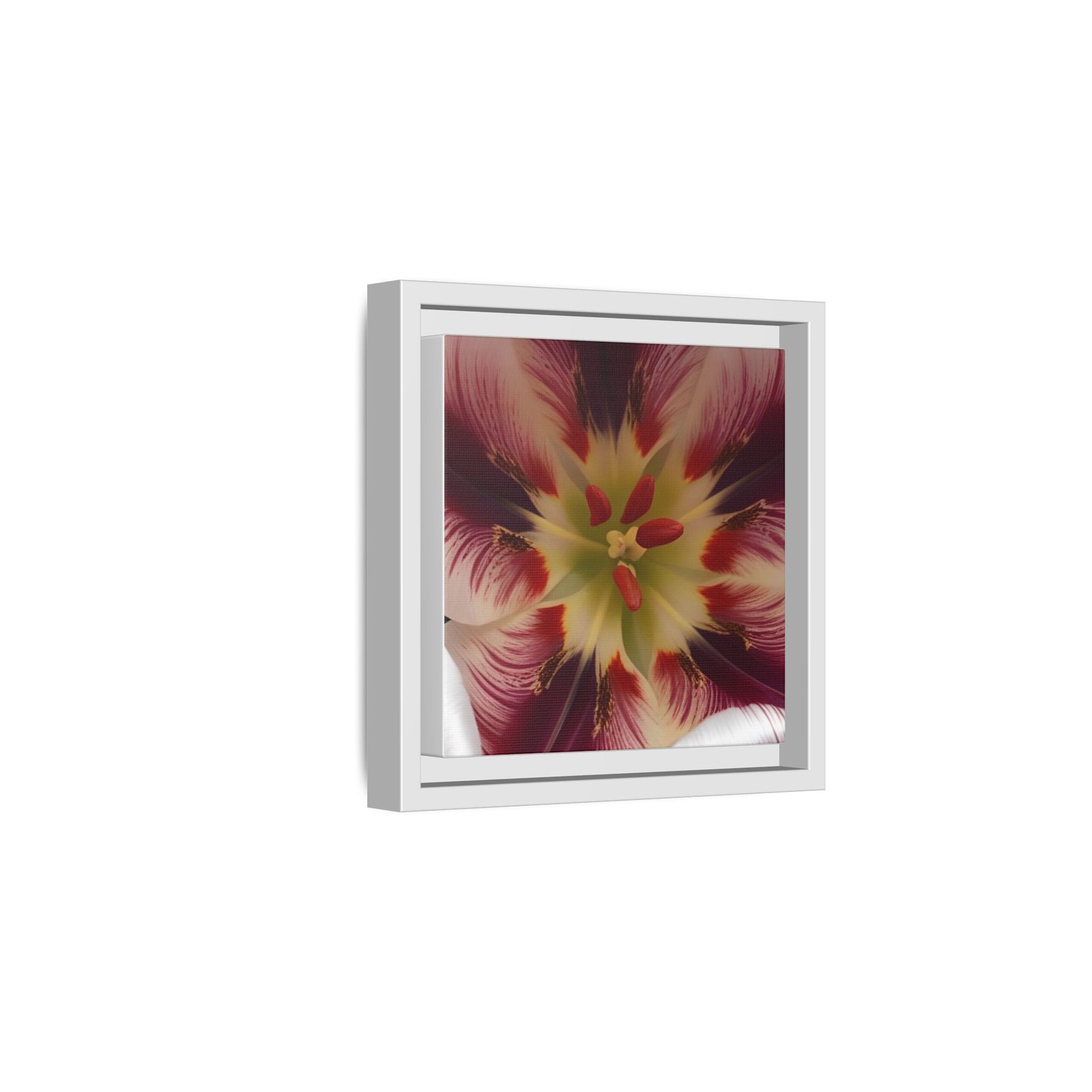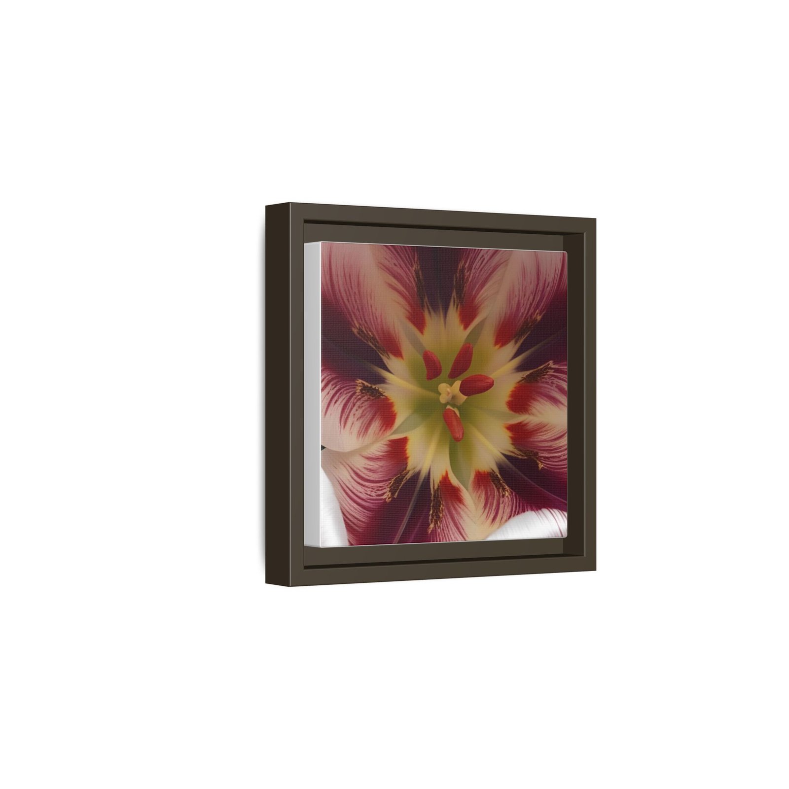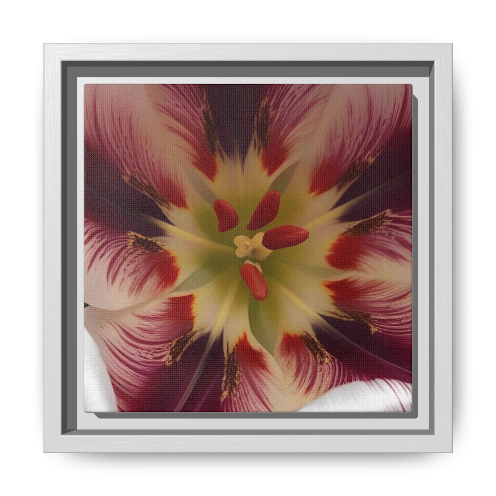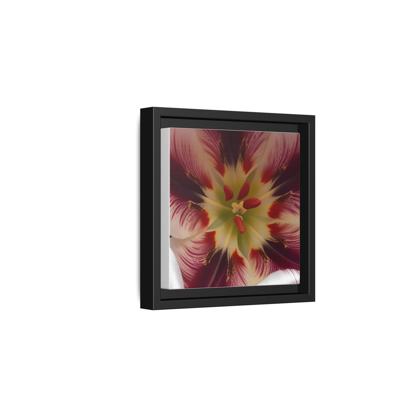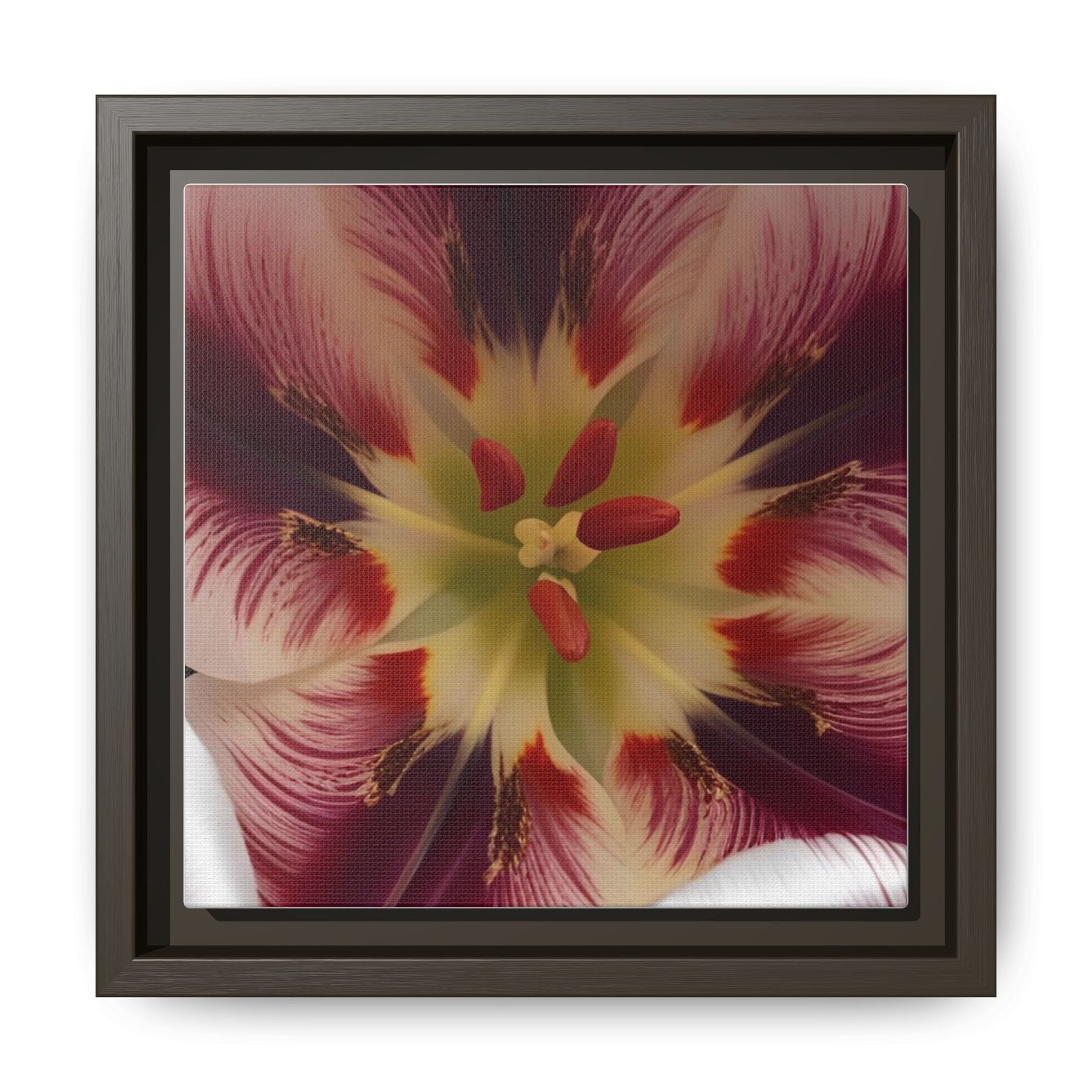 Framed matte canvas print that brings a close-up bloom into your room with painterly depth and rich, jewel-toned color. The image appears almost tactile against the smooth matte surface, while the slim pine shadowbox frame adds structure without stealing attention. Hang it on a gallery wall, over a console, or in a quiet reading nook to add a contemplative, botanical moment to everyday life. The overall look reads modern yet warm — a piece that feels collected over time rather than mass-produced.