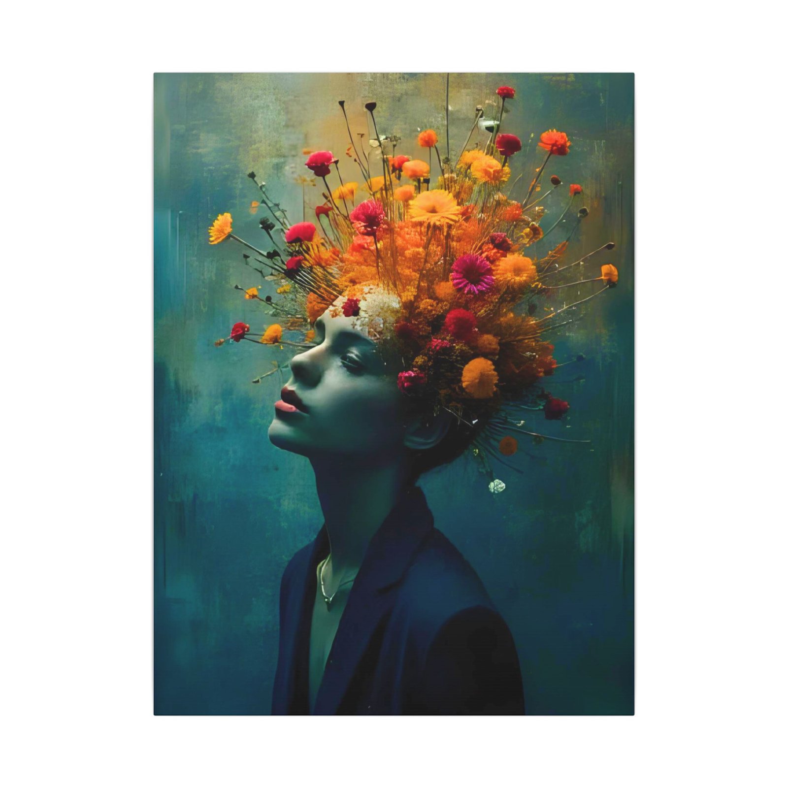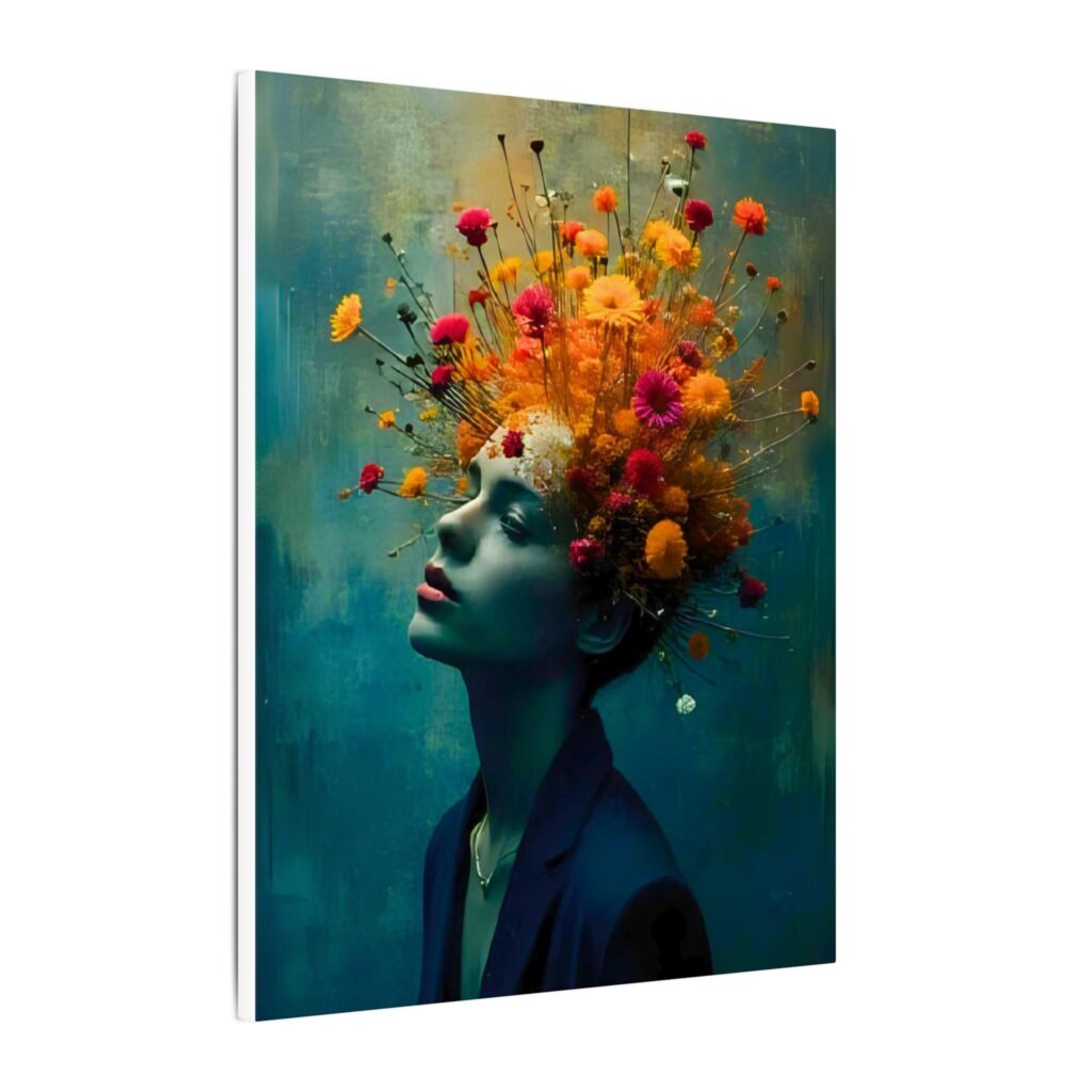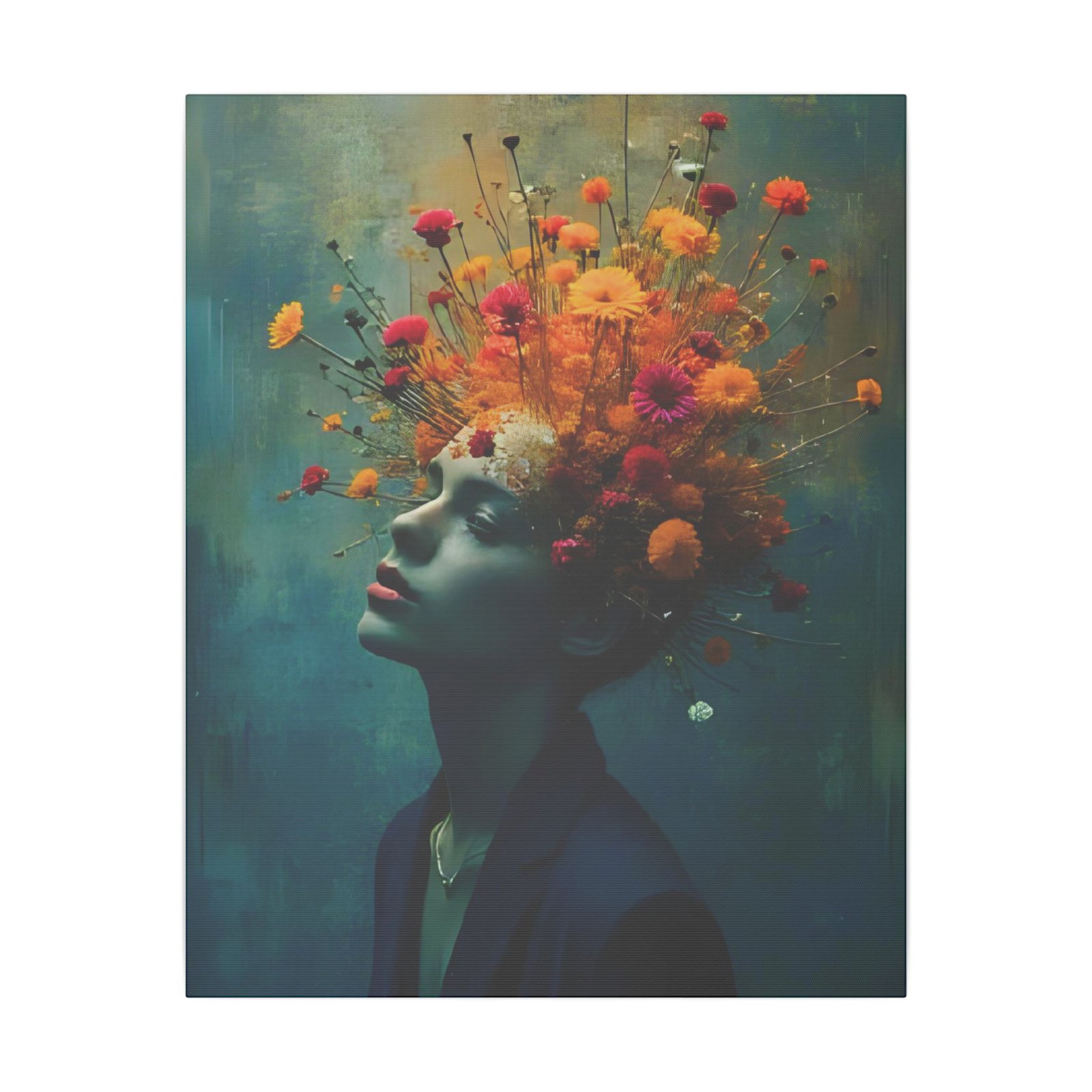 This stretched matte canvas brings a cinematic, dreamlike portrait into your space — a woman in quiet reverie crowned by an explosion of wildflowers. Colors sit rich and velvety against the muted teal background, while the matte finish softens glare and lends a gallery-quality depth. Hung in a living room, studio, or hallway, the piece reads like a visual poem: contemplative, vibrant, and quietly bold. It complements moody interiors, curated gallery walls, and creative workspaces, inviting viewers to linger and discover new details with each glance.