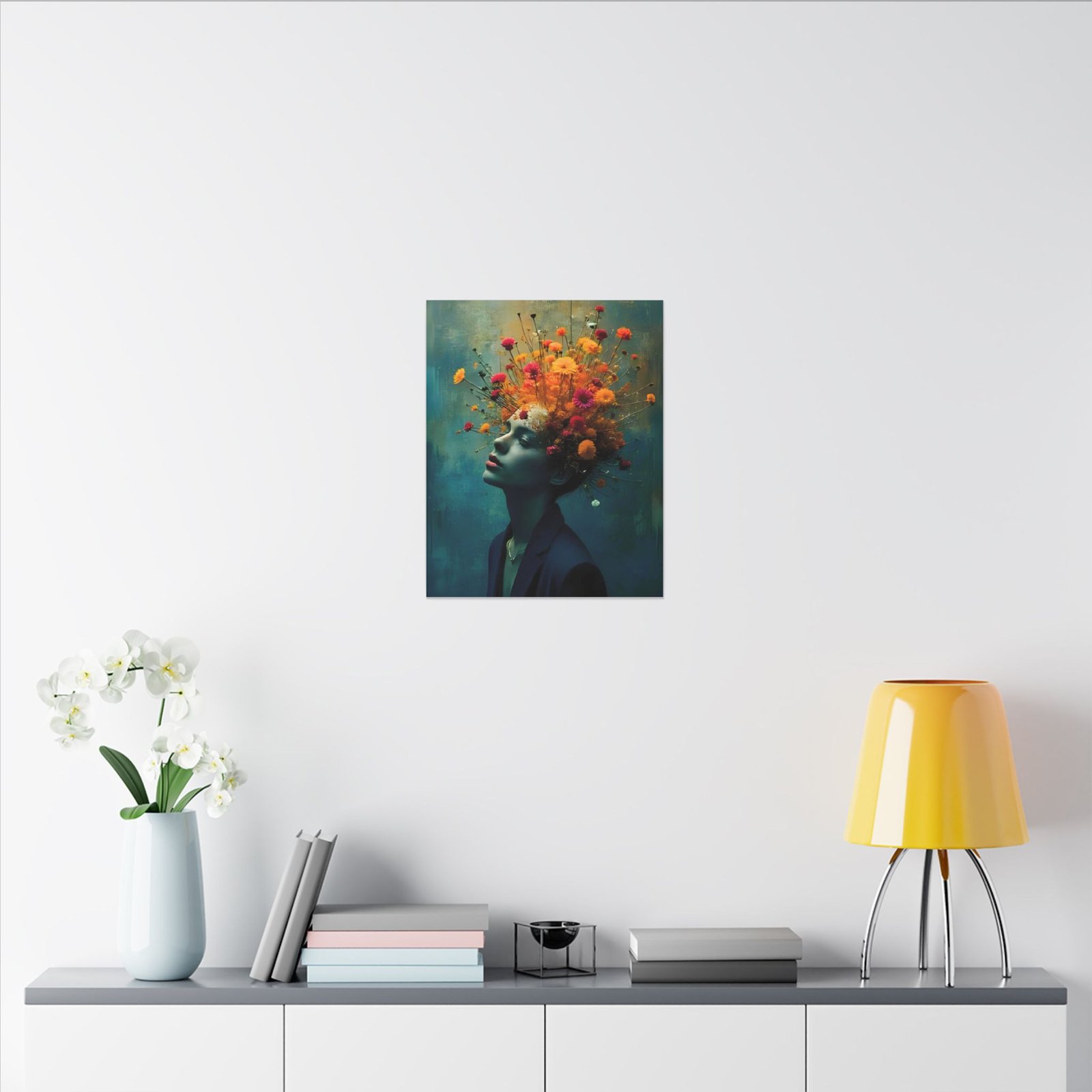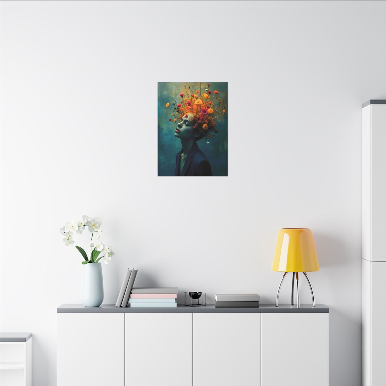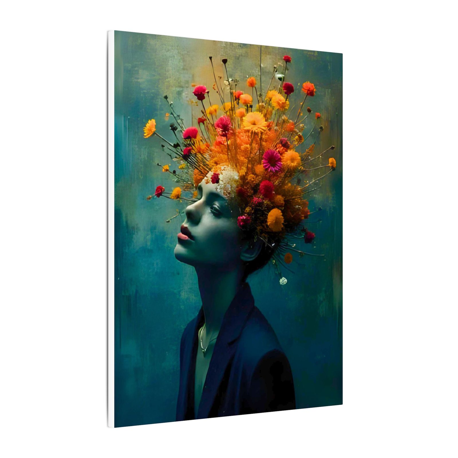 This stretched matte canvas brings a cinematic, dreamlike portrait into your space — a woman in quiet reverie crowned by an explosion of wildflowers. Colors sit rich and velvety against the muted teal background, while the matte finish softens glare and lends a gallery-quality depth. Hung in a living room, studio, or hallway, the piece reads like a visual poem: contemplative, vibrant, and quietly bold. It complements moody interiors, curated gallery walls, and creative workspaces, inviting viewers to linger and discover new details with each glance.