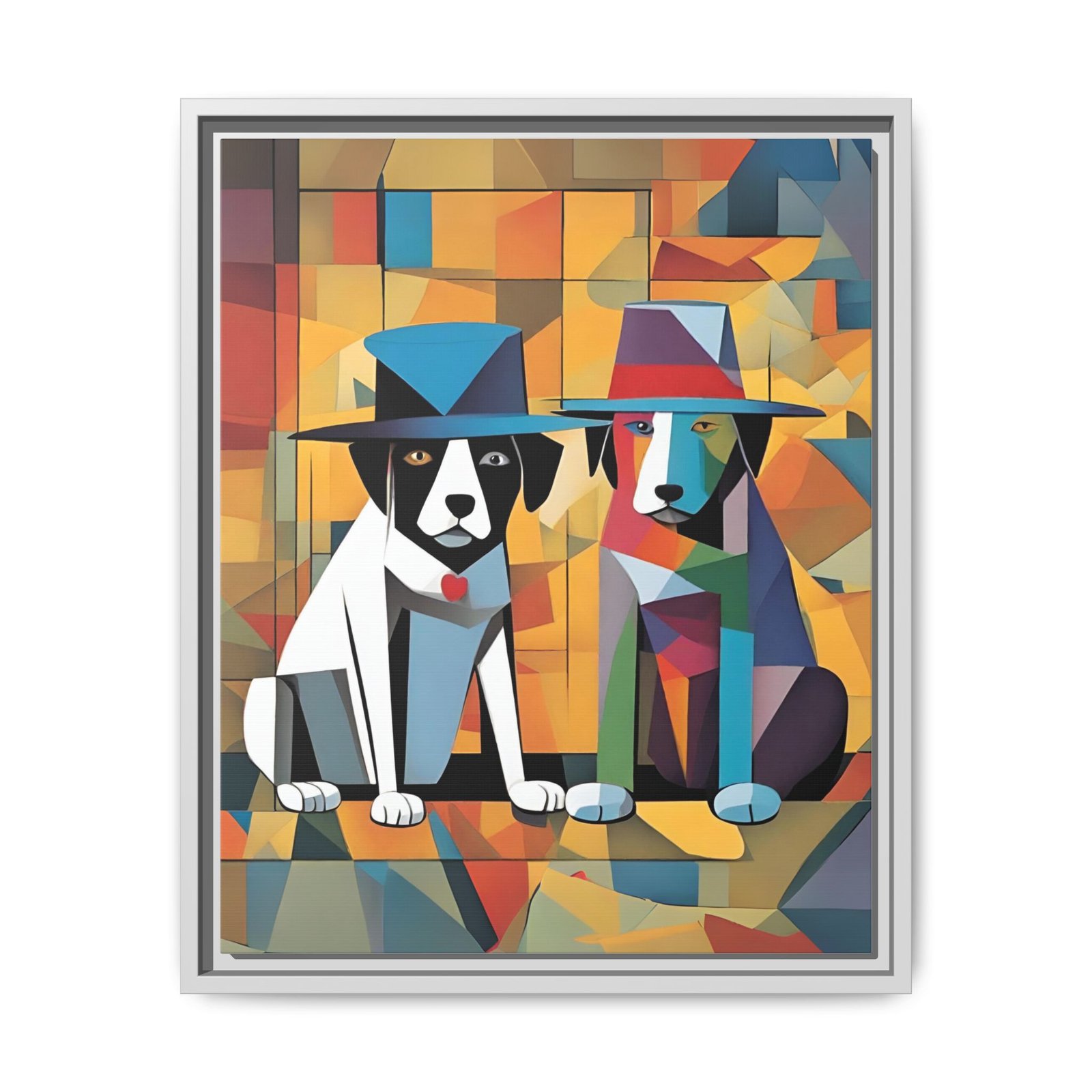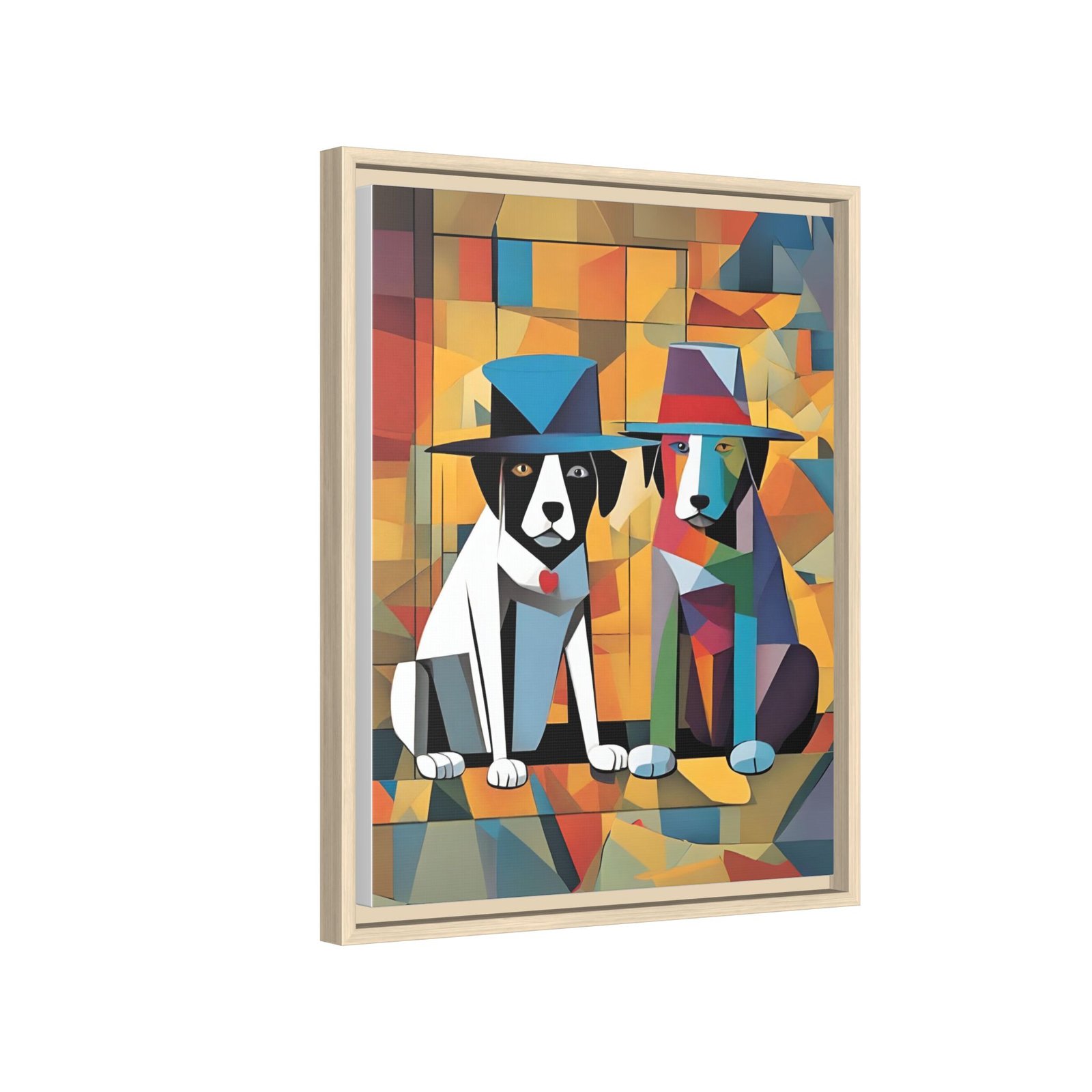 A framed matte canvas print that brings bold color and modern whimsy to any wall. Two stylized dogs in vibrant, geometric hues sit against a warm, abstract backdrop — the artwork feels playful and sophisticated at once. The slim pine frame and matte finish keep reflections low and the focus on crisp, saturated color. Hang it in an entryway to greet visitors with character, or let it anchor a living room gallery wall as a lively focal point.