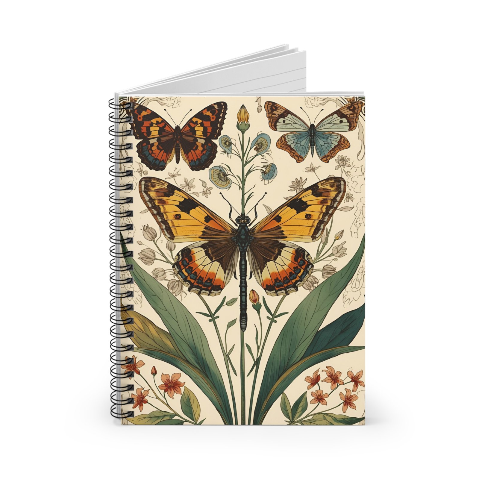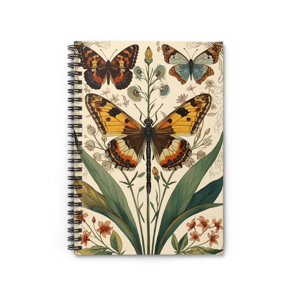 — Vintage Floral Ruled Journal. A small spiral notebook covered in vintage botanical art—soft cream background, hand-drawn leaves and blossoms, and a centerpiece butterfly in warm amber tones. The ruled 90gsm pages invite steady handwriting, sketching, and lists without bleed-through. A dark grey back cover and metal spiral give it a grounded, slightly rustic feel, while the inside document pocket keeps loose notes or receipts safe. Compact at 6″ x 8″, it slips into tote bags and satchels for field notes, poetry, or everyday planning. Use it when you want your thoughts to sit on paper that feels thoughtful and quietly beautiful—like a little keepsake you reach for again and again.
