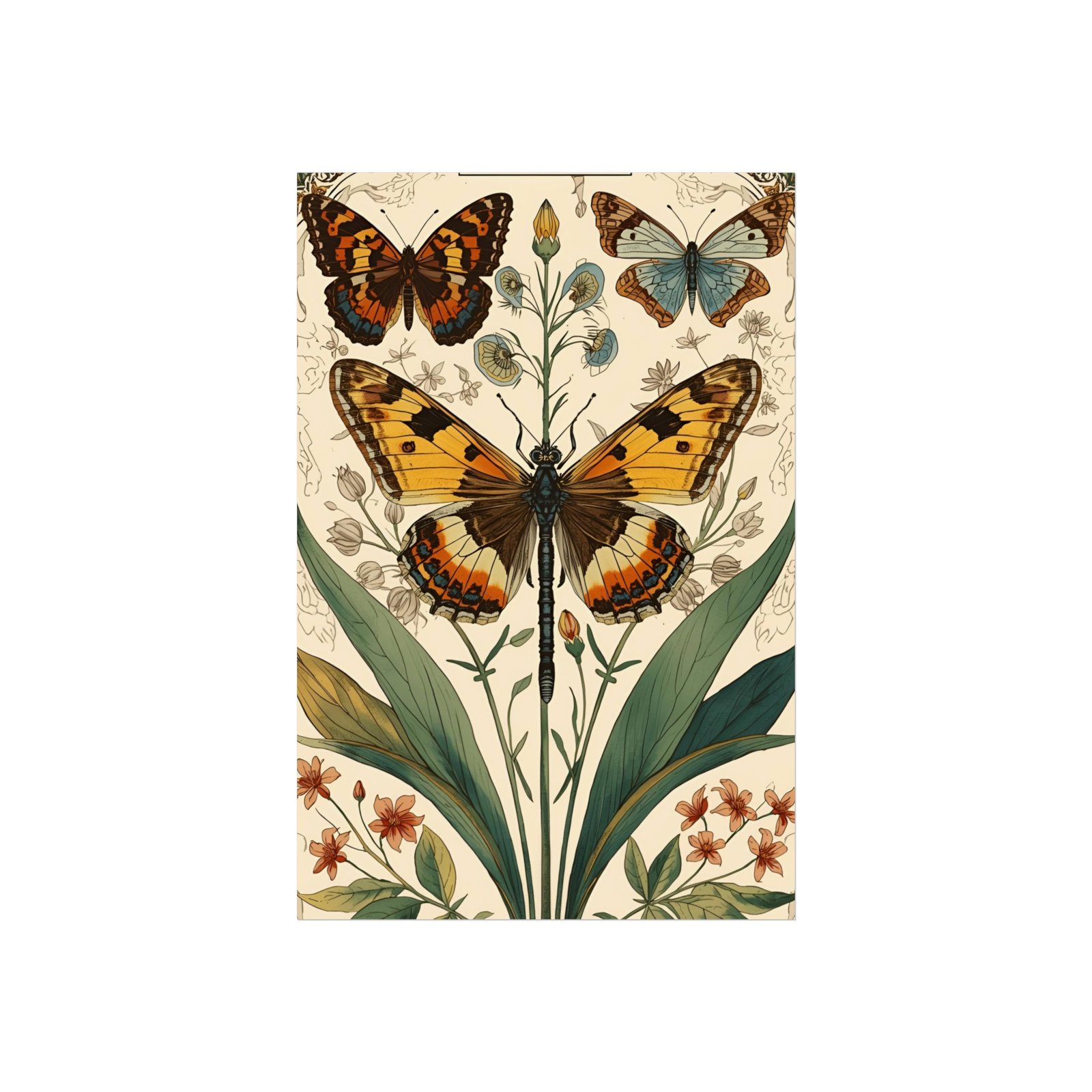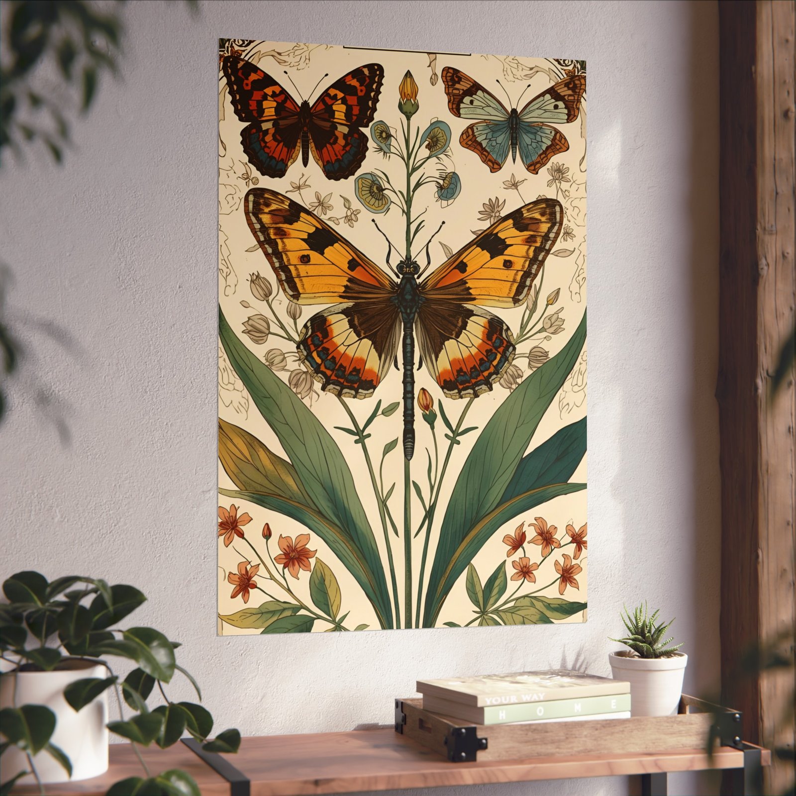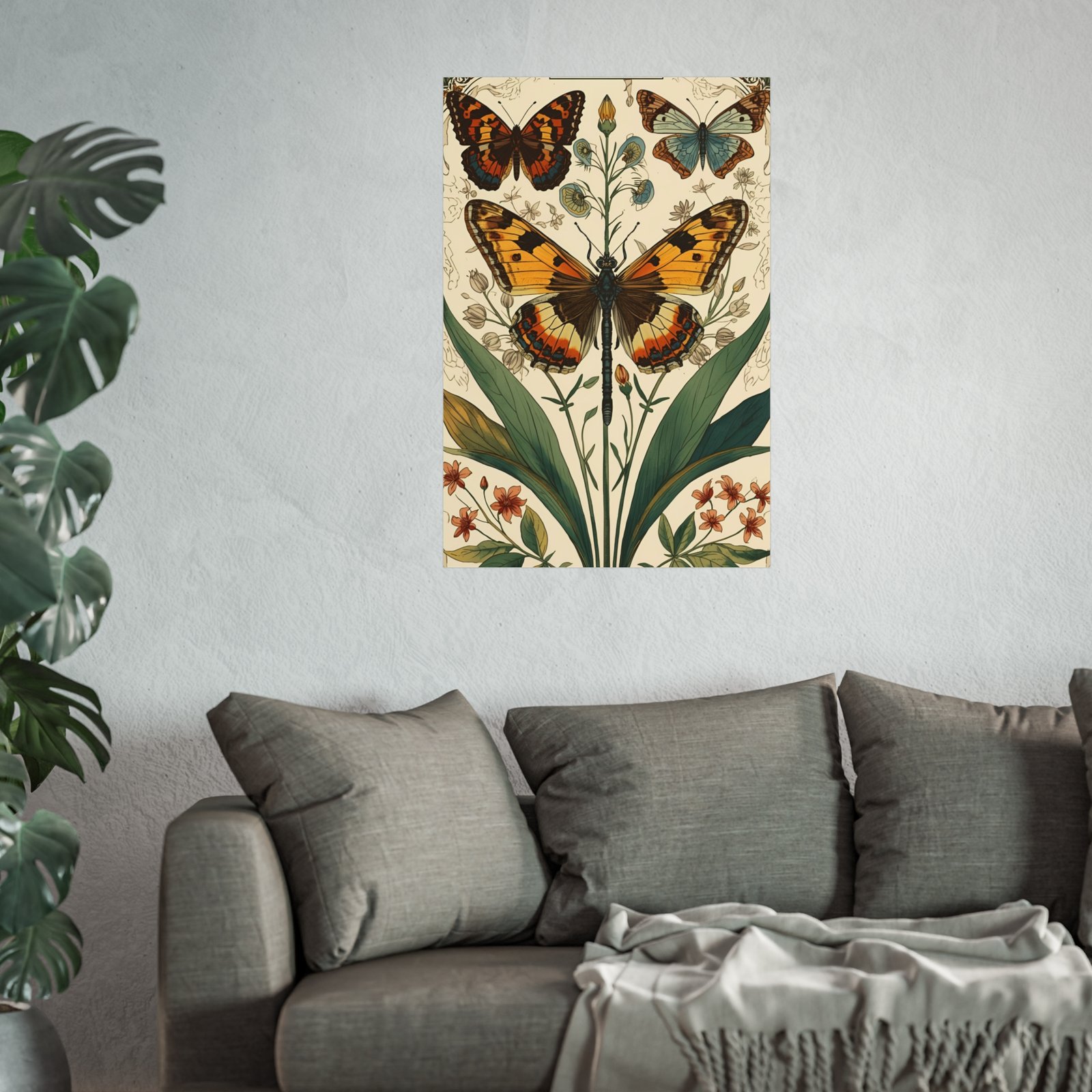 A gallery-quality fine art poster that brings a vintage naturalist study into your space. Warm cream tones and intricately drawn butterflies float above stylized botanical leaves, creating a calm, studied mood—like finding an old field journal on a quiet afternoon. Printed with giclée precision on smooth matte, 220 gsm archival paper, this piece feels both delicate and substantial on the wall. It slips into living rooms, reading nooks, or home offices as a quiet focal point that invites slow looking and soft conversation. Available in multiple orientations and sizes to suit a tight wall or a layered gallery arrangement.