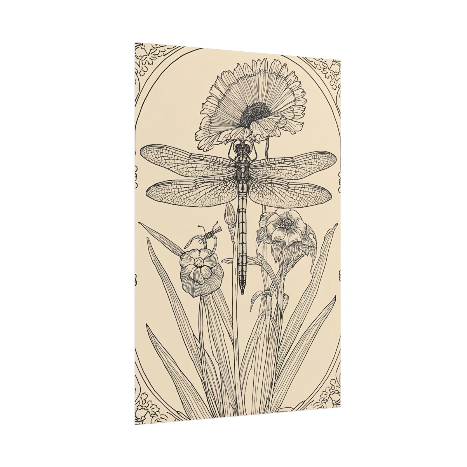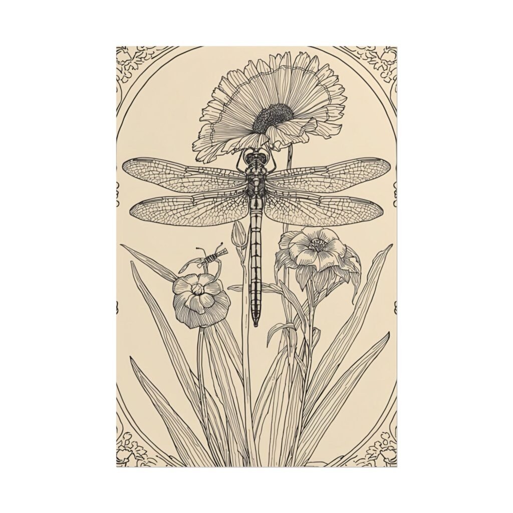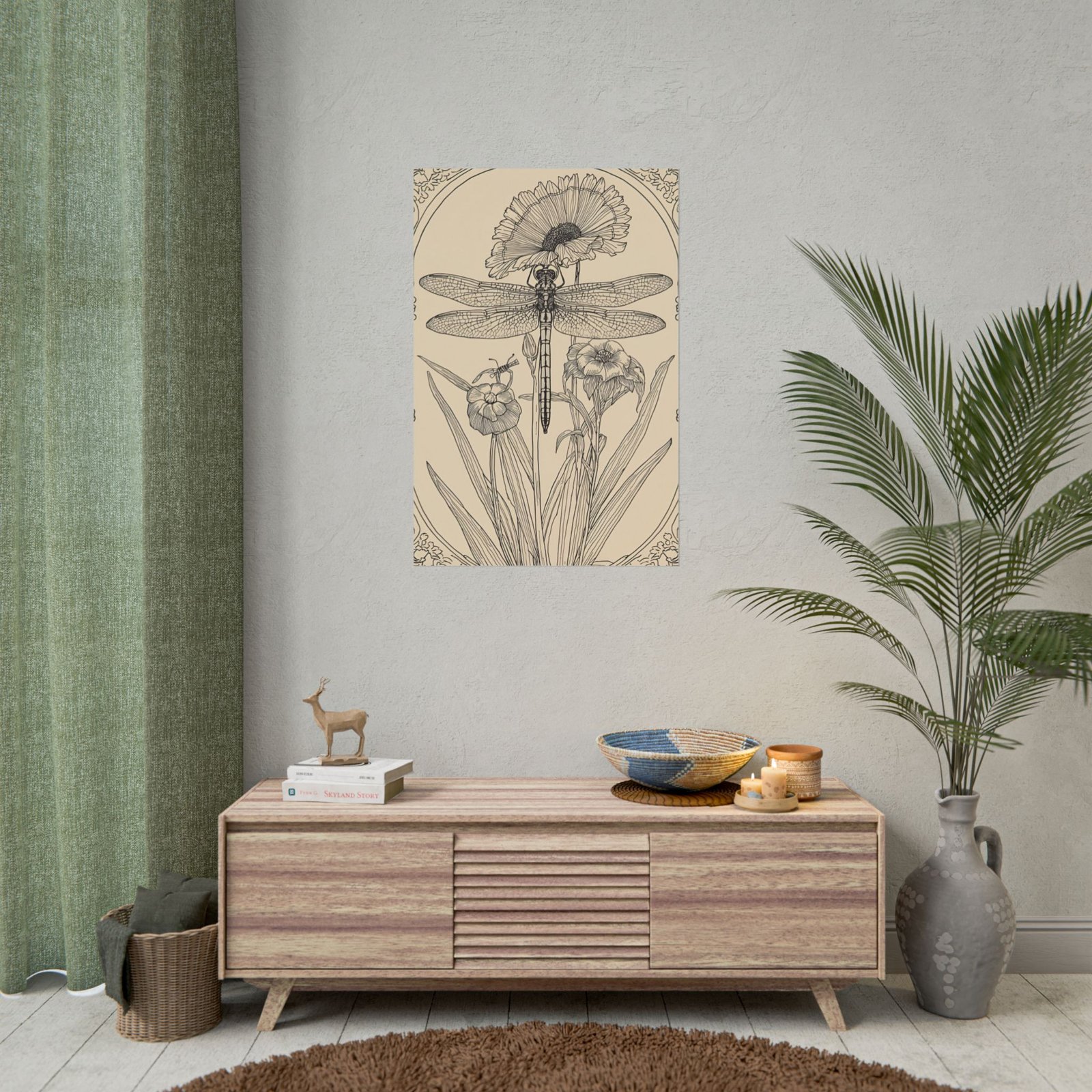 Hand-drawn lines, soft neutral tones, and botanical detail come together in this rolled poster to bring a calm, vintage-natural touch to your walls. The delicate dragonfly rests above slender iris and daisy-like blooms, framed by a subtle arched border that feels like a page from an old nature journal. Hung alone or layered with other prints, this piece adds quiet curiosity and an organic, studio-made presence to living rooms, bedrooms, or creative nooks.
