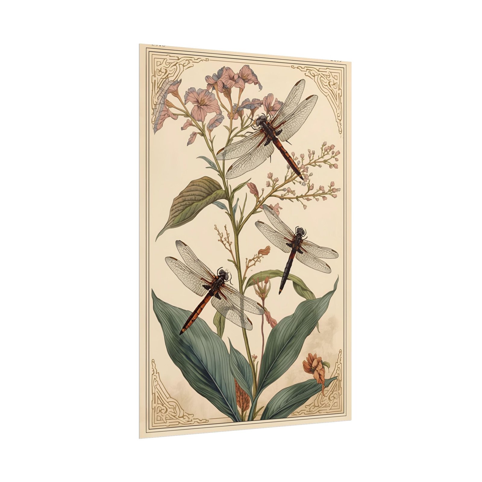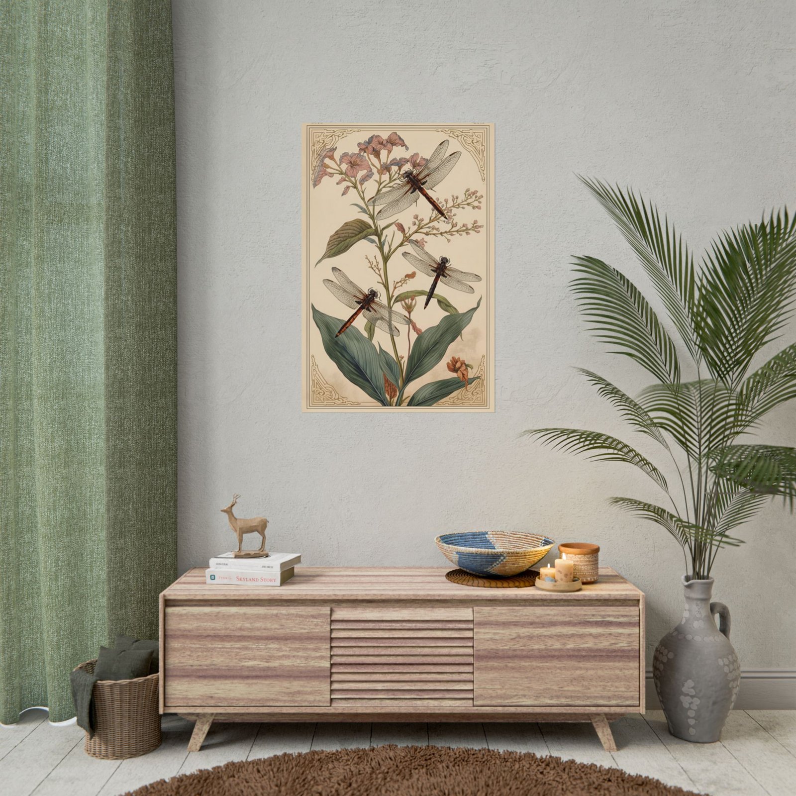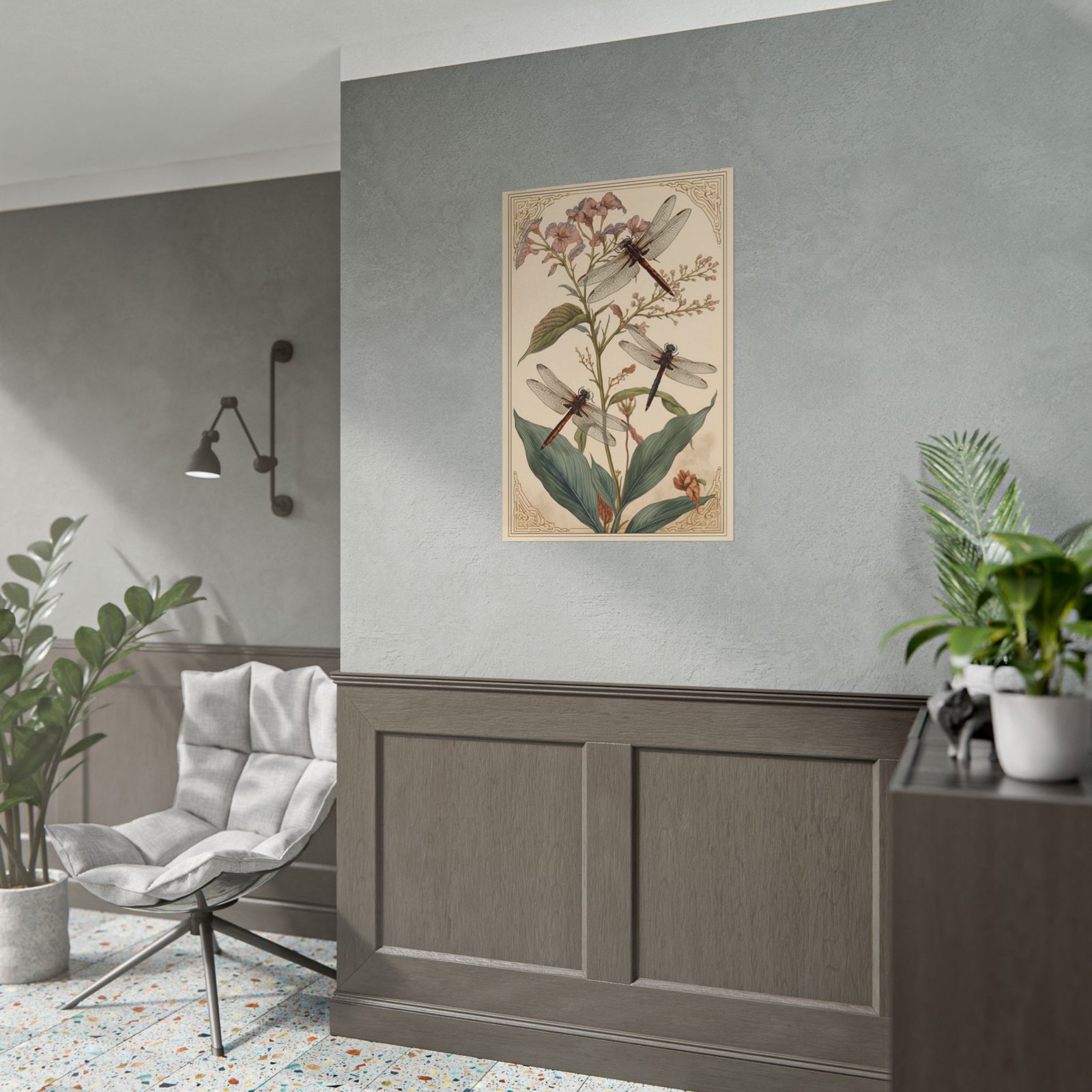 A delicate vintage botanical poster that brings quiet natural beauty to any wall. Soft, aged-cream tones set the stage for detailed linework and watercolor-style shading — three dragonflies hover around a flowering stem, framed by an elegant ornamental border. The look is timeless: part scientific illustration, part romantic keepsake. Hung above a desk or in a cozy reading nook, this print adds gentle charm and a sense of slow afternoons outdoors. Choose textured fine art for gallery-like depth, semi-glossy for vivid color and clarity, or matte for a softer, museum-worthy finish. Available in horizontal and vertical layouts and multiple sizes to fit shelves, small nooks, or full gallery arrangements.