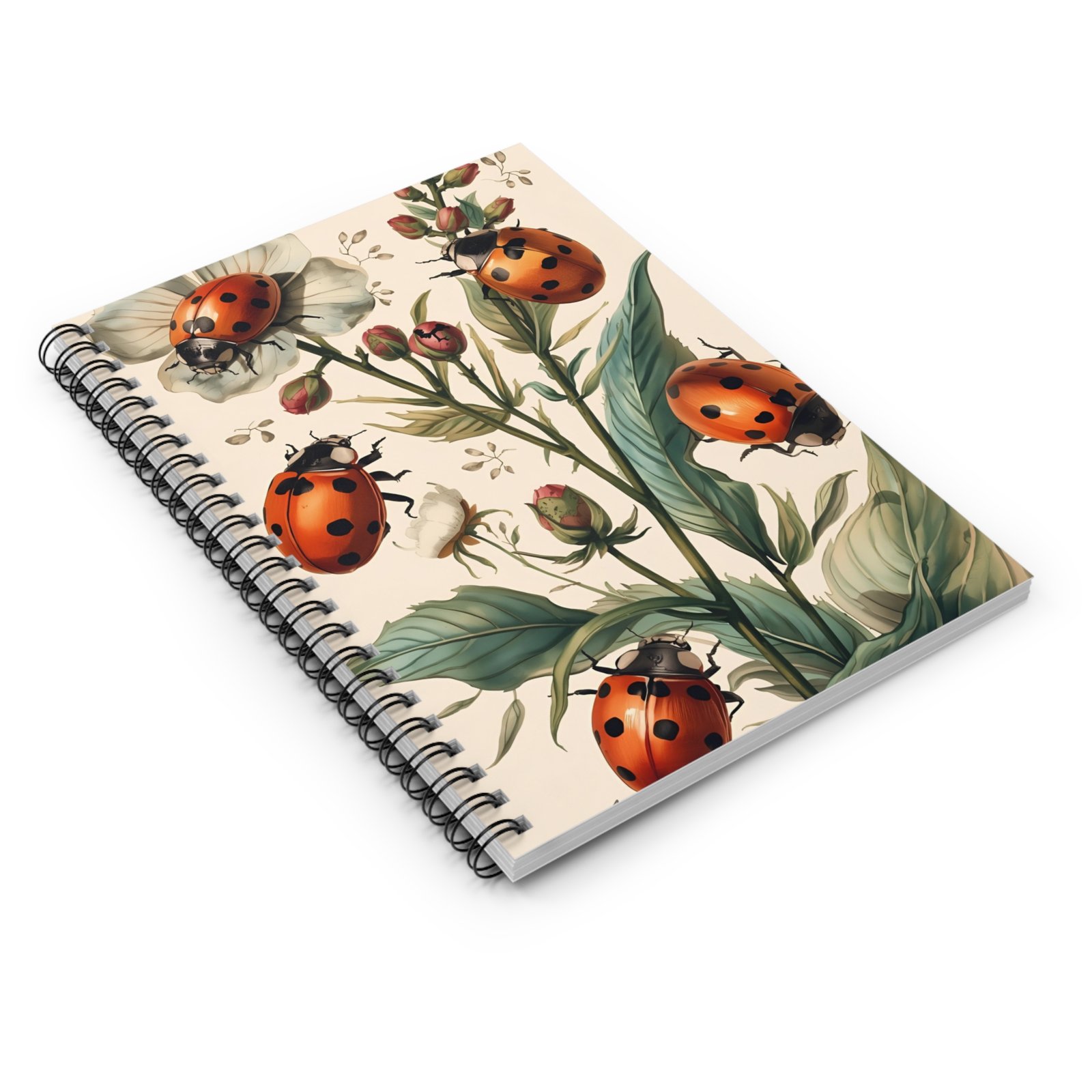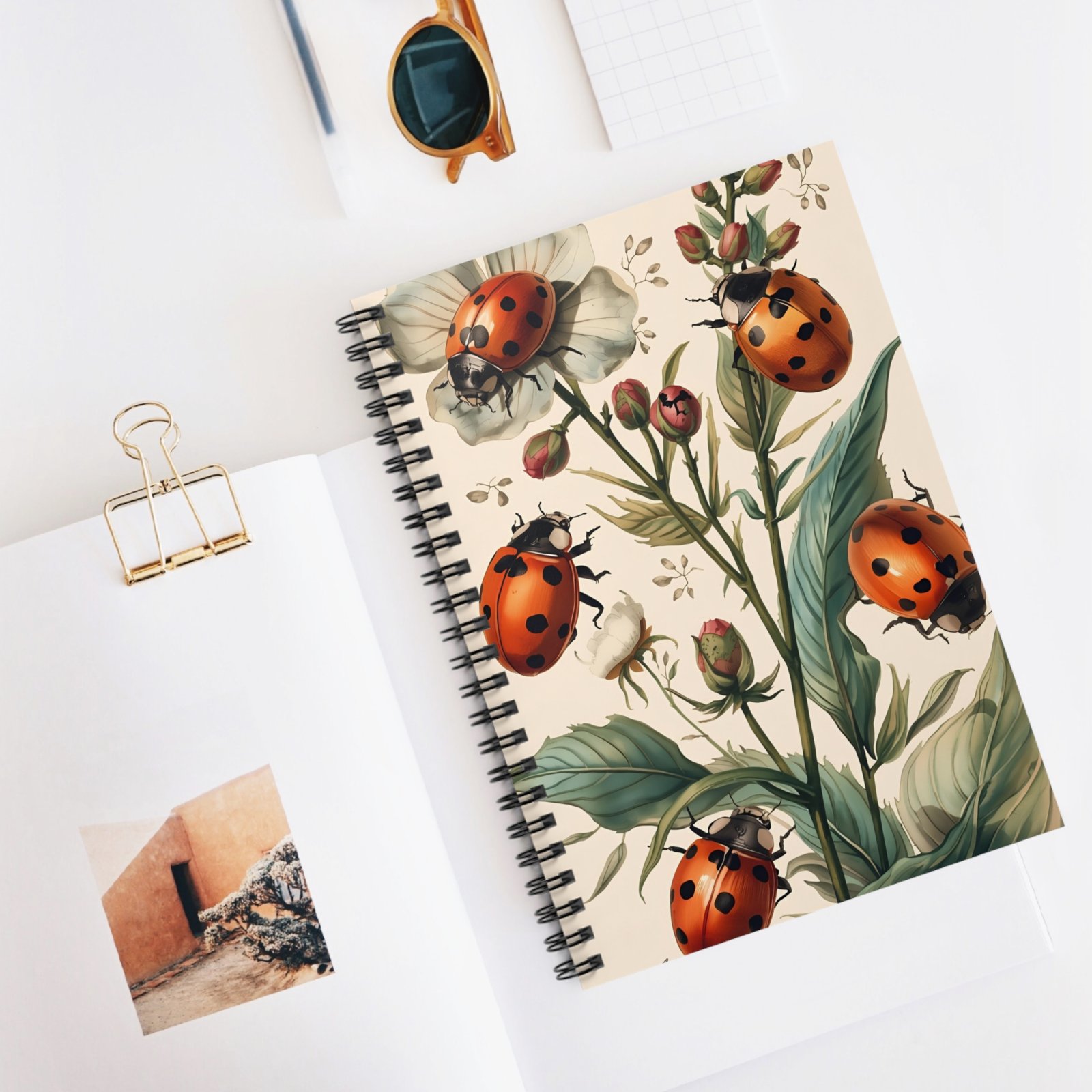 — Vintage Botanical Ruled Journal. This compact spiral notebook brings a little garden of wonder to everyday notes. The cover art—vintage-inspired ladybugs crawling across soft green foliage—invites slow, careful observation and makes simple lists feel thoughtful. Inside, the smooth ruled pages keep handwriting neat while the metal spiral lets the book lie flat as you sketch, journal, or map out plans. A slim document pocket on the inside back cover keeps receipts, tickets, or tiny mementos within easy reach. Carry it in a tote or keep it on your nightstand for quiet, focused moments of creativity.