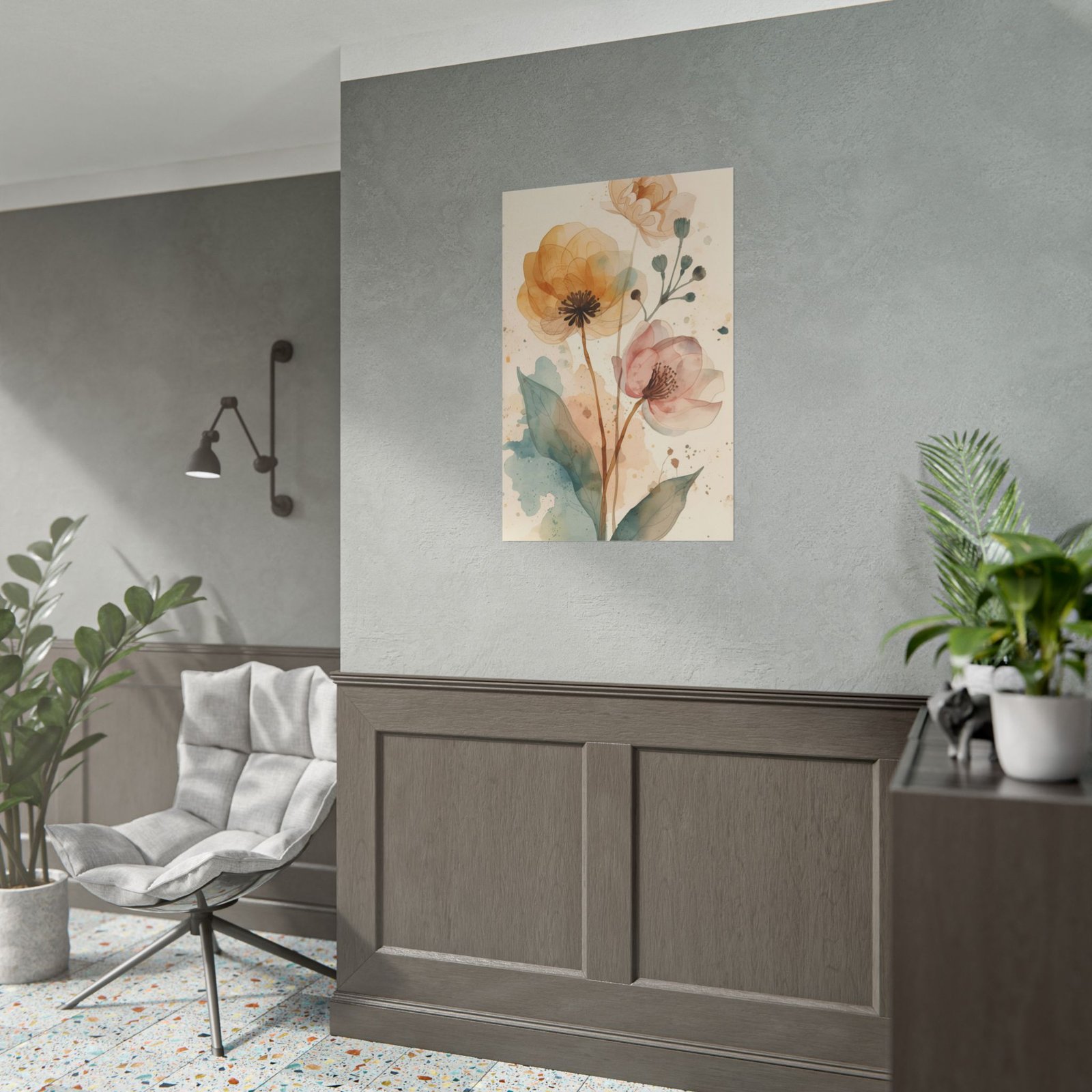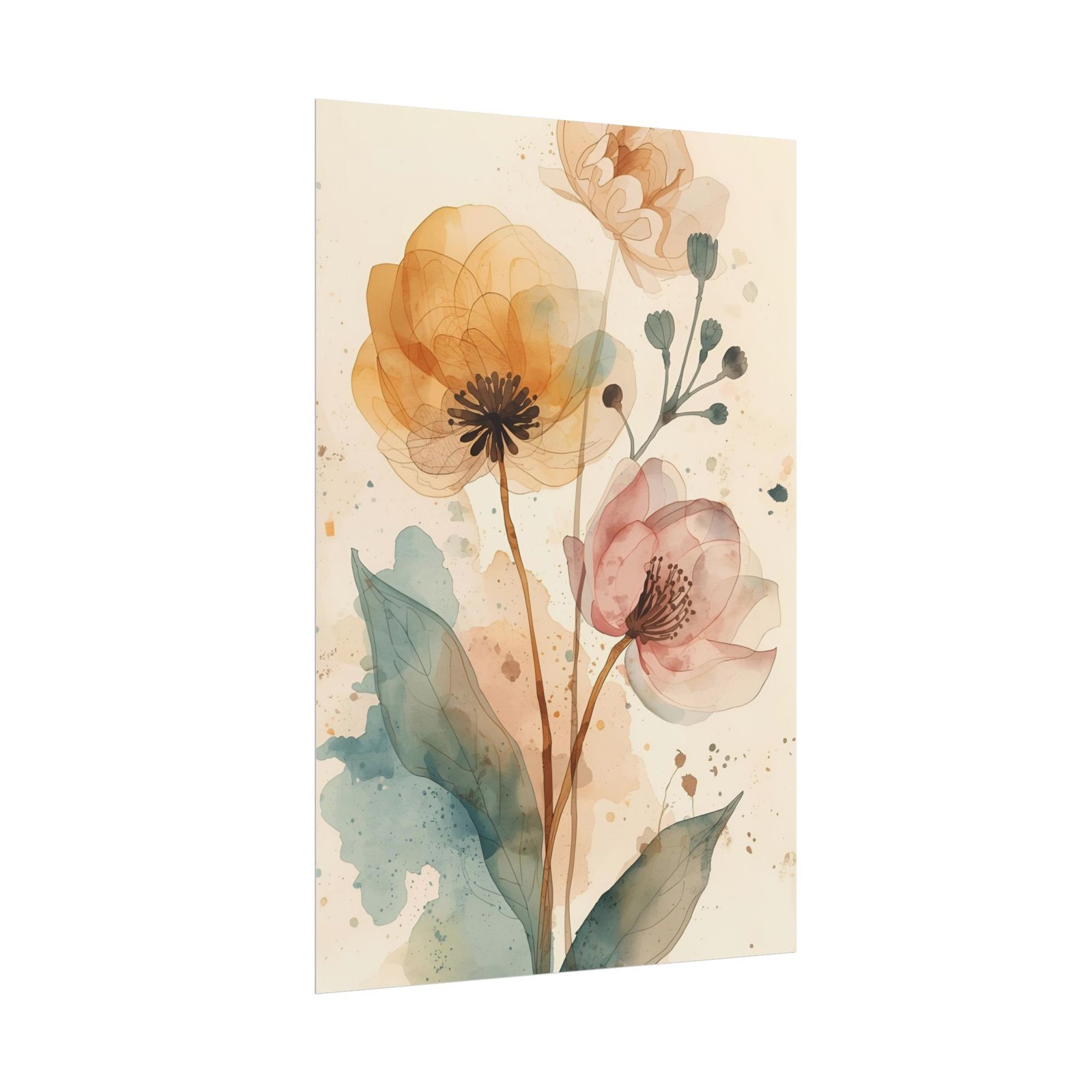 These rolled posters bring a soft, painterly touch to any room. Each print captures delicate watercolor florals with warm ochres, blush pinks, and muted teal leaves—colors that feel lived-in and soothing. Choose from three paper types to match your space: a textured fine-art stock for a classic gallery look, a semi-glossy photo paper for vivid color and crisp detail, or a matte option for a softer, low-sheen finish. Available in multiple sizes and orientations so the composition fits your wall, shelf, or frame. Arrives rolled for safe shipping and easy framing—an understated way to layer calm, botanical charm into everyday spaces.