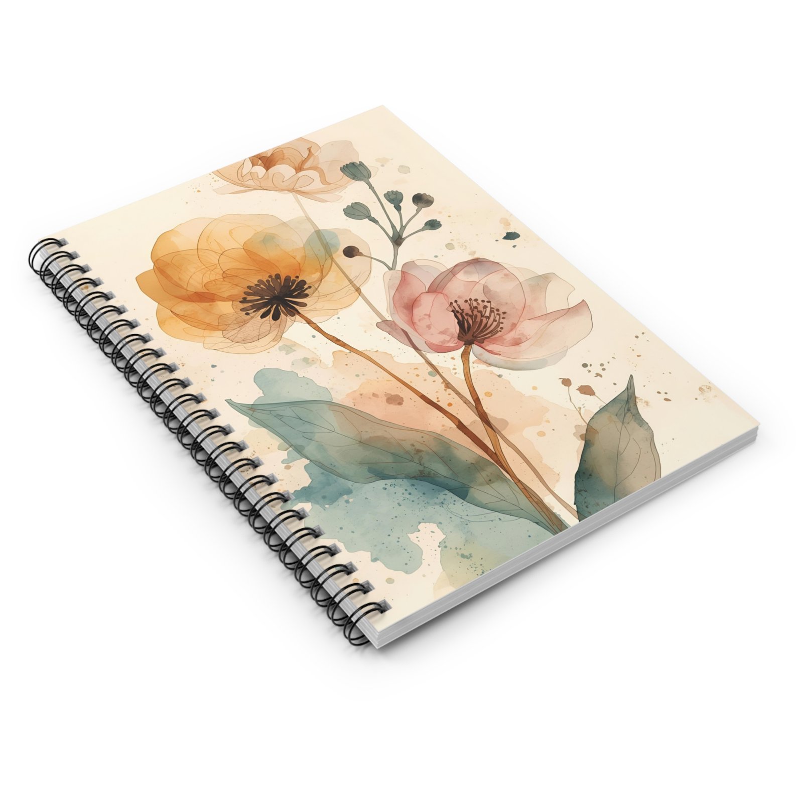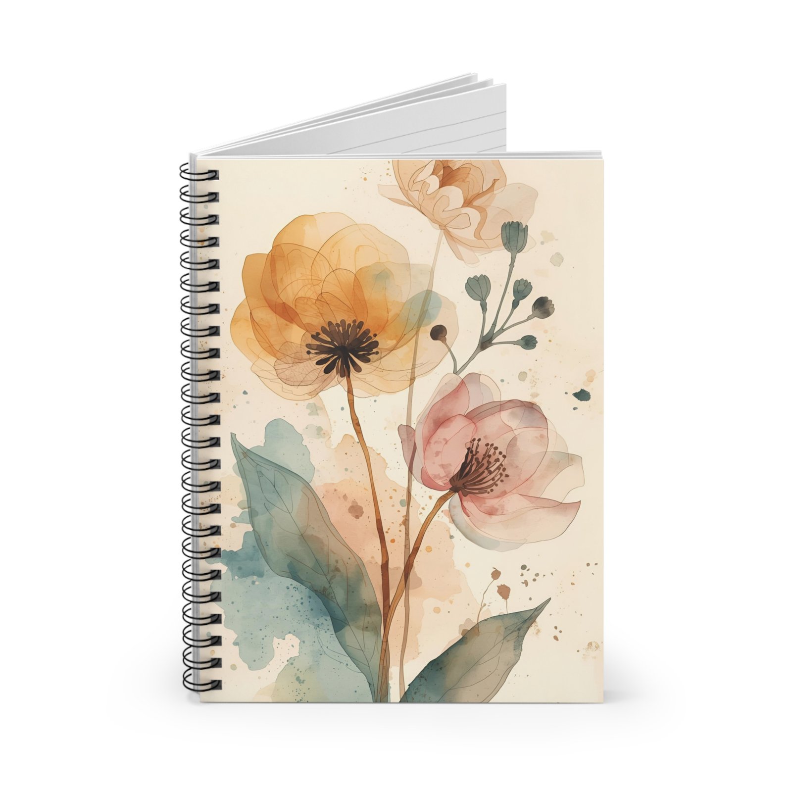 — Ruled Lined Journal for Notes & Sketches. Soft watercolor blooms drift across the front cover, inviting quiet moments of thought and gentle creativity. This spiral notebook feels light in your hands and steady on the page — ruled lines guide your thoughts while generous 90 gsm paper keeps ink from bleeding through. The metal spiral lays flat for easy writing and clean page removal, and the inner document pocket keeps loose notes or mementos tucked safely away. At 6″ x 8″, it slips into a tote or backpack and becomes a companion for journaling, sketching ideas, or keeping lists during slow mornings and busy days.