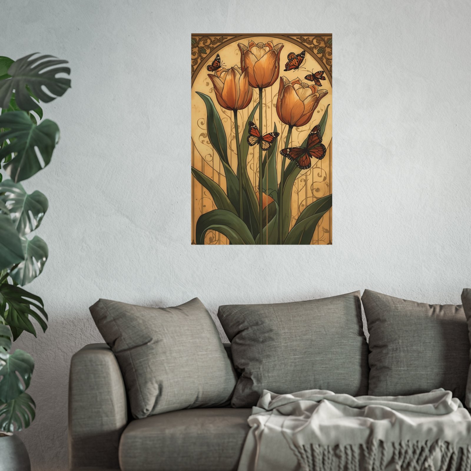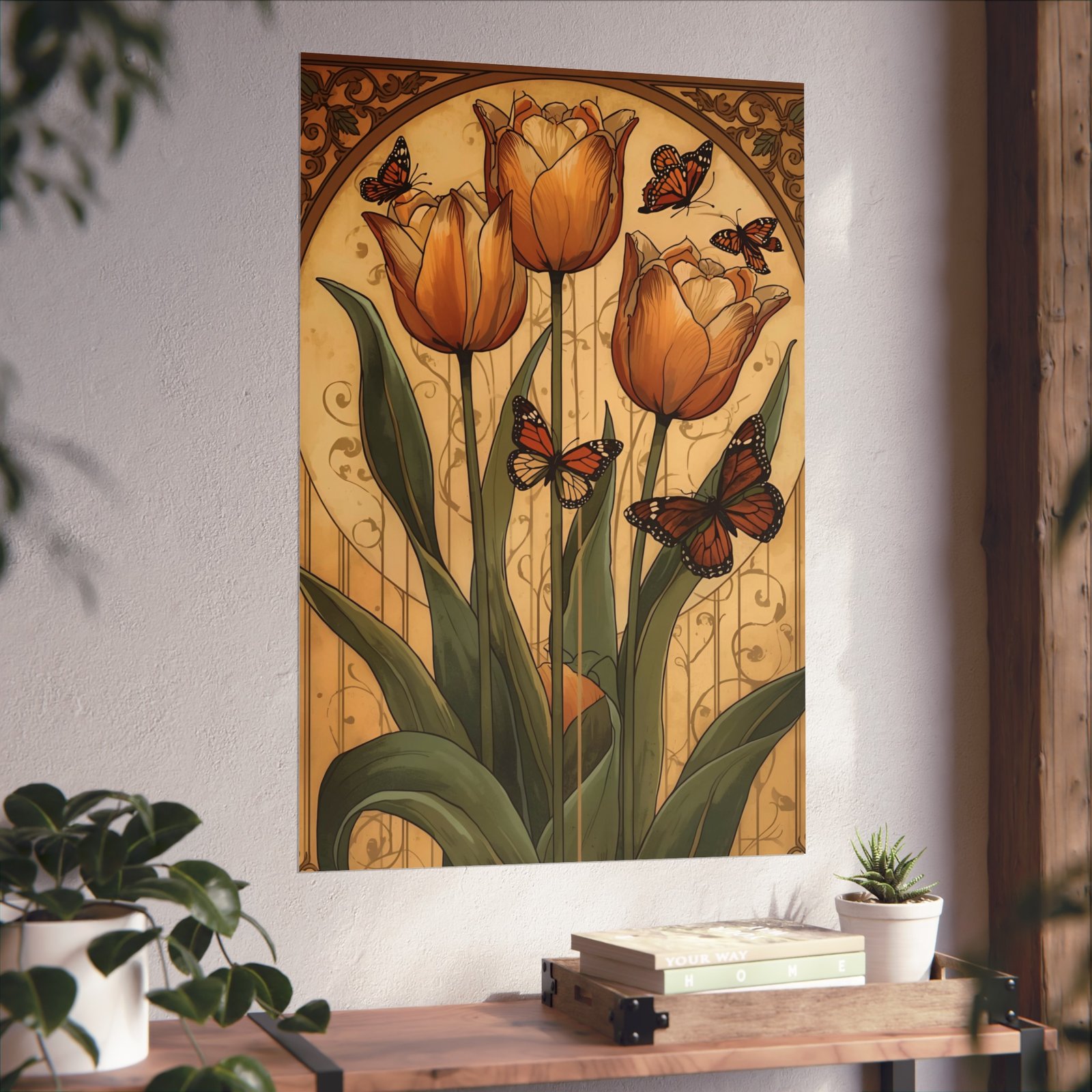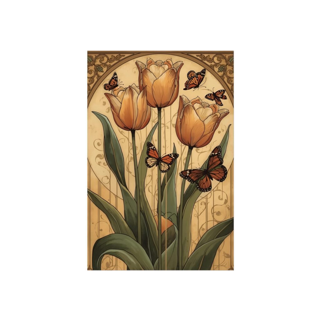 Warm, vintage-inspired art that brings a quiet moment of spring into your home. Soft ochre tulips reach up from lush green leaves while monarchs drift among filigree arches — a composition that feels both nostalgic and serenely hopeful. Printed on gallery-grade 220 gsm fine art paper with giclée-quality, REACH-certified inks, the matte surface holds rich, painterly detail without glare. Choose from multiple orientations and sizes to tuck this piece into a cozy reading nook, an entryway vignette, or a sunlit wall where it can age gracefully alongside your collection.