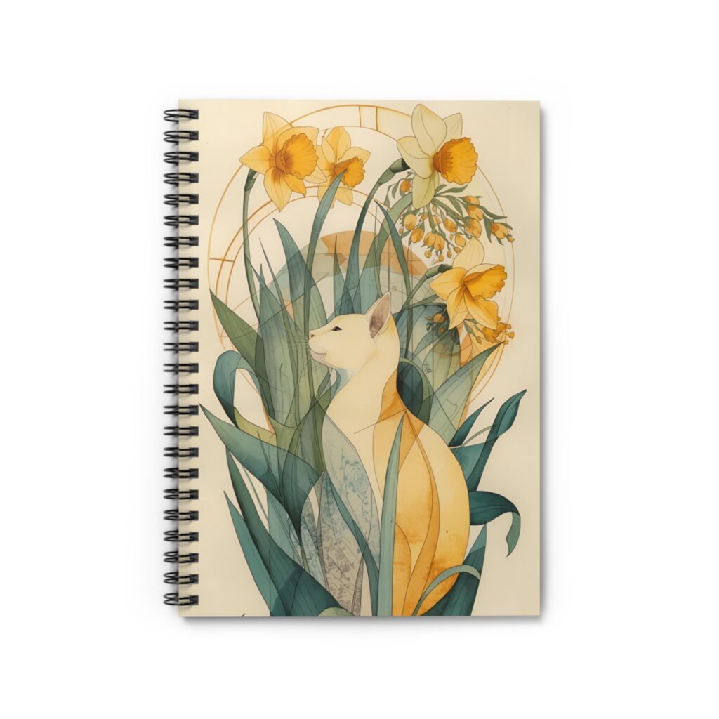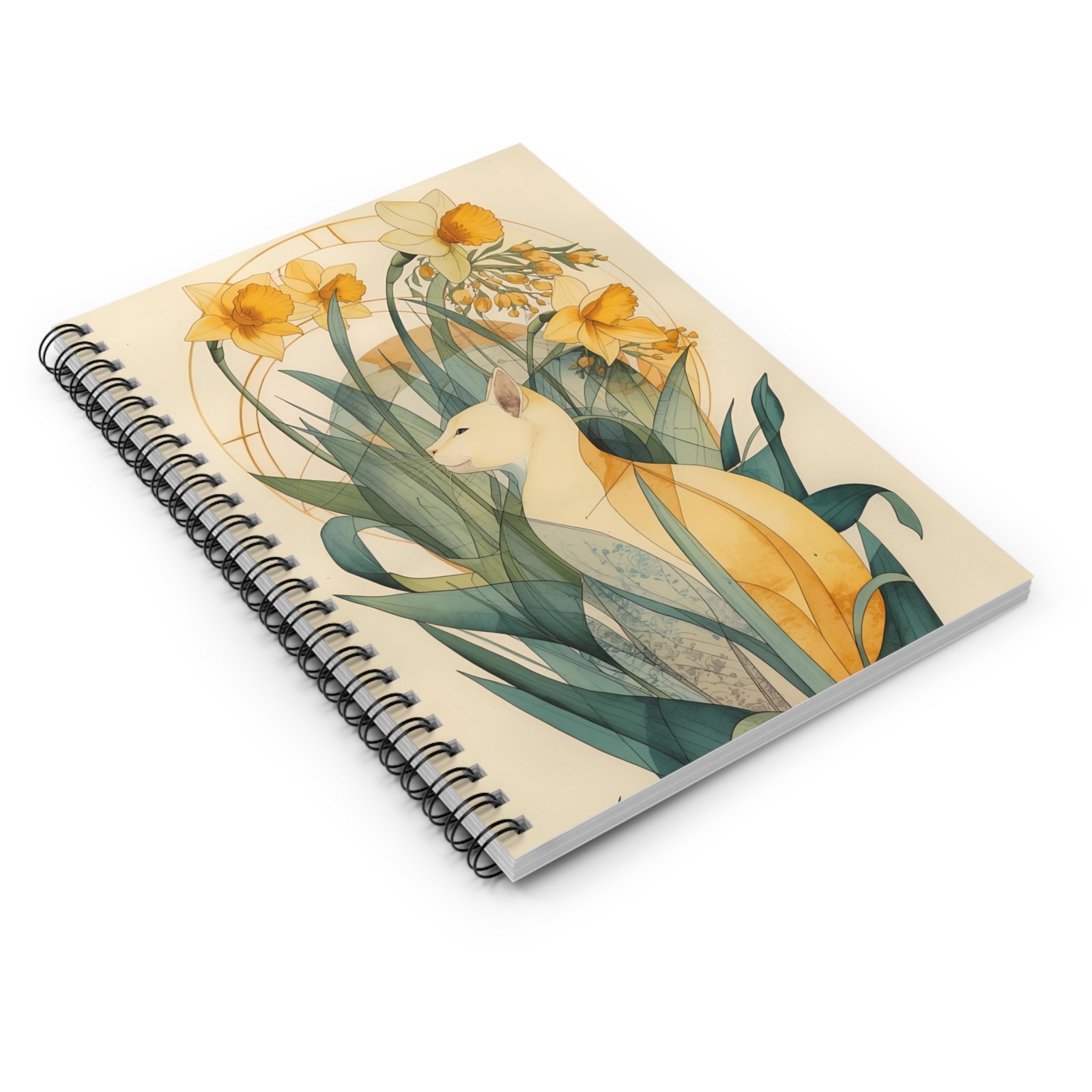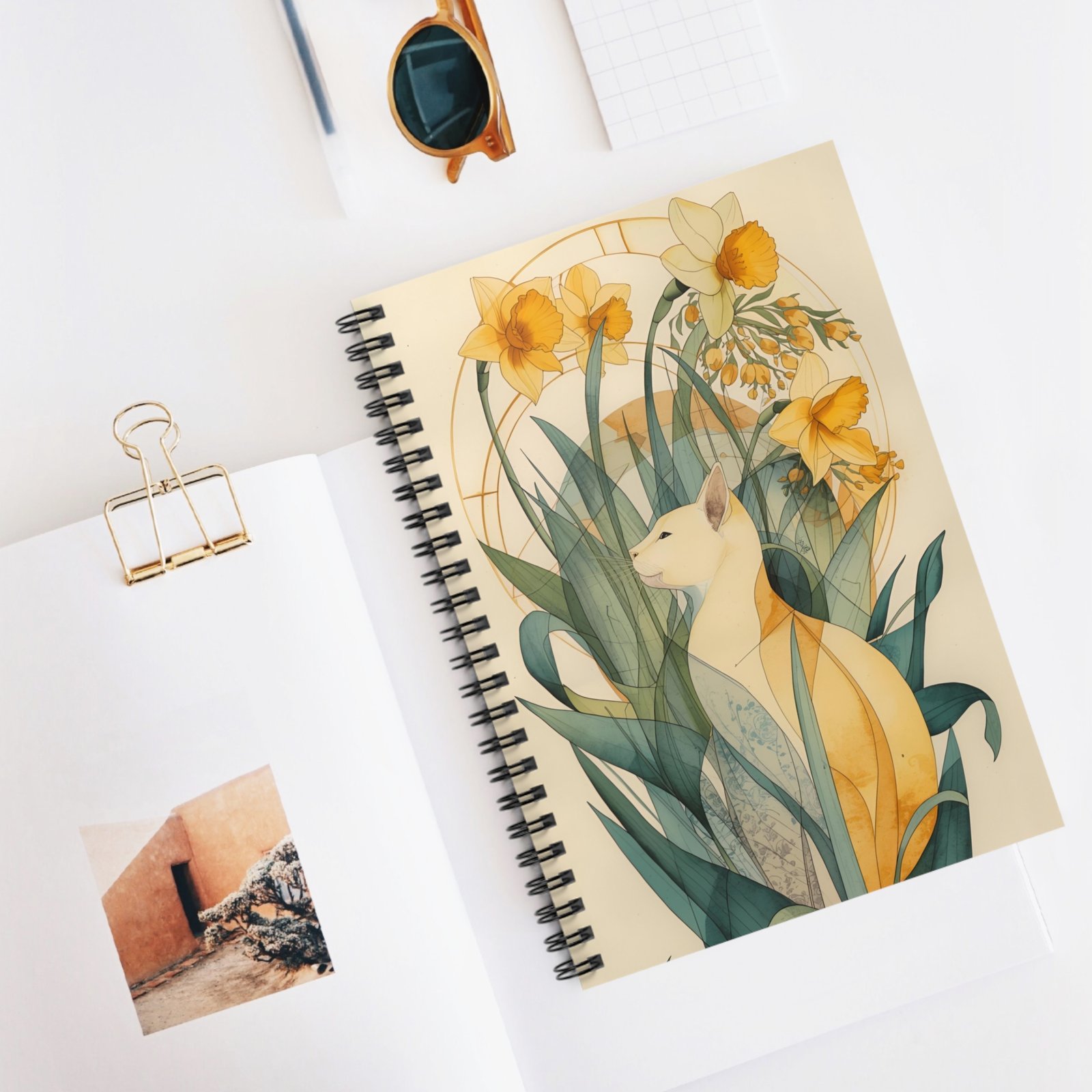— Ruled Journal with Floral Illustration. A pocket-friendly spiral notebook with a warm, botanical illustration on the cover — a quiet companion for everyday thoughts. The ruled pages invite neat notes, lists, and sketches while the metal spiral lets the book lay flat or fold back for easy writing. A slim inner document pocket keeps loose receipts, ticket stubs, or small mementos tucked safely. The muted yellow and green palette feels like a sunlit morning among daffodils, lending a calm, contemplative mood to journaling, study sessions, or creative planning.