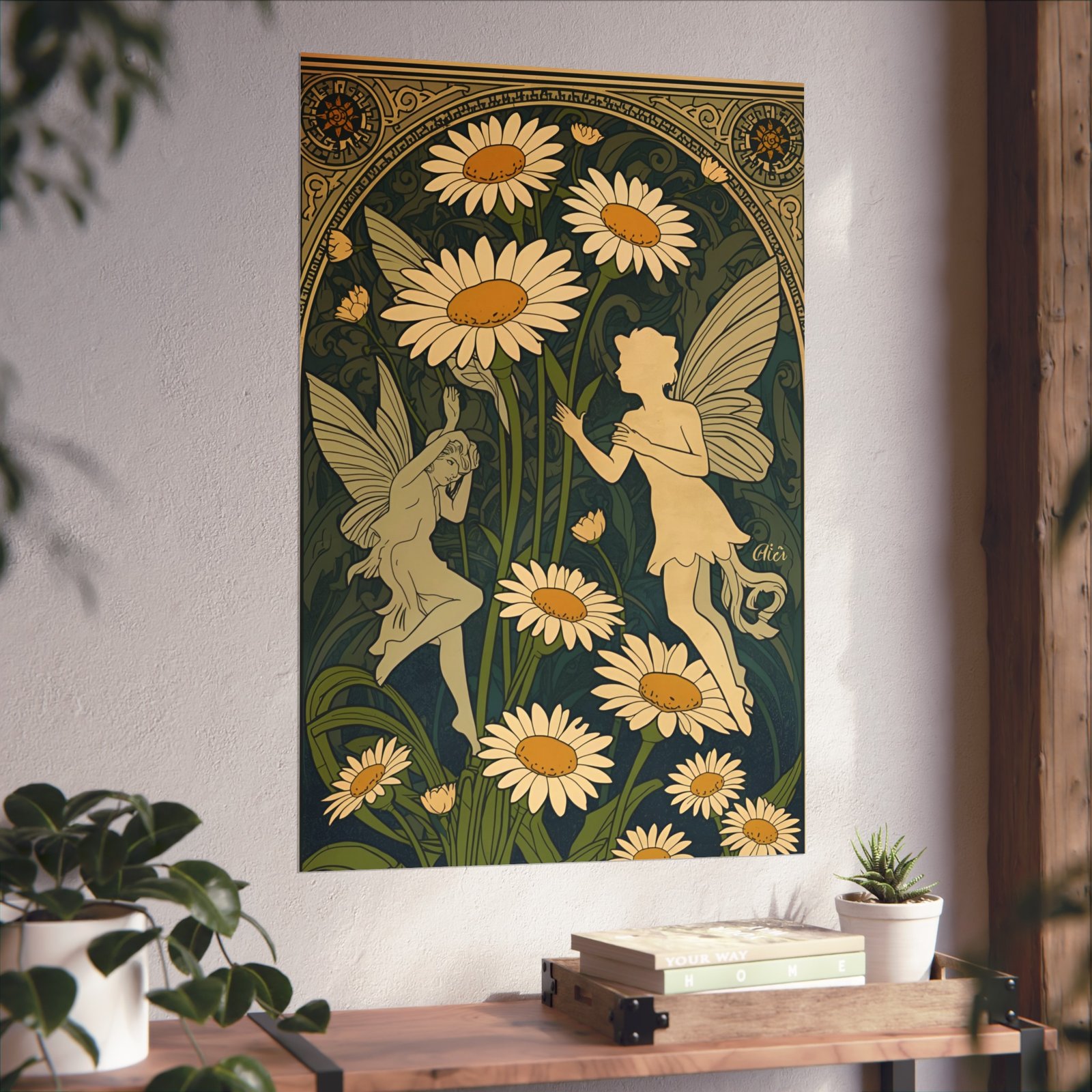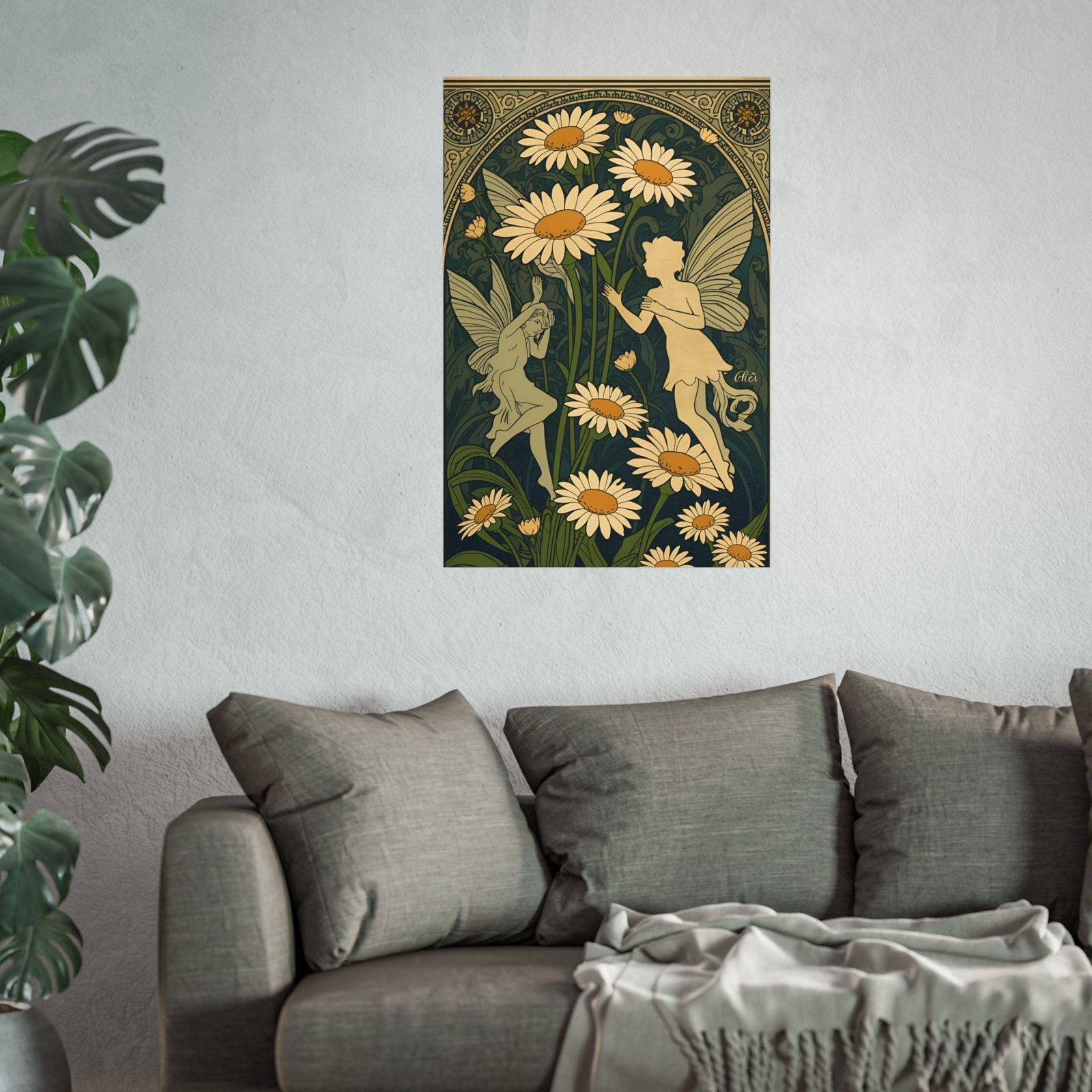 A vintage-inspired fine art poster that brings a quiet, enchanted garden into your home. Soft daisies and delicate fairies are rendered with giclée clarity on gallery-grade 220 gsm paper, finished in a smooth matte that reduces glare and highlights the art’s subtle, earthy palette. The composition reads like an old storybook page — nostalgic, gentle, and slightly whimsical — and it settles beautifully above a couch, in a reading nook, or as part of a curated gallery wall. Each print is produced using REACH-certified inks on EUTR-compliant materials sourced from the UK, so it looks and feels like a collectible piece while meeting high production standards.