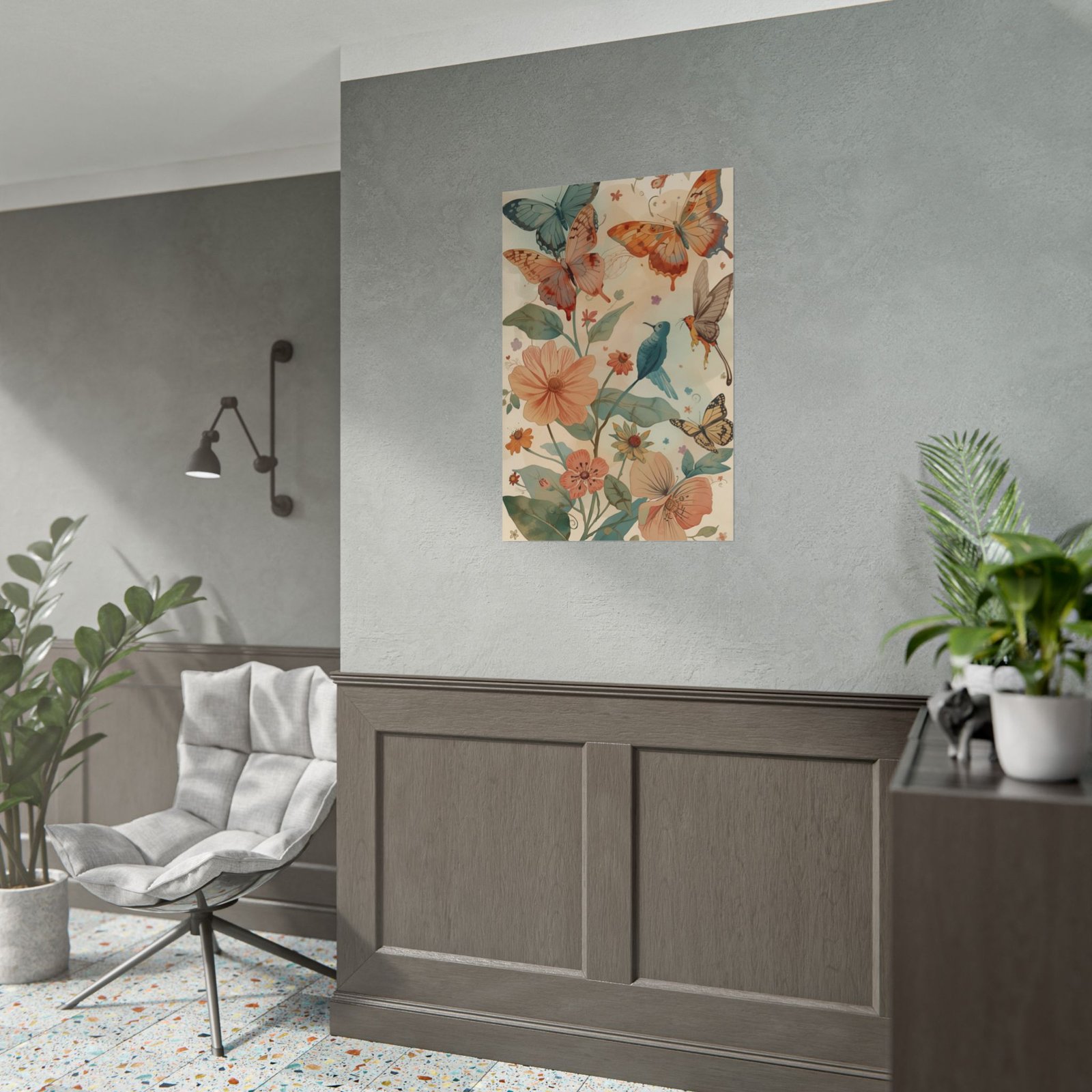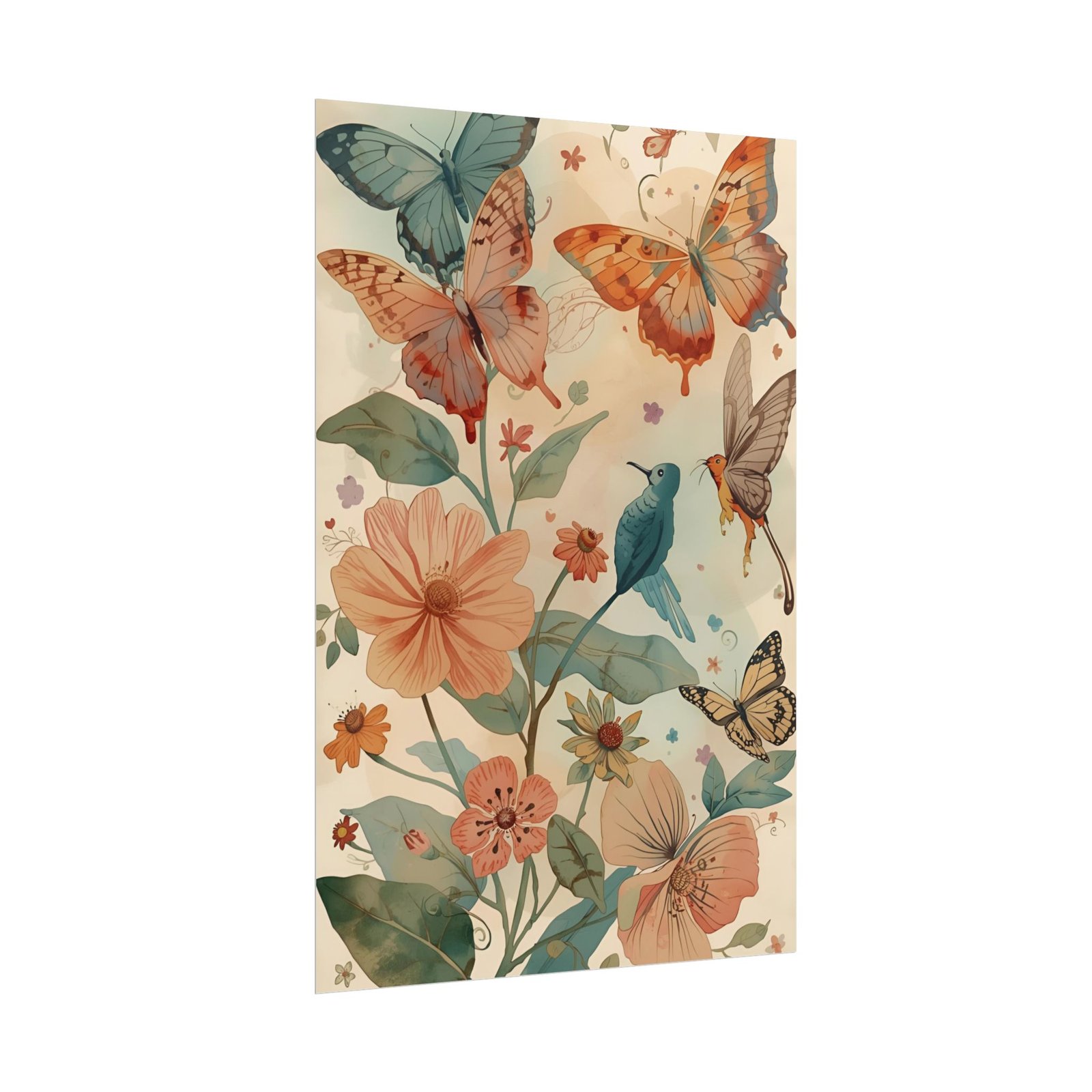 Bring a slow, sunlit afternoon into your space with this rolled art poster. Soft peaches, vintage teals, and gentle creams form a meadow of blossoms where butterflies and a small songbird drift among petals. The design reads like a page from a well-loved nature journal — warm, quiet, and thoughtfully detailed. Hang it in a reading nook, over a dressing table, or layered in a gallery wall to add an approachable, botanical touch that feels handcrafted and calm.