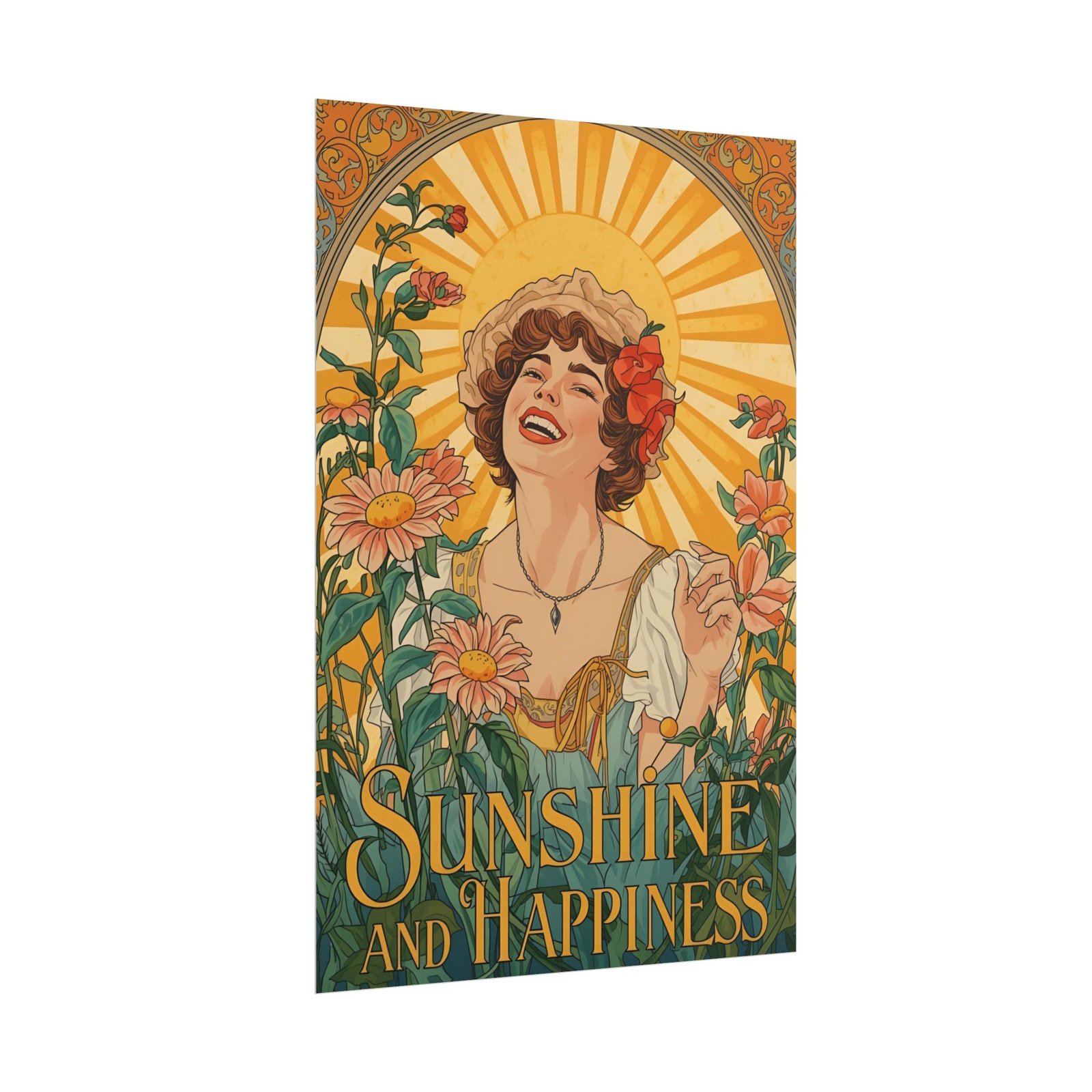 This rolled poster brings a warm, vintage cheer to any wall. Sun-drenched rays frame a joyful figure among blooming daisies and climbing vines, rendered in rich giclée color that keeps the palette bold and luminous. Choose a textured fine art paper for a painterly, archival finish, or go semi-glossy or matte for bright photographic clarity or a softer, low-reflective look.