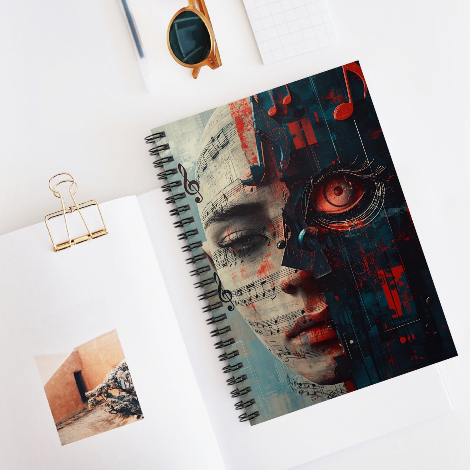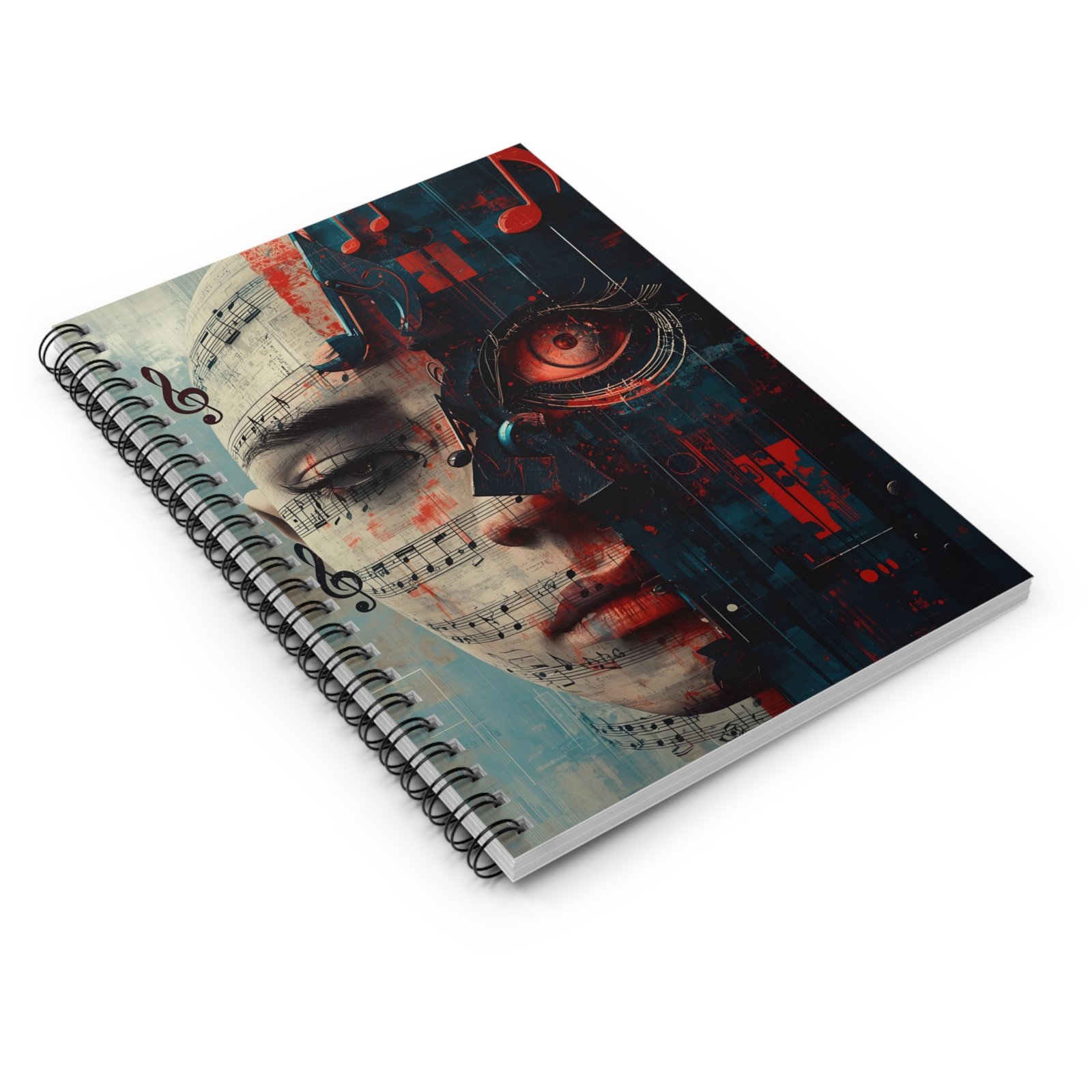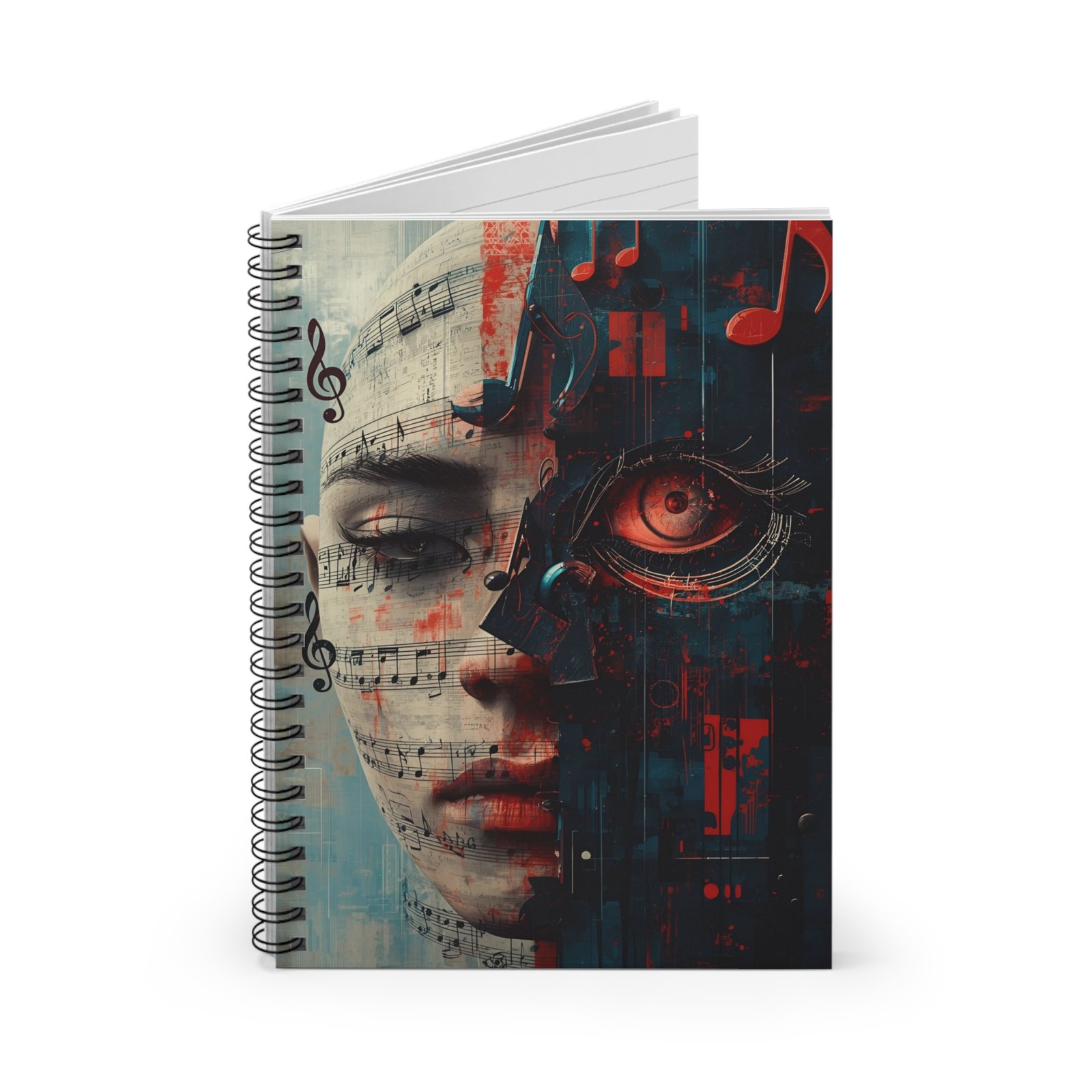 — Artistic Synthwave Journal for Musicians & Creatives. This ruled spiral notebook brings together music and machine in a single, striking design. The front cover shows half a human face overlaid with sheet music and the other half transformed into a mechanical, neon-lit eye — a quiet clash of emotion and circuitry. It’s the kind of notebook you reach for when you want to sketch a melody, lay down lyrics, map an arrangement, or journal late-night ideas. The metal spiral lies flat so your writing flows uninterrupted. A tucked document pocket at the back keeps loose drafts, set lists, or lyric scraps safe. Compact and tactile, this notebook feels like a personal studio — intimate, focused, and a little bit futuristic.