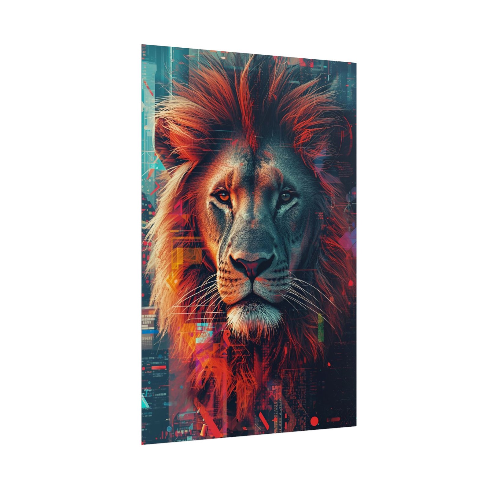 A bold, gallery-ready poster that brings presence and color into any room. The striking lion portrait blends photoreal detail with vibrant, painterly accents — warm ambers and cool teals collide around a calm, commanding stare. Hang it above a desk, beside a reading chair, or in a studio to anchor the space with confident energy. Choose textured fine art paper for a tactile, museum-like finish; pick semi-glossy for punchy, sharp color; or go matte for a softer, artful look. Available in multiple sizes and orientations to fit a wide range of frames and walls.