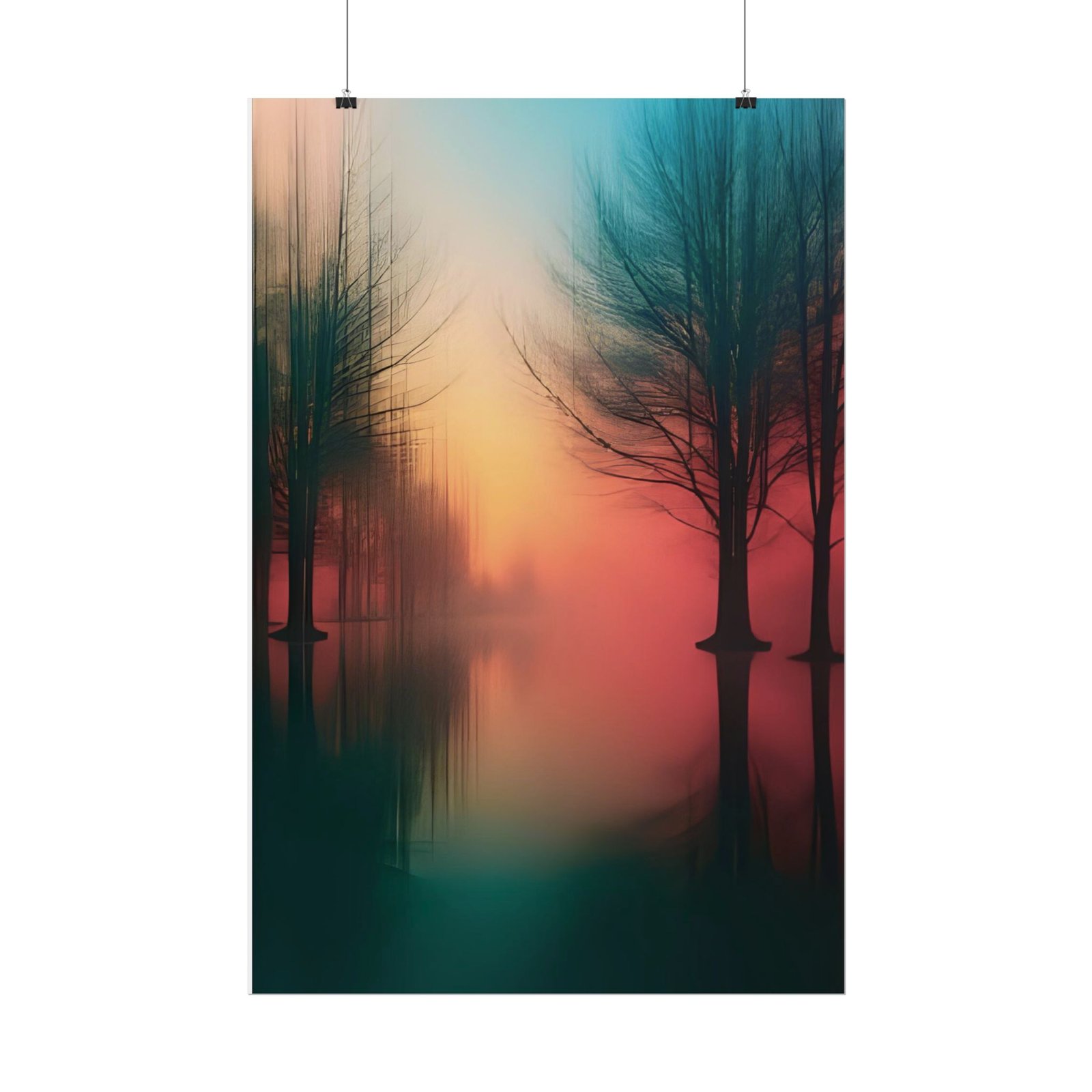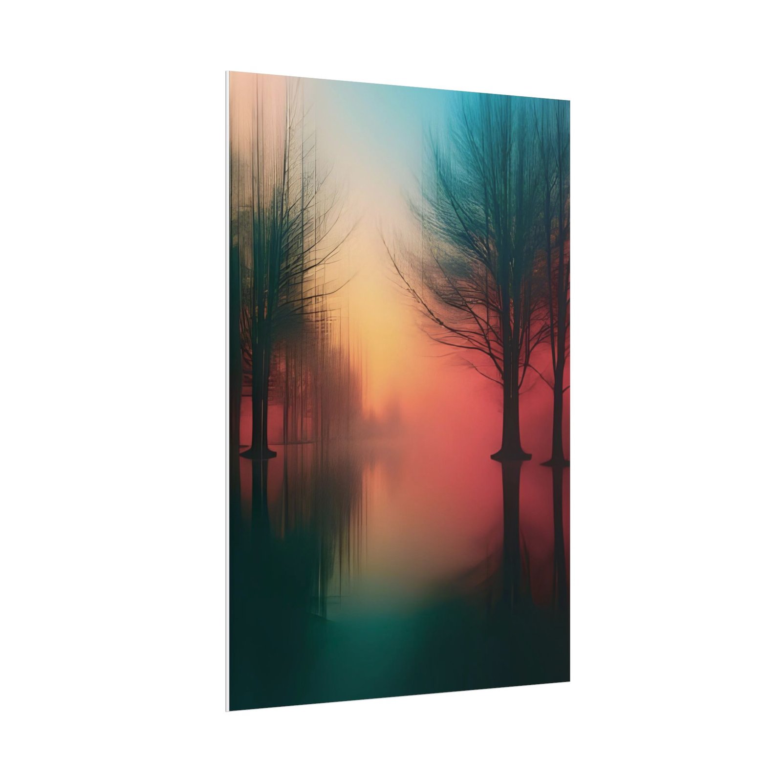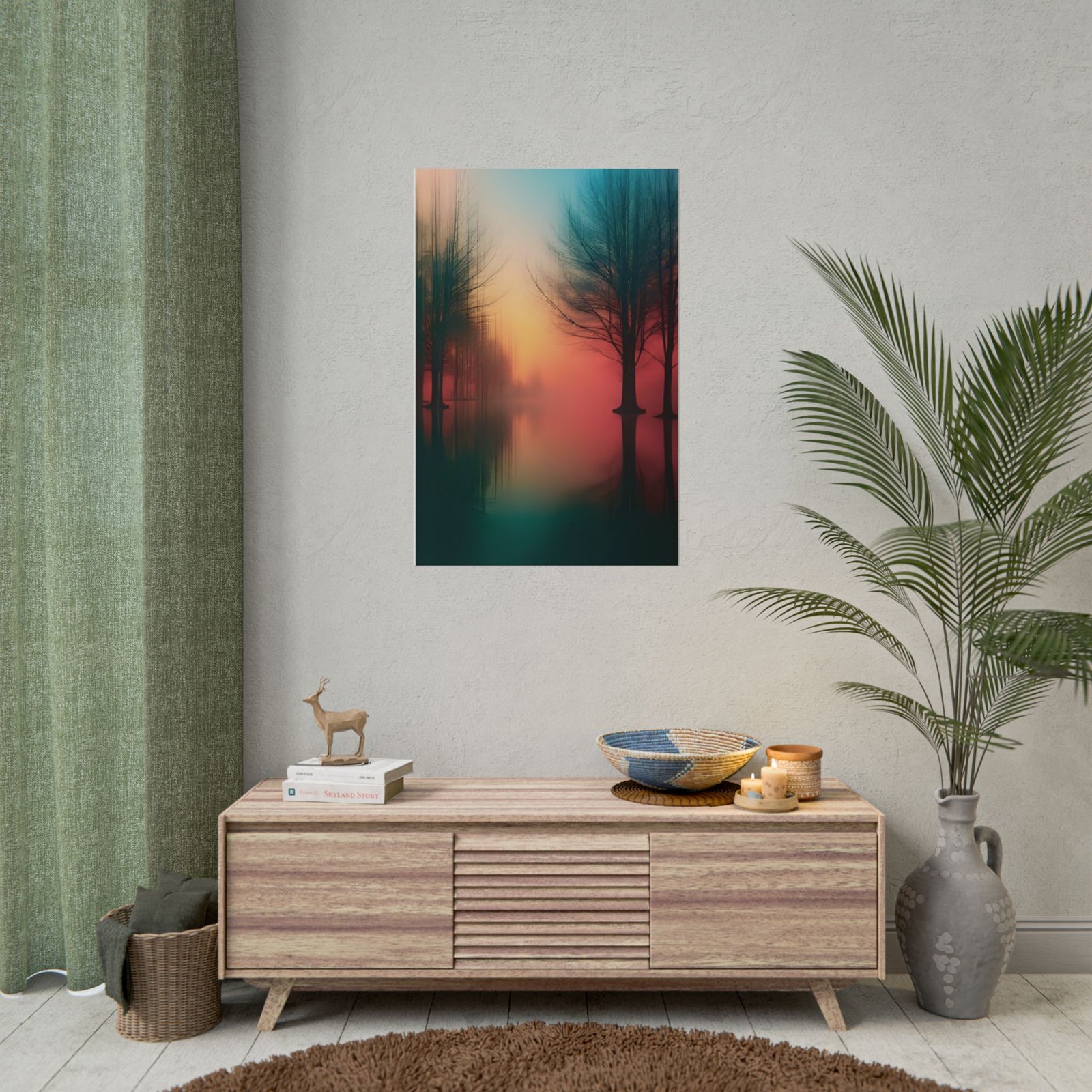 A dreamy art print that captures a misty twilight lake where slender trees rise from glassy water and colors bleed from teal to coral. The image feels like a quiet pause between day and night — warm light at the horizon, cool reflections below, and soft edges that invite long looks. Printed with archival giclée inks on your choice of fine art, semi-glossy, or matte paper, this poster brings a calm, contemplative mood to living rooms, studios, or bedrooms. Choose vertical or horizontal orientation and select the paper weight that fits your space: textured fine art for a tactile, museum-like presence; semi-glossy for vivid color and clarity; or matte for a subtle, painterly finish. Sized to fit common frames and shipped rolled for safe, easy framing, this print settles into quiet interiors and creative corners alike.