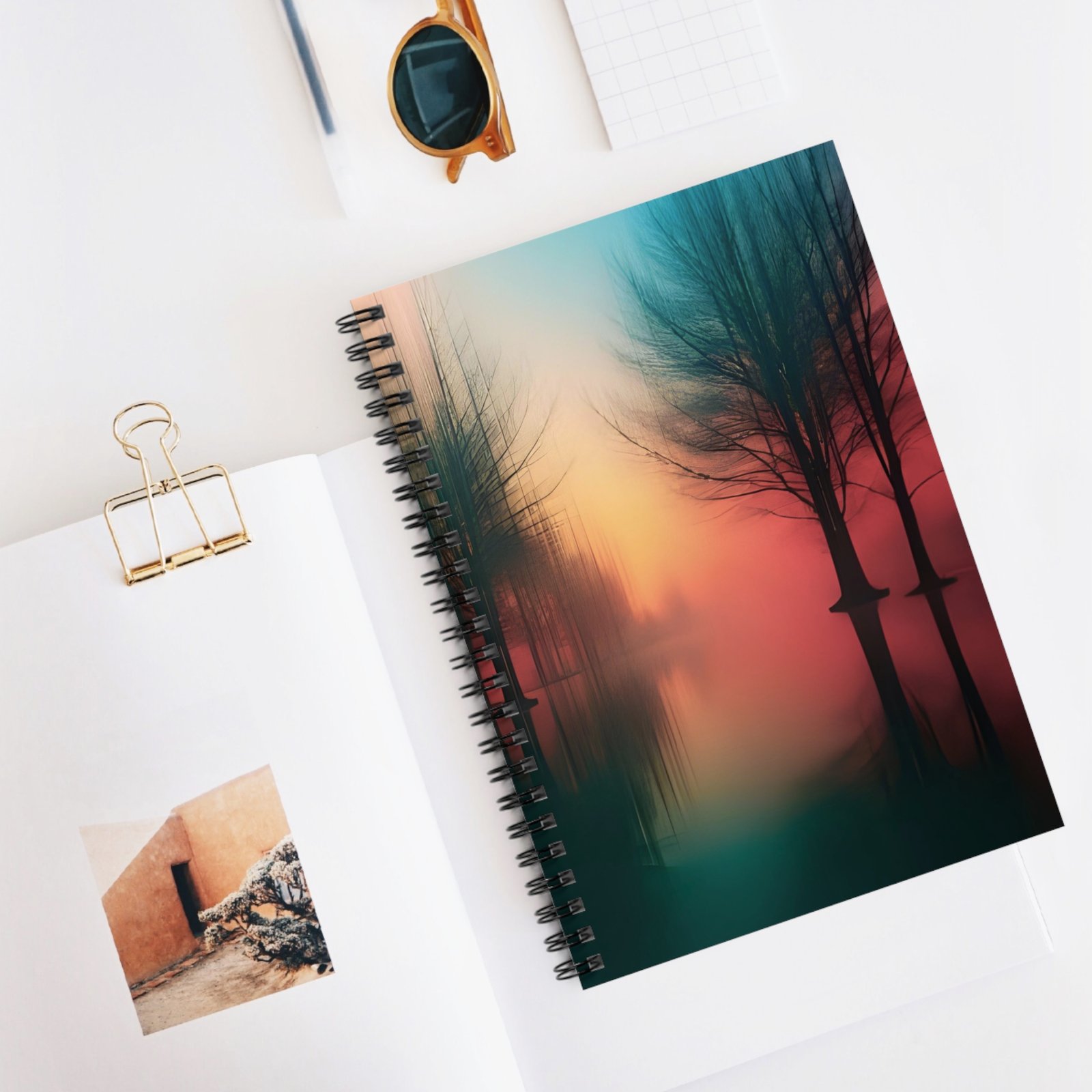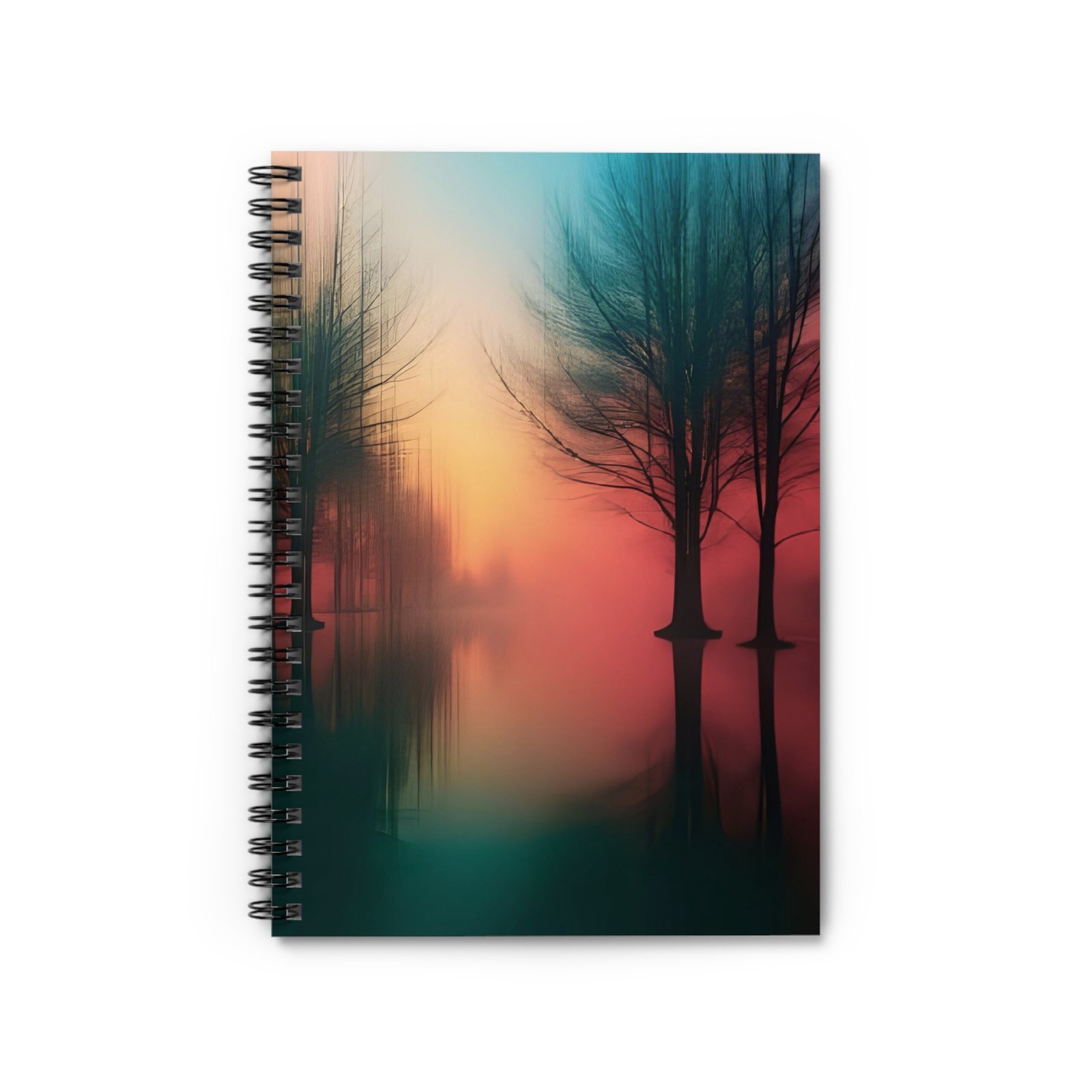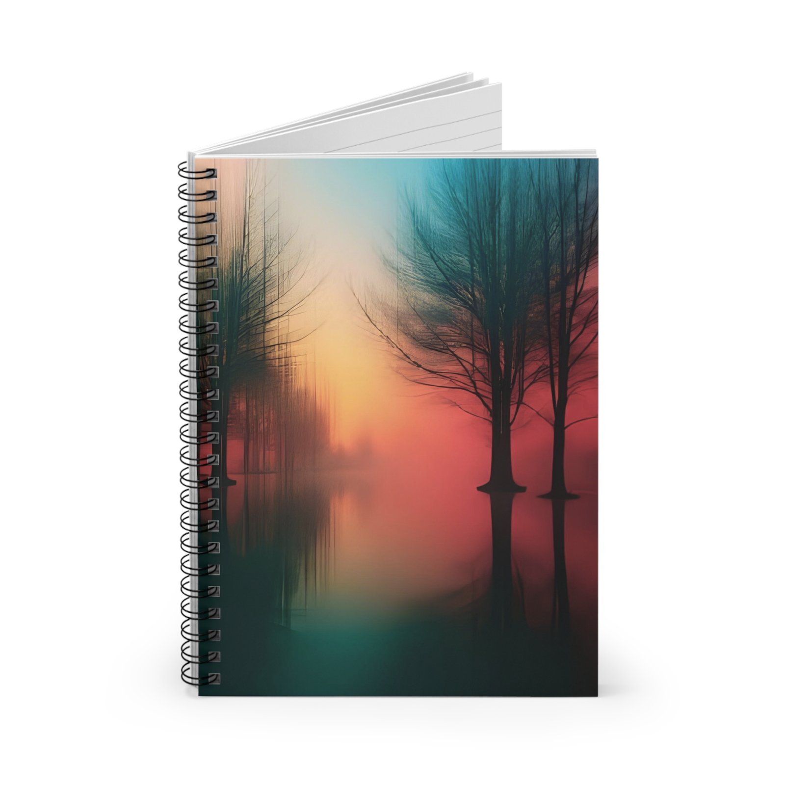 A spiral-bound ruled notebook that feels like a quiet moment by a foggy lake at sunrise. The soft, dreamlike cover art blends teal, coral, and amber into a calming scene that invites slow thoughts, lists, and sketches. Inside, smooth 90gsm lined pages take pen ink cleanly and keep handwriting neat. The sturdy 350gsm covers and metal spiral let the book lie flat for comfortable writing. A tucked document pocket behind the back cover holds notes, tickets, or loose pages, so everything that matters stays with the notebook. Sized to slip into a tote or backpack, it’s a daily companion for journaling, planning, and idea-capturing.