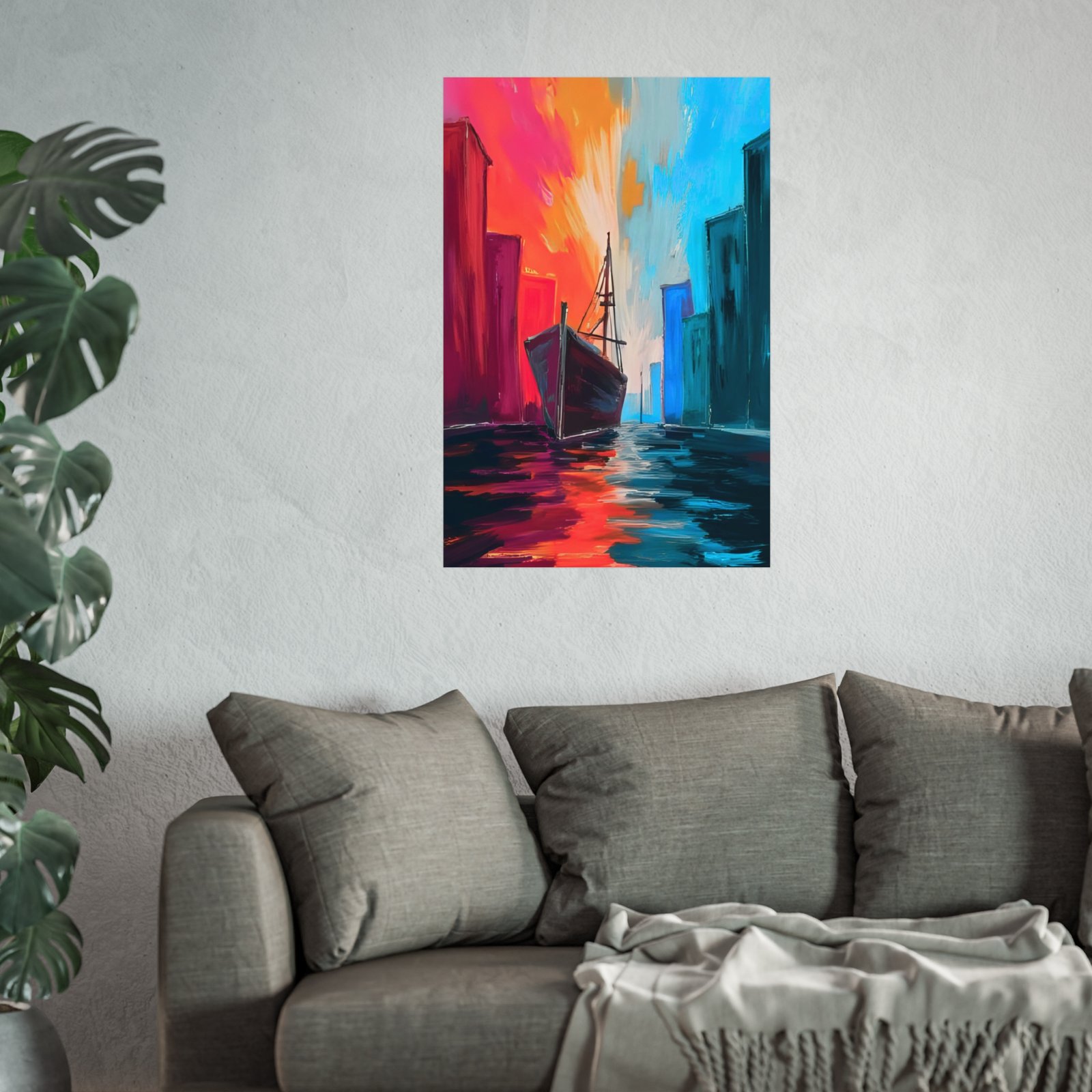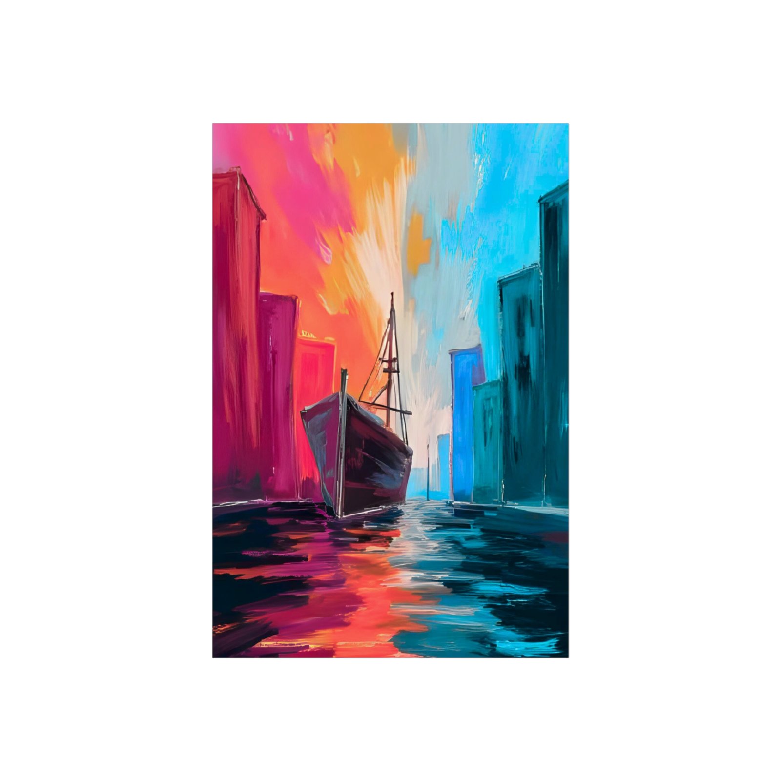 A vibrant giclée art poster that feels like a passage between two worlds. Bold, painterly strokes shape a lone boat moving through a city canal, where warm magentas and golds collide with cool teals and blues. The scene captures that bittersweet moment of transition — dusk slipping into night, a journey starting or ending. Hang it in a reading nook, beside a window, or above a low sofa to bring a cinematic splash of color and motion to calm, creative spaces. The matte surface keeps reflections low and the gallery-grade paper gives each brushstroke depth and texture, so the image reads like an original painting from across the room.