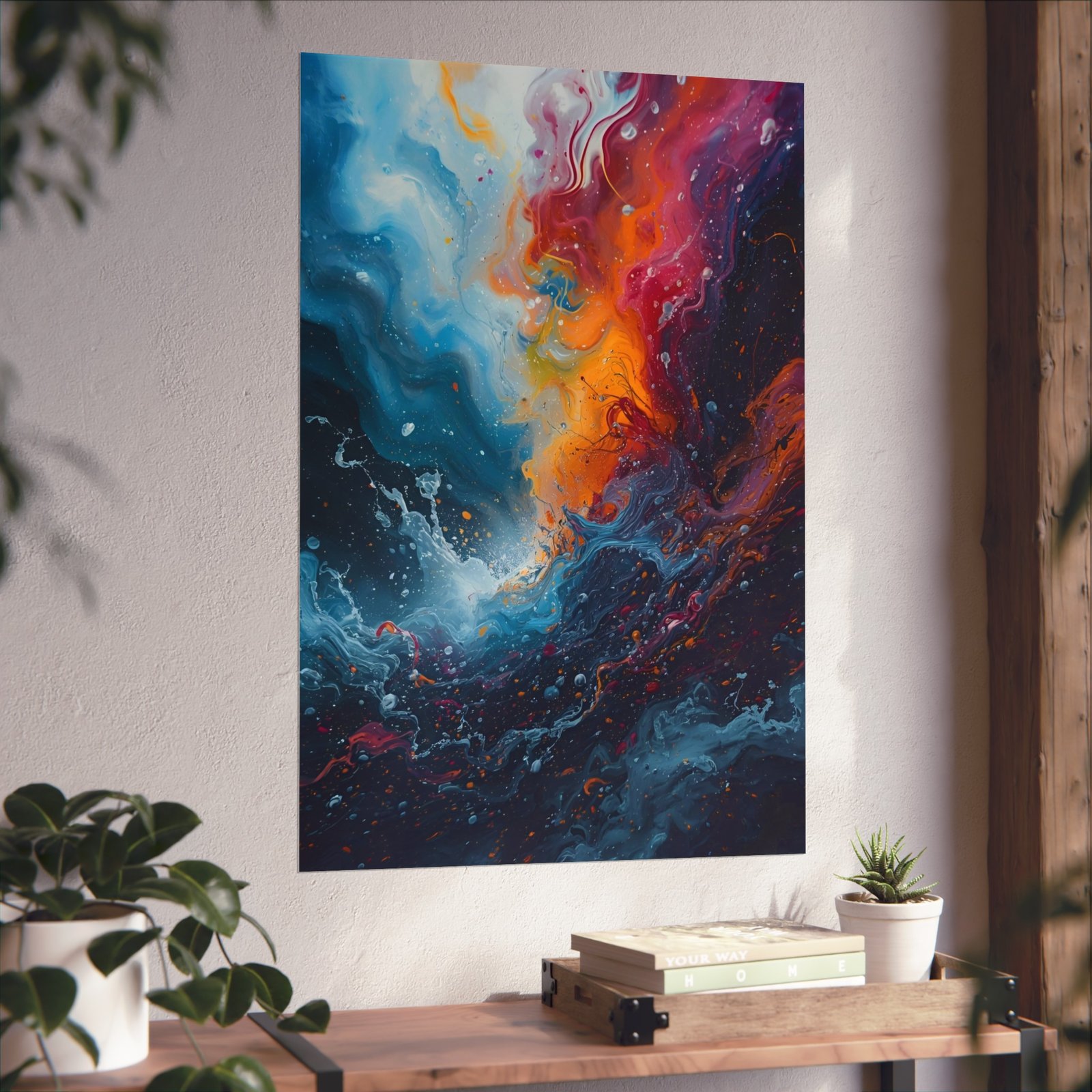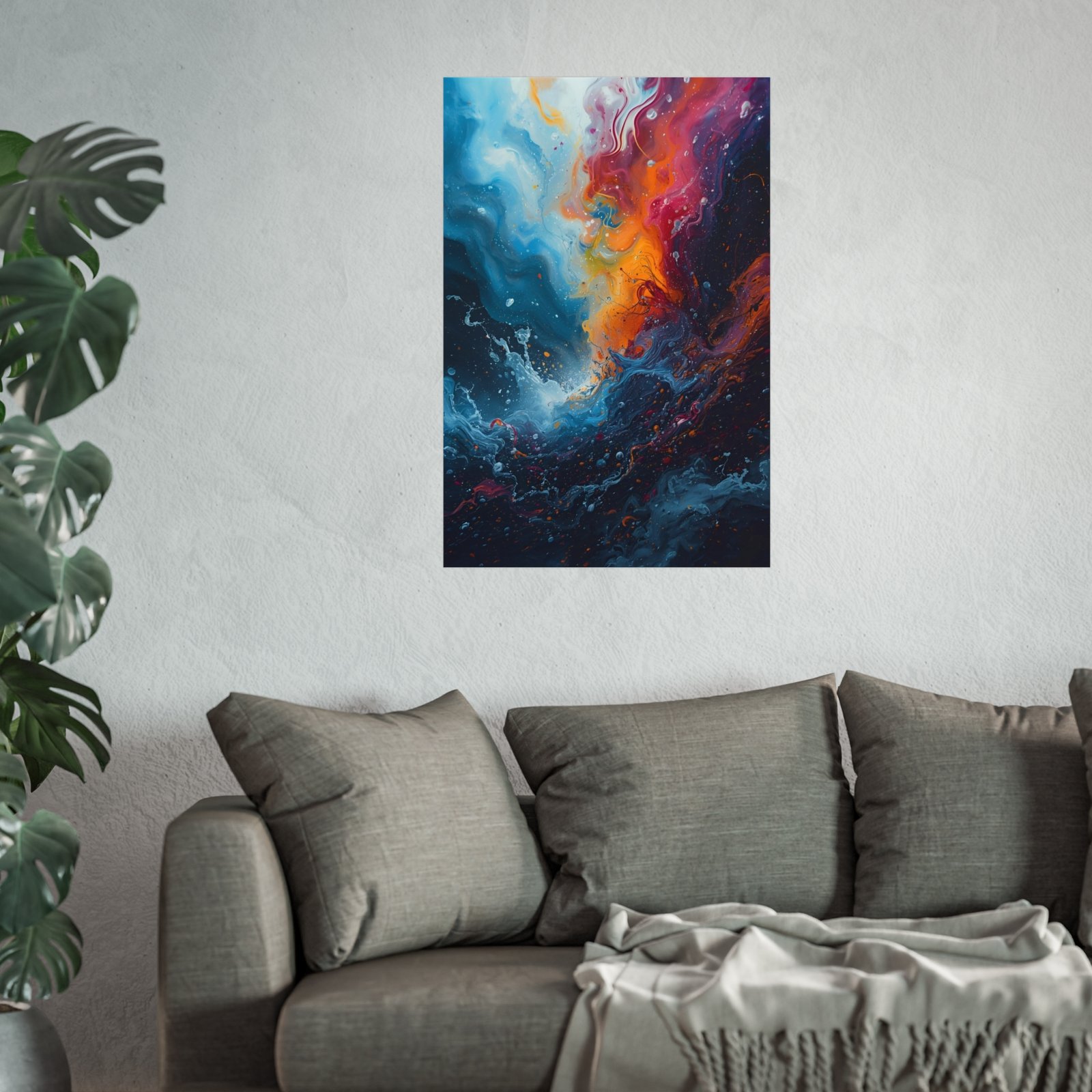 This fine art poster captures a storm of color — deep navy and teal currents crash into molten oranges and magentas, with delicate splatters that feel like distant stars. It hangs quietly bold on a living room or studio wall, turning a bare space into a place that invites pause and imagination. The smooth matte surface keeps glare low and lets the giclée detail sing: brushlike flows, subtle texture, and saturated pigment hold their breath and draw the eye inward. Choose a horizontal, vertical, or square format to fit a gallery wall, a reading nook, or a creative workspace. Printed on gallery-grade 220 gsm, acid-free paper with REACH-certified inks and responsibly sourced materials, this poster brings a tactile, archival quality to contemporary interiors.