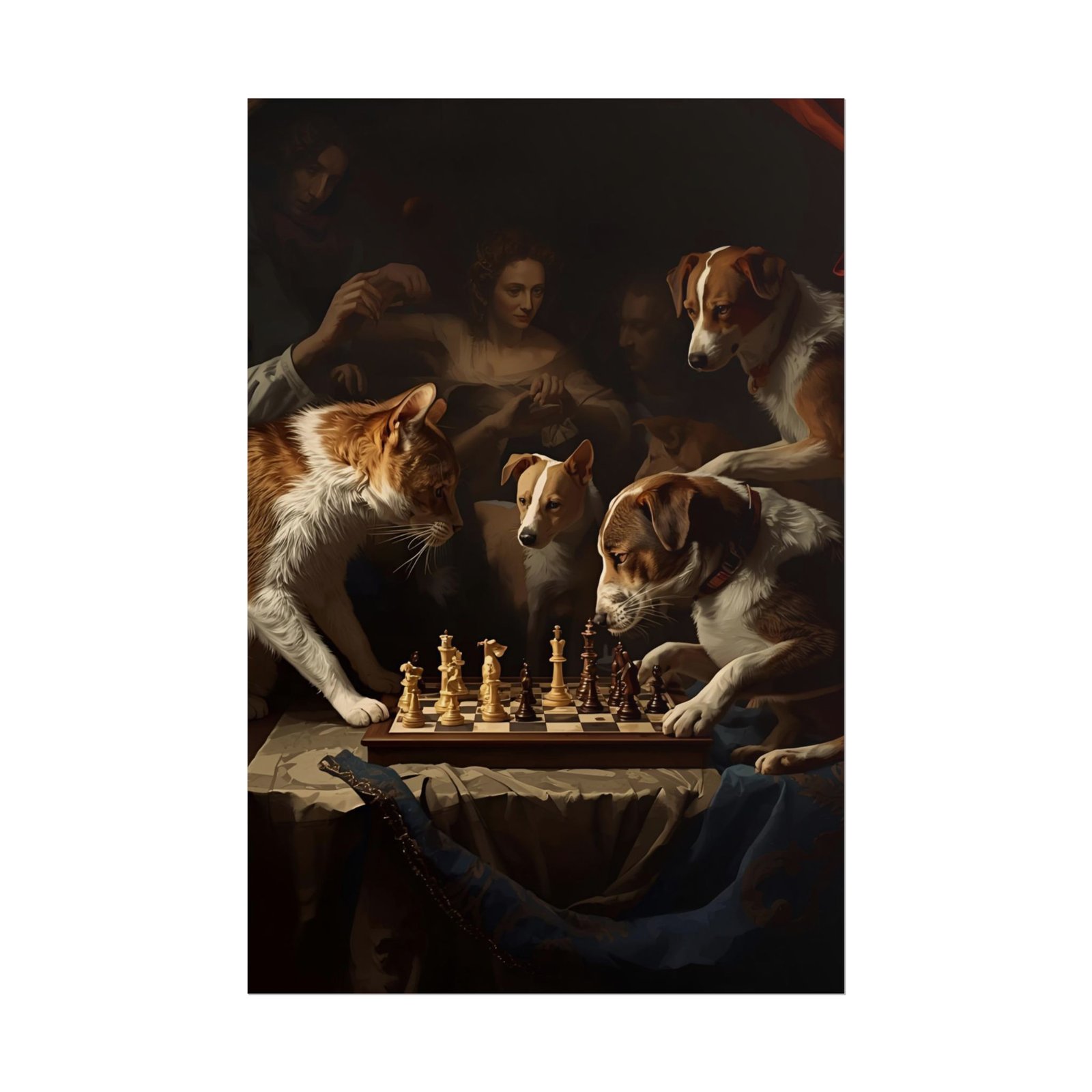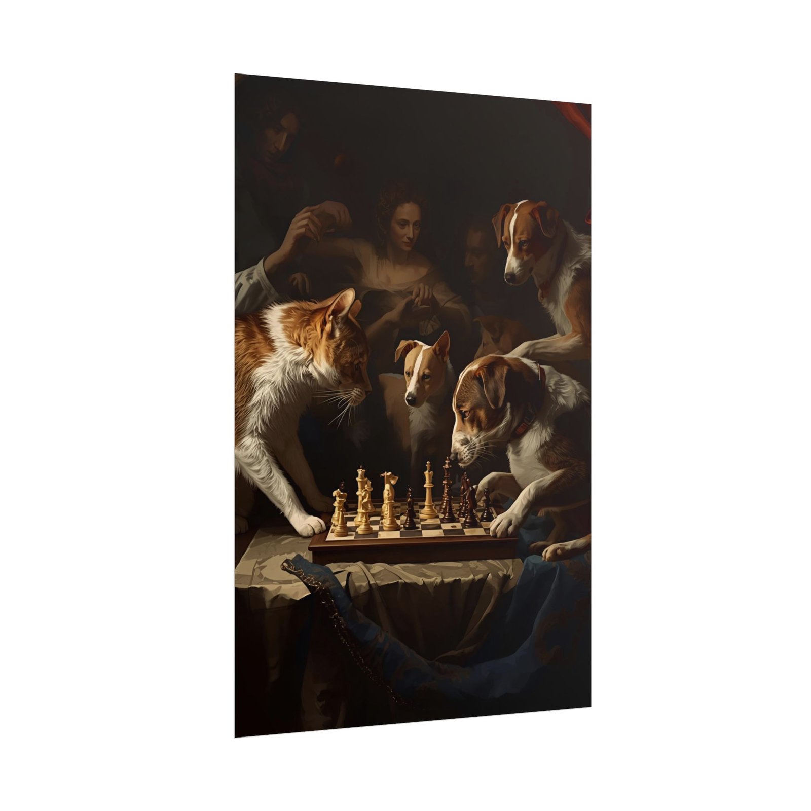 These rolled posters bring Baroque drama and quiet humor into any space. Printed with giclée-quality inks on your choice of fine art, semi-glossy, or matte paper, the image retains deep contrast and vivid color — the candlelit scene, the focused animals, the rich shadows all feel almost touchable. Choose fine art for a textured, archival feel, semi-glossy for bright photographic clarity, or matte for a softer, museum-style look. Hung casually from clips or framed formally, the poster becomes a conversation starter that blends classical painting technique with a playful twist. Designed for adult collectors and lovers of artful décor, the prints are available in multiple sizes and orientations to suit shelves, reading nooks, studios, or gallery walls.