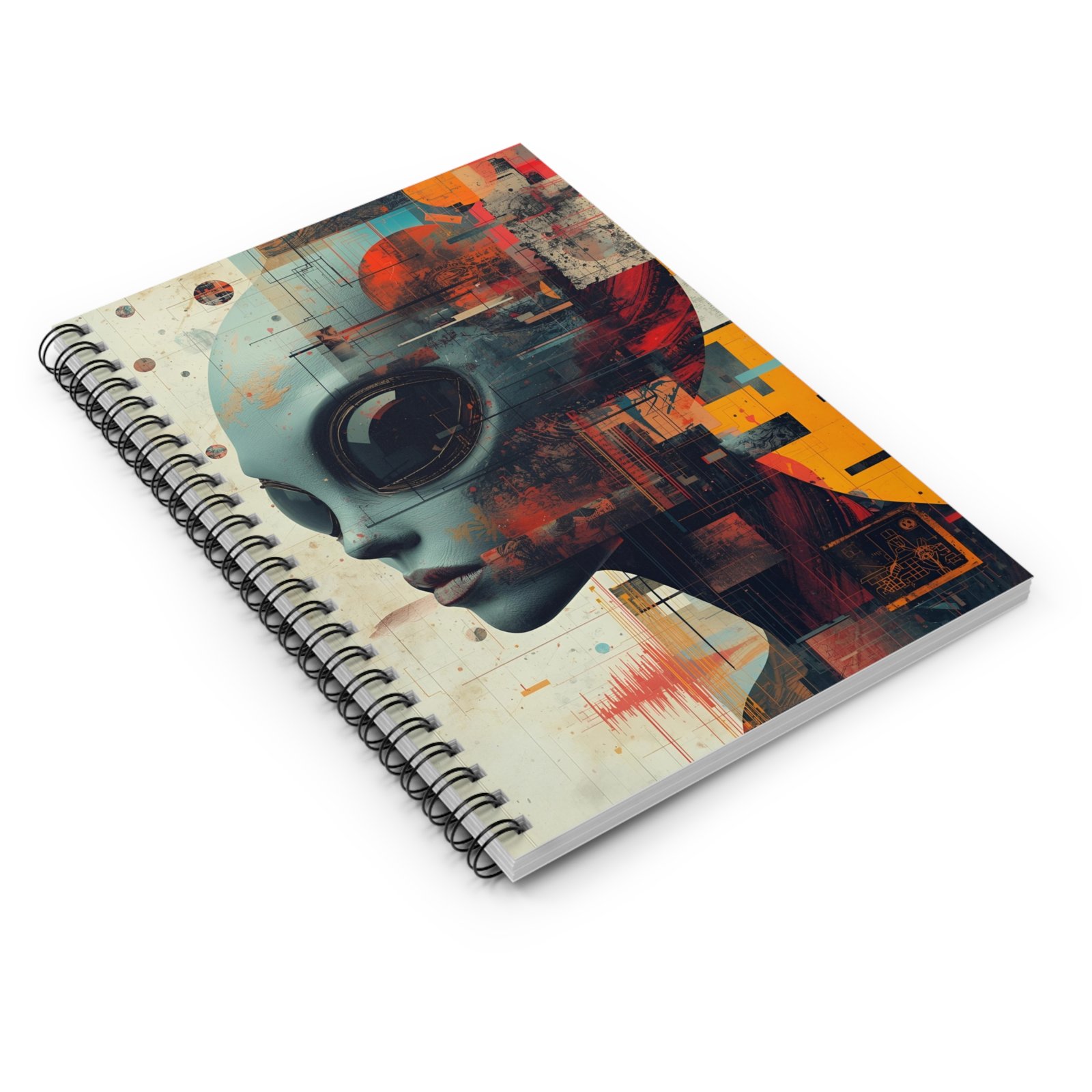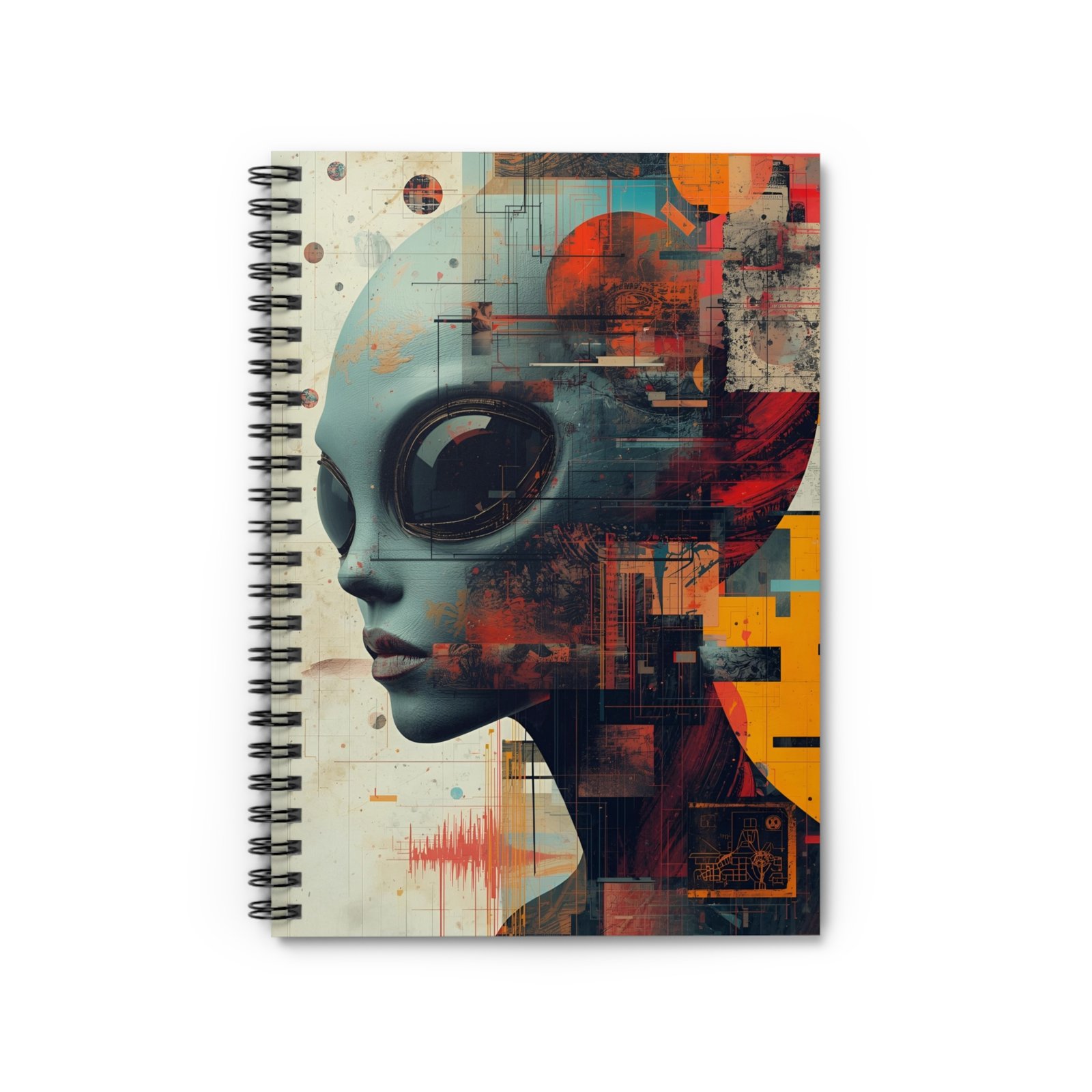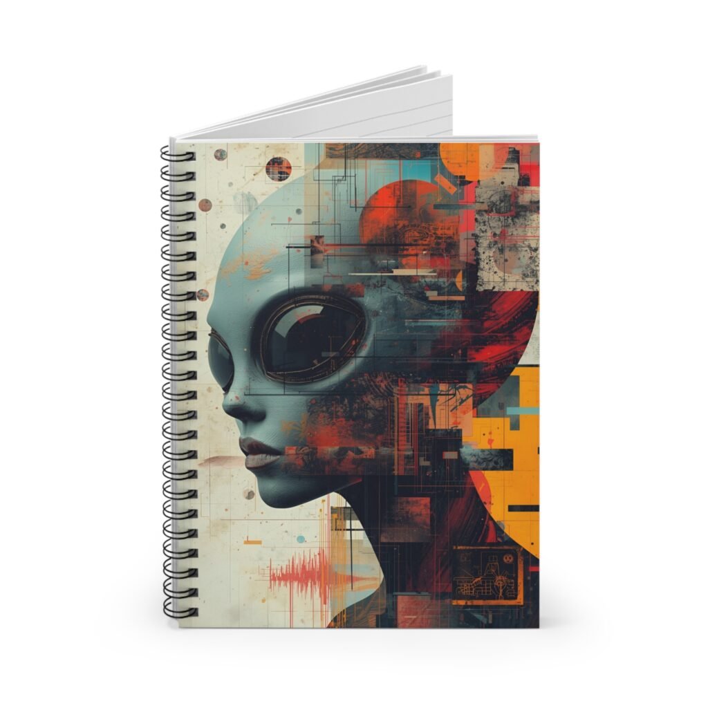 This spiral notebook pairs striking sci-fi artwork with everyday utility. The front cover shows a stylized alien-profile illustration in layered colors and geometric textures, setting a moody, futuristic tone that invites creative thinking, worldbuilding, and reflective notes. Inside, ruled 90gsm pages give a smooth, reliable surface for handwriting, while a metal spiral lets the notebook fold flat and makes removing pages simple. A back-pocket keeps loose sketches, receipts, or clippings close at hand. Sized to slip into backpacks or messenger bags, it becomes a trusted companion for sketching concepts, logging research, or drafting story scenes when inspiration strikes.