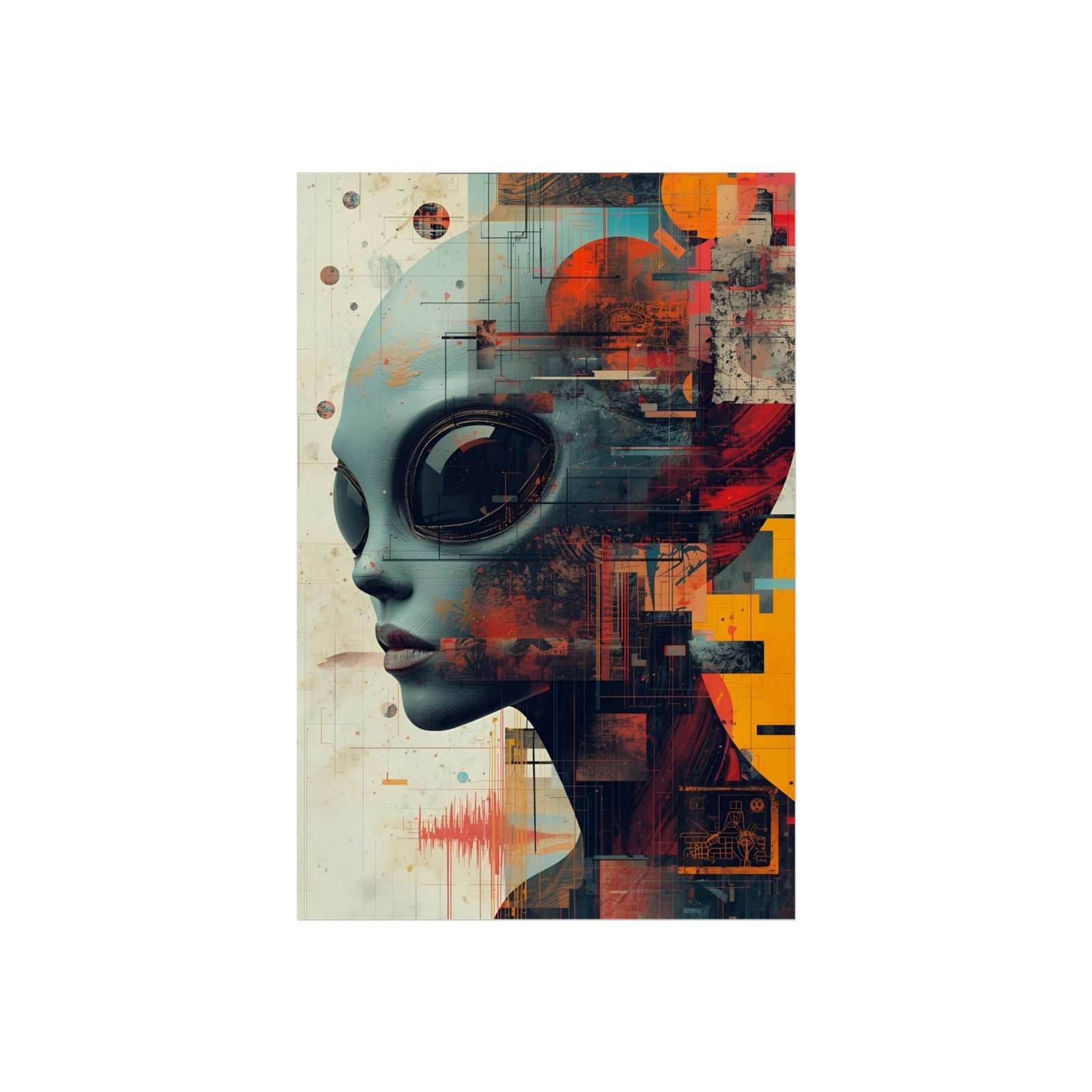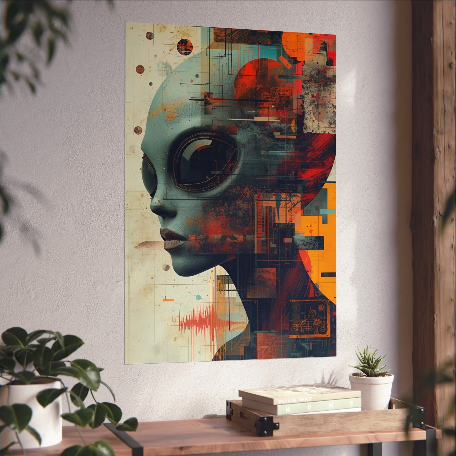 This gallery-grade fine art poster brings a futuristic, otherworldly portrait into your space with quiet intensity. Printed in giclée quality on smooth matte 220 gsm, acid-free paper, the image’s cool teal tones and warm orange accents hold deep detail and texture—layers of circuitry, faded marks, and painterly strokes that reward close viewing. It sits well in a minimal living room, a studio wall, or a creative workspace, adding a contemplative, sci-fi edge without overpowering the room. Available in multiple orientations and sizes, the print is produced using REACH-certified inks on materials sourced under EU Timber Regulation standards in the United Kingdom, giving you gallery look and archival quality that feels both modern and considered.