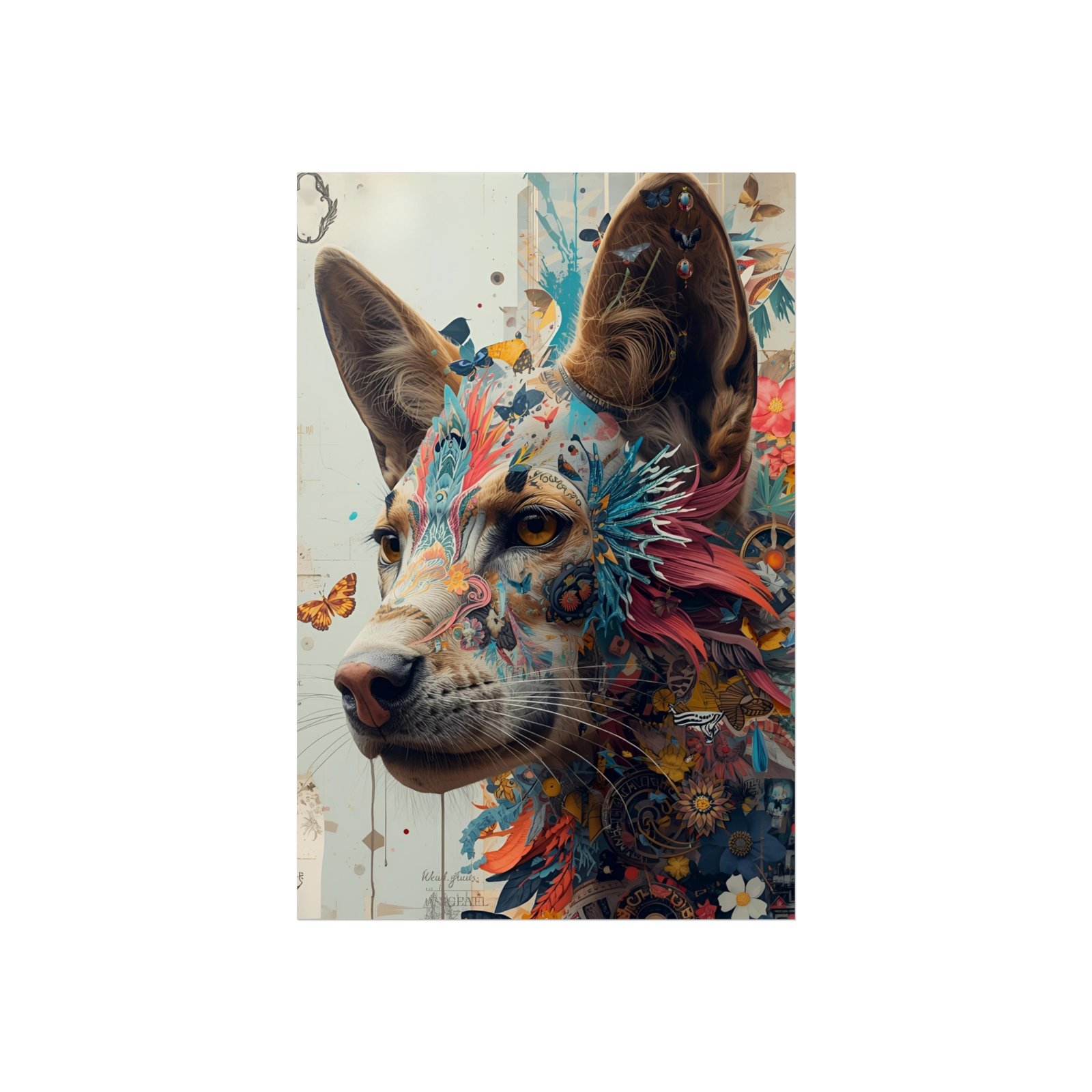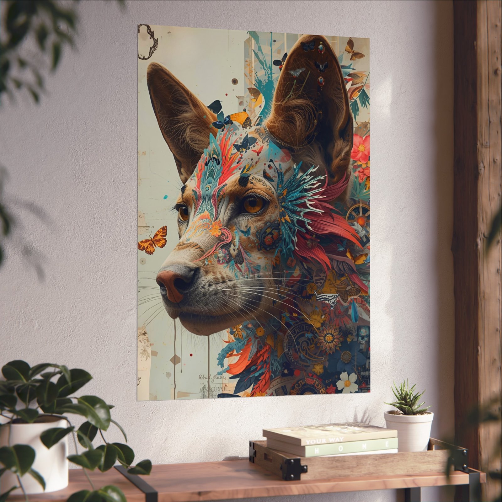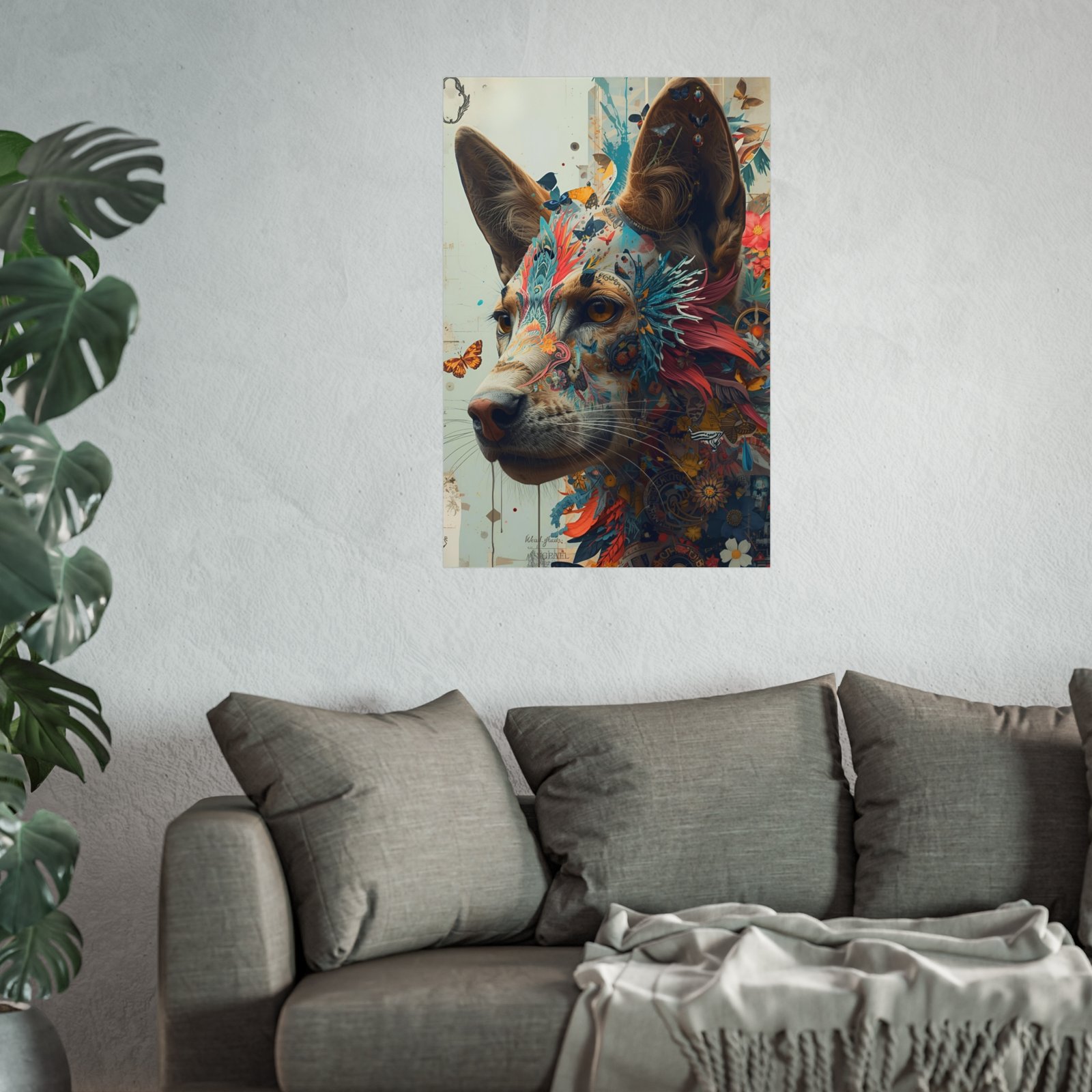 This gallery-quality poster brings a wild, whimsical energy to your wall. A fox-like canine rendered in intricate floral and feather motifs stares calmly forward while butterflies and delicate patterns drift around it. The muted, vintage-tinged background lets the richly colored details pop without overwhelming a room. Hang it where you want a touch of nature-meets-artistry — a reading nook, studio wall, or entry that sparks conversation and quiet wonder.