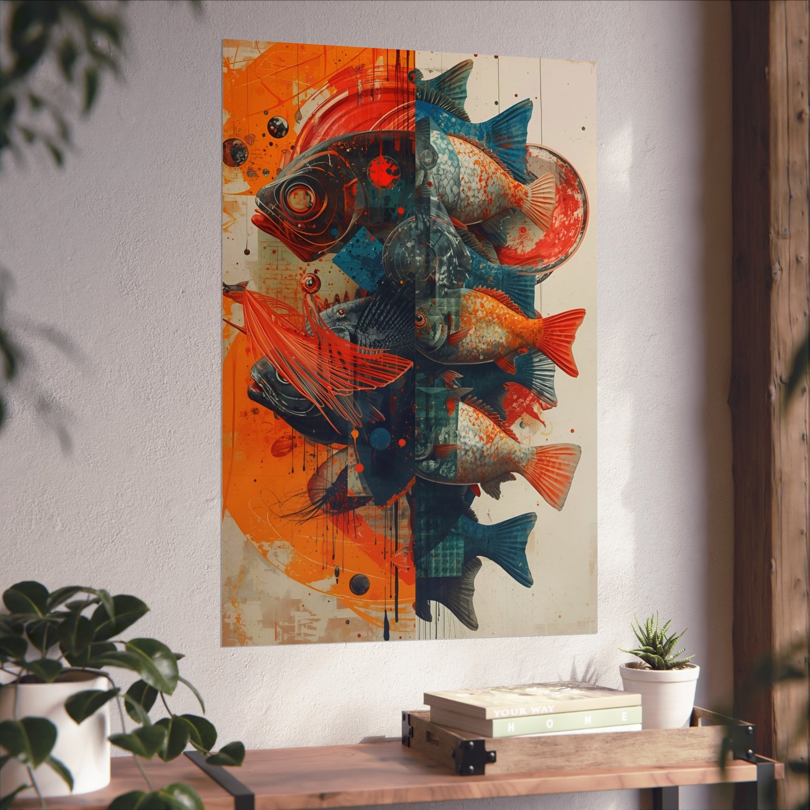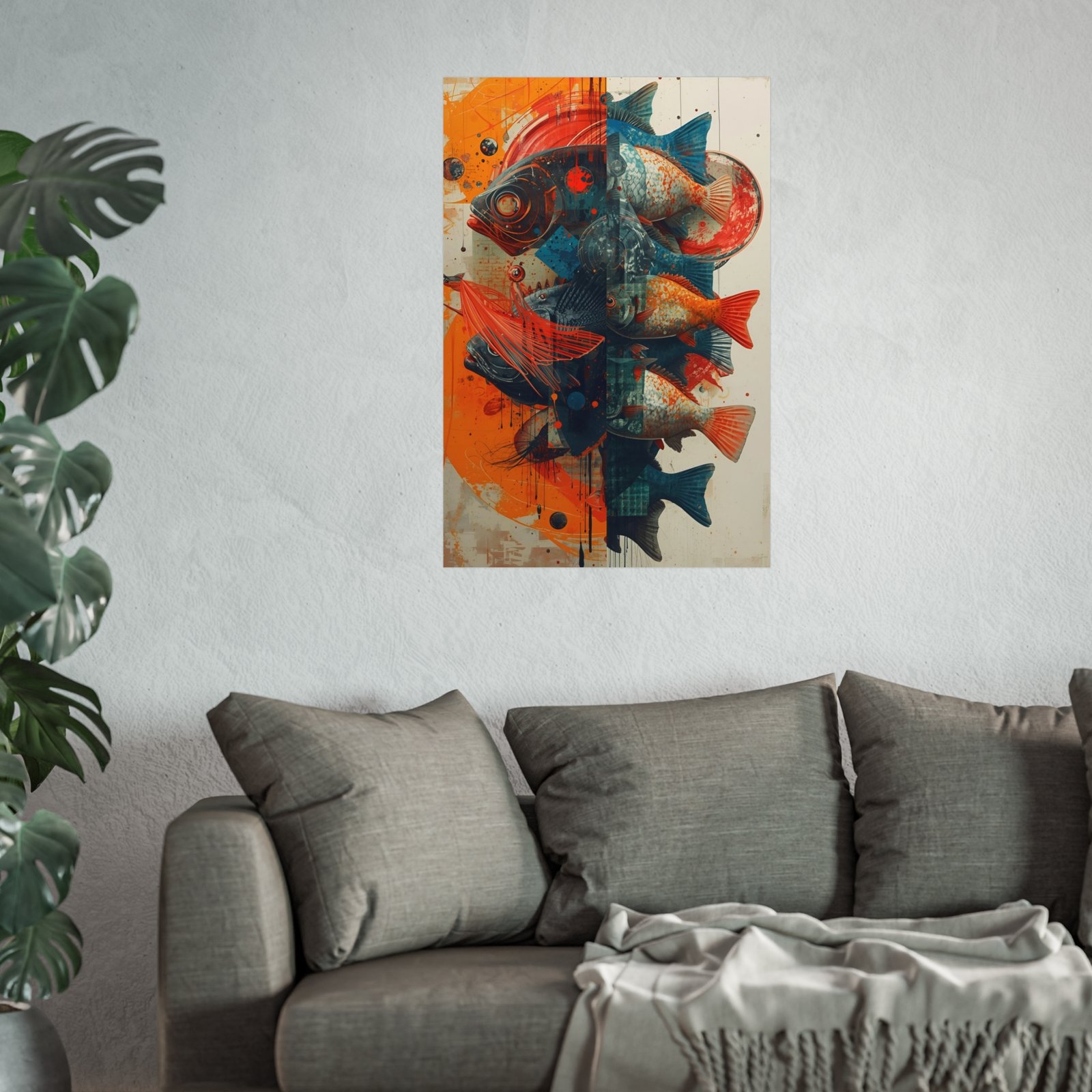 This gallery-grade poster brings kinetic ocean life and bold color into your space. Rich giclée inks capture the layered textures of the composition — a parade of fish rendered in saturated teal and burnt orange against a soft, matte backdrop. The result reads like a contemporary illustration crossed with street-art energy: lively, slightly gritty, and bruised with color. It hangs quietly confident over a sofa or in a home office, adding movement and a curated, collected feel. Choose from multiple orientations and sizes to fit a narrow nook or create a striking focal wall. The paper’s weight and smooth matte surface keep the tones deep without glare, so the artwork’s hand-drawn marks and paint splatters stay crisp and tactile.