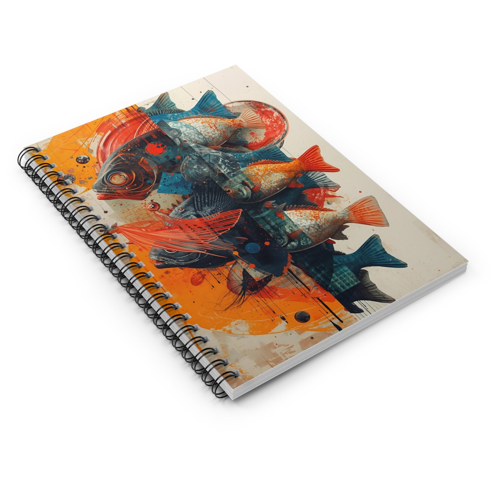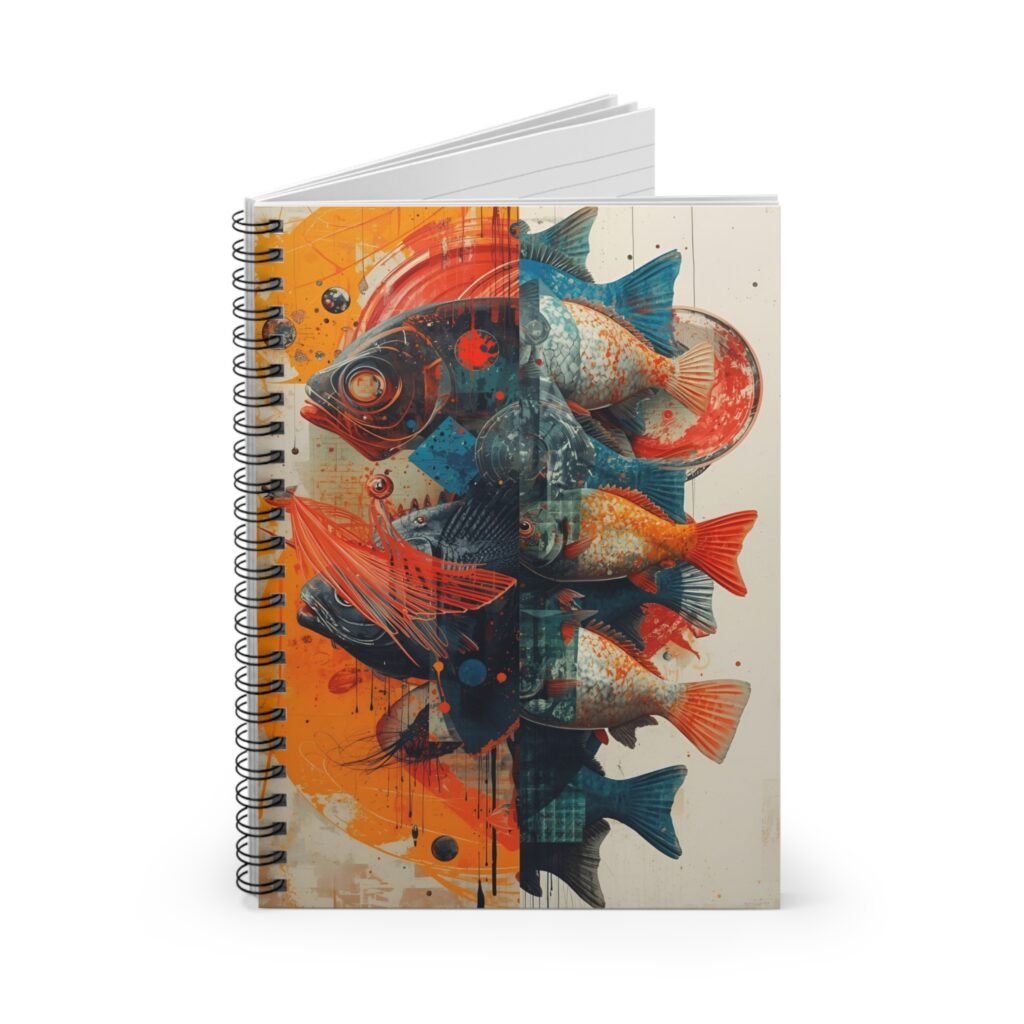 This spiral notebook carries a lively, painterly school of fish across its front cover — a splash of orange, teal, and deep indigo that feels both playful and thoughtful. It’s compact enough to slip into a tote or daypack and solid enough for daily notes, sketches, and lists. The ruled 90gsm pages take ink smoothly, while the metal spiral lets you fold it back or remove pages cleanly. A discreet document pocket lives inside the back cover for receipts, sketches, or loose notes. Use it for idea-sparking morning pages, field sketches, class notes, or grocery lists — its artful cover brings a little studio energy to the everyday.