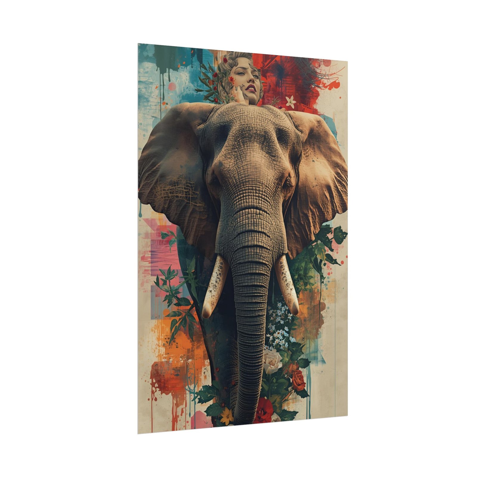 This rolled poster brings together bold wildlife presence and painterly color in a single striking print. Up close, the elephant’s textured skin pulls you into the frame; around it, washes of teal, rust and floral accents soften the scene and add an artful contrast. It hangs easily in living rooms, studios, or workspaces where statement art and a touch of the wild are welcome. Choose a fine art paper for a textured, museum-like feel, semi-glossy for vivid color and sharp detail, or matte for a softer, museum-print look. Available in several sizes and orientations to suit shelves, gallery walls, or a single focal space.