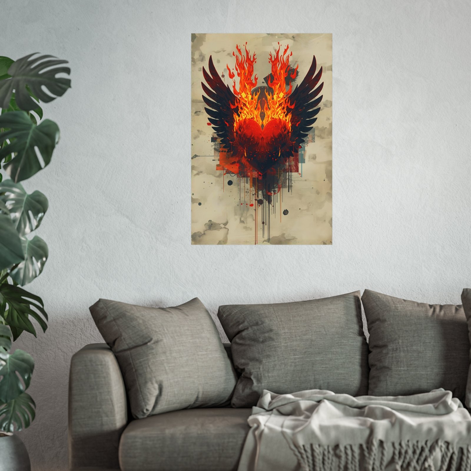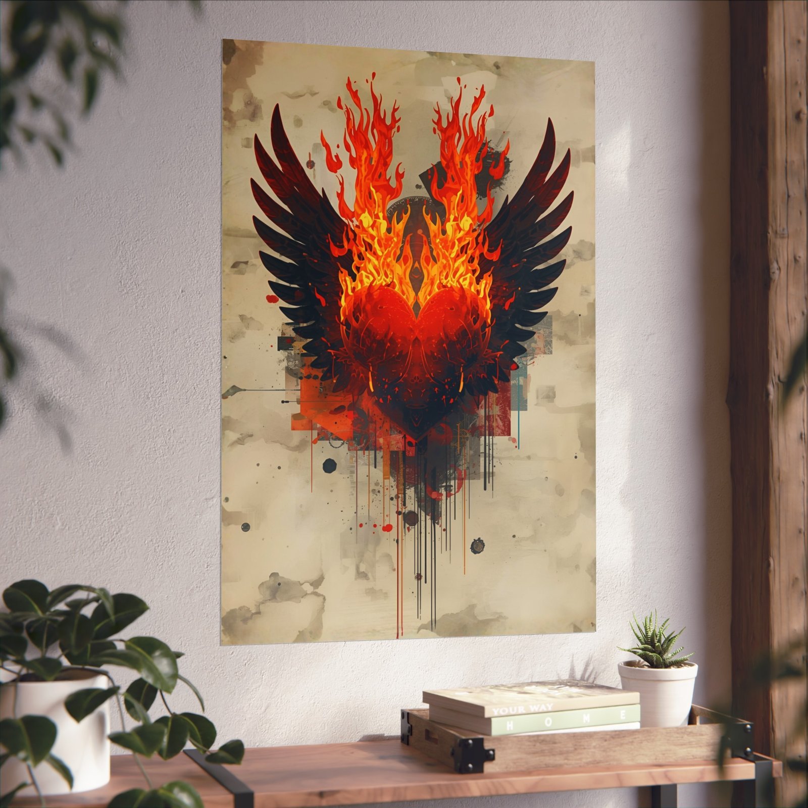 A bold fine art poster that captures raw energy—an abstract heart of flames crowned by dark wings, textured with painterly washes and modern geometric accents. The giclée-quality print brings out deep blacks and vibrant oranges on a smooth matte, gallery-grade paper. Hung over a couch or in a studio, it becomes a focal story piece: visceral, a little mysterious, and charged with renewal and intensity. It suits rooms that favor moody, contemporary art and people who collect pieces that feel like moments—fiery, layered, and personal.