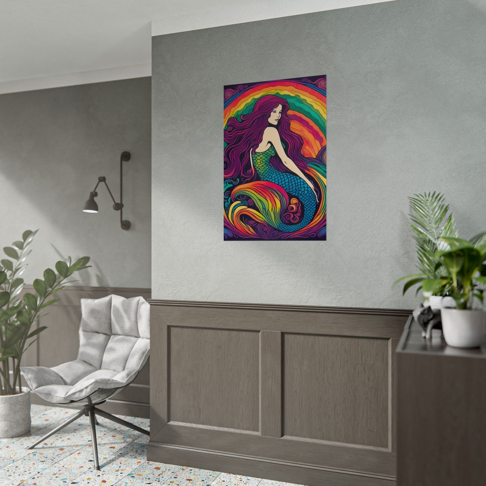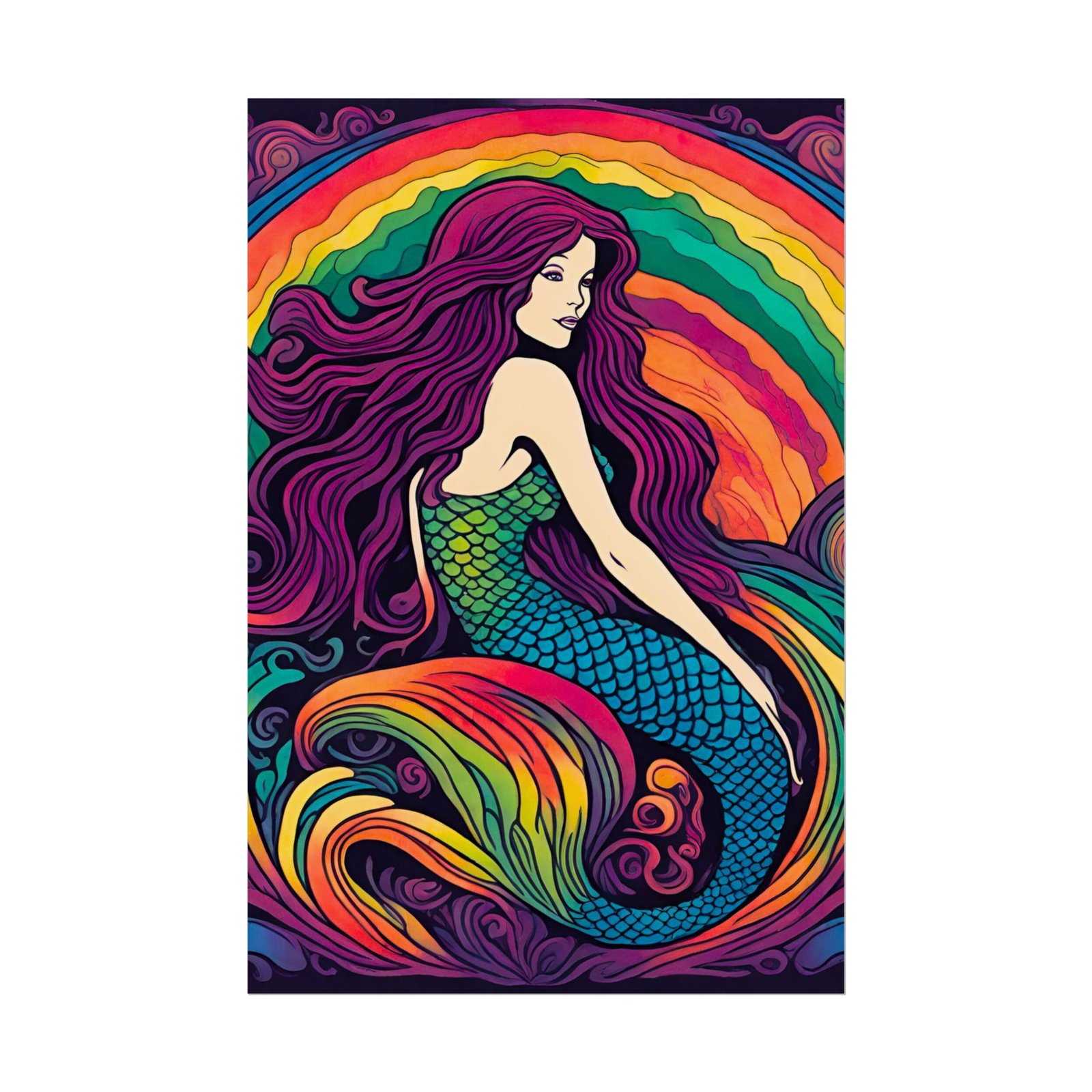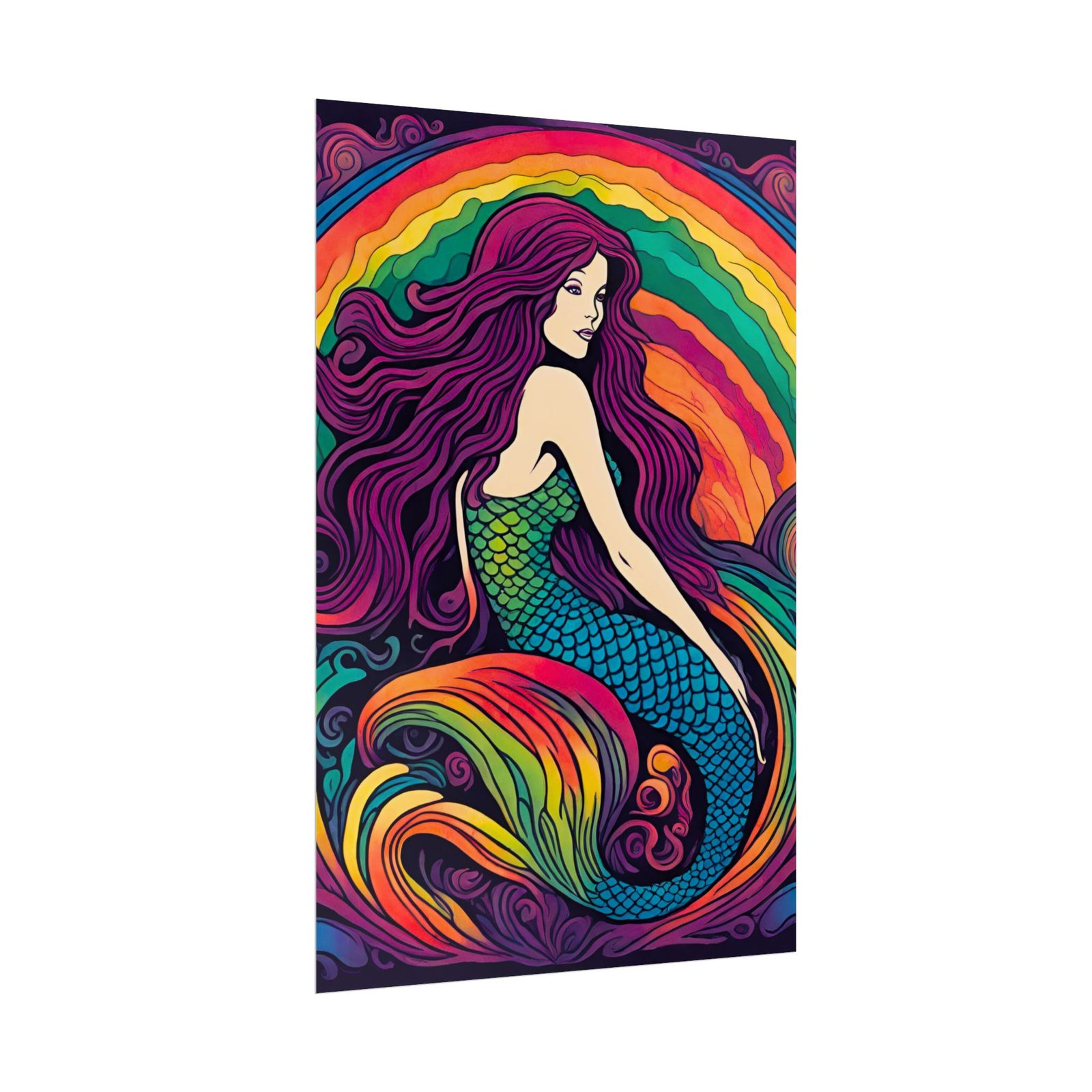 A vibrant rolled poster that brings a modern, psychedelic mermaid to life. Rich, saturated inks and smooth gradients make the rainbow waves and iridescent scales pop against deep, moody backgrounds. Choose from two paper options — semi-gloss for sharp photographic color, or matte for a muted, artistic finish. Rolled for safe shipping, this print arrives ready for framing or mounting and becomes a bold focal point in bedrooms, studios, or cozy seaside-inspired corners. The artwork invites lingering looks and sparks conversations about color, ocean myths, and personal style.
