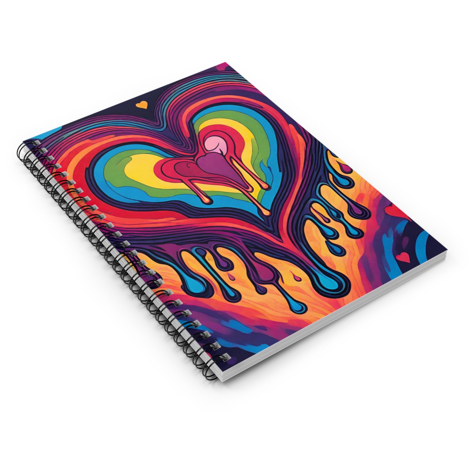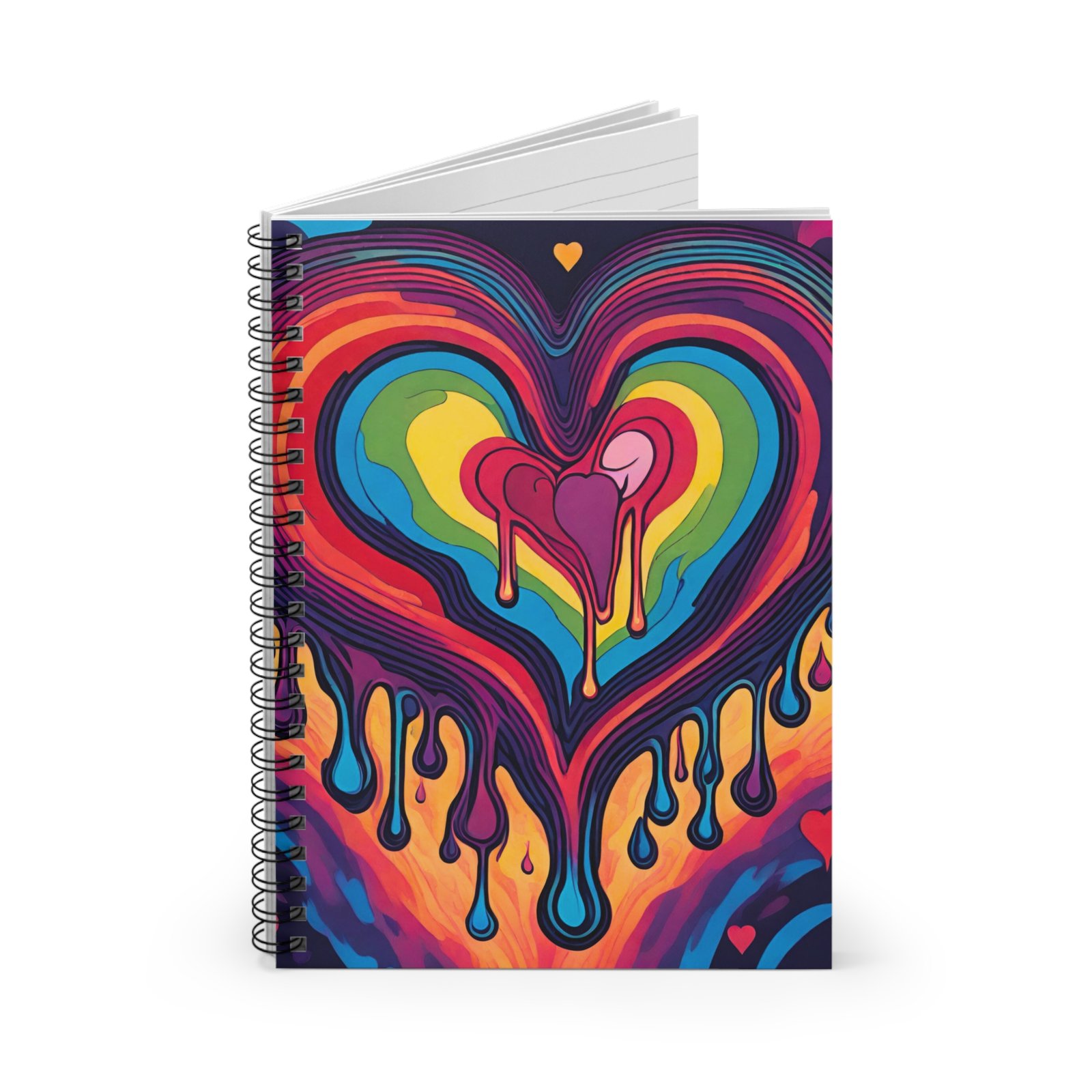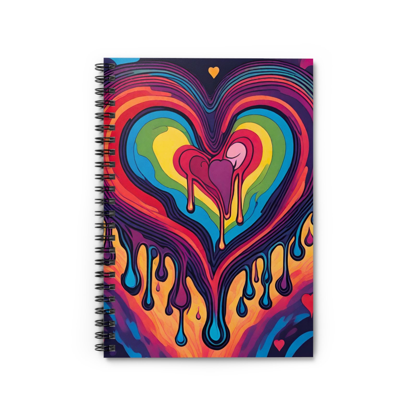 This vibrant spiral notebook brings bold color and raw emotion to every page. The front cover features a melting, rainbow heart rendered in flowing, psychedelic waves — a little wild, deeply expressive, and impossible to ignore. At 6” x 8” it slips into backpacks and tote bags, ready for quick sketches, journal entries, class notes, or lists. The ruled 90gsm pages feel substantial under pen and keep ink from feathering, while the metal spiral lets the book lie flat or fold back for comfortable writing. An inner document pocket keeps receipts, tickets, or loose sketches organized. Use it for daily reflections, studio ideas, or to carry a shard of bright optimism in your day.