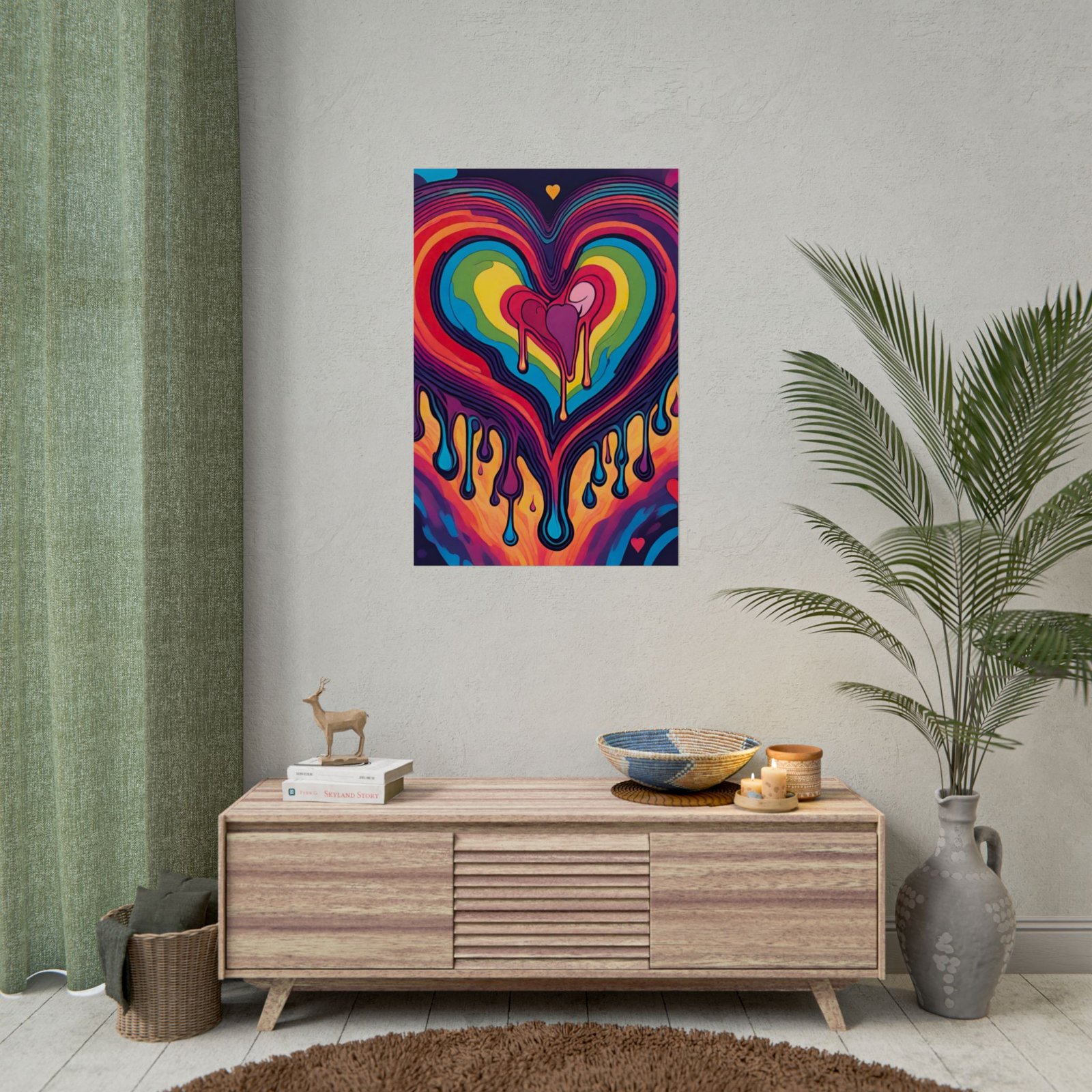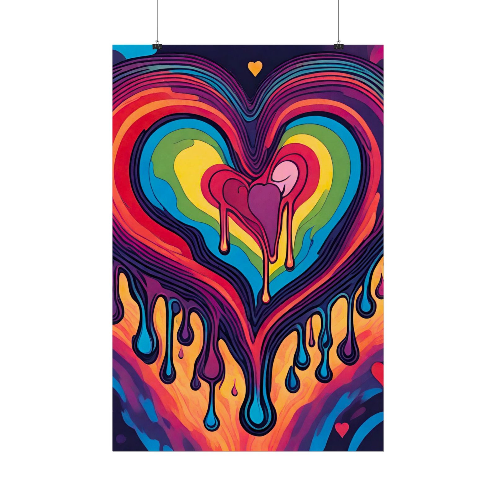 A vibrant, roll-ready art poster that brings bold, liquid color into any room. This print captures a dripping, rainbow heart rendered in saturated giclée tones — luminous, velvety, and built to last. Choose from a satin semi‑gloss for punchy colors, or a softer matte for a subdued, gallery-style finish. Hung in a studio, dorm, or living space, it reads like an anthem of emotion: warm, electric, and unmistakably alive.