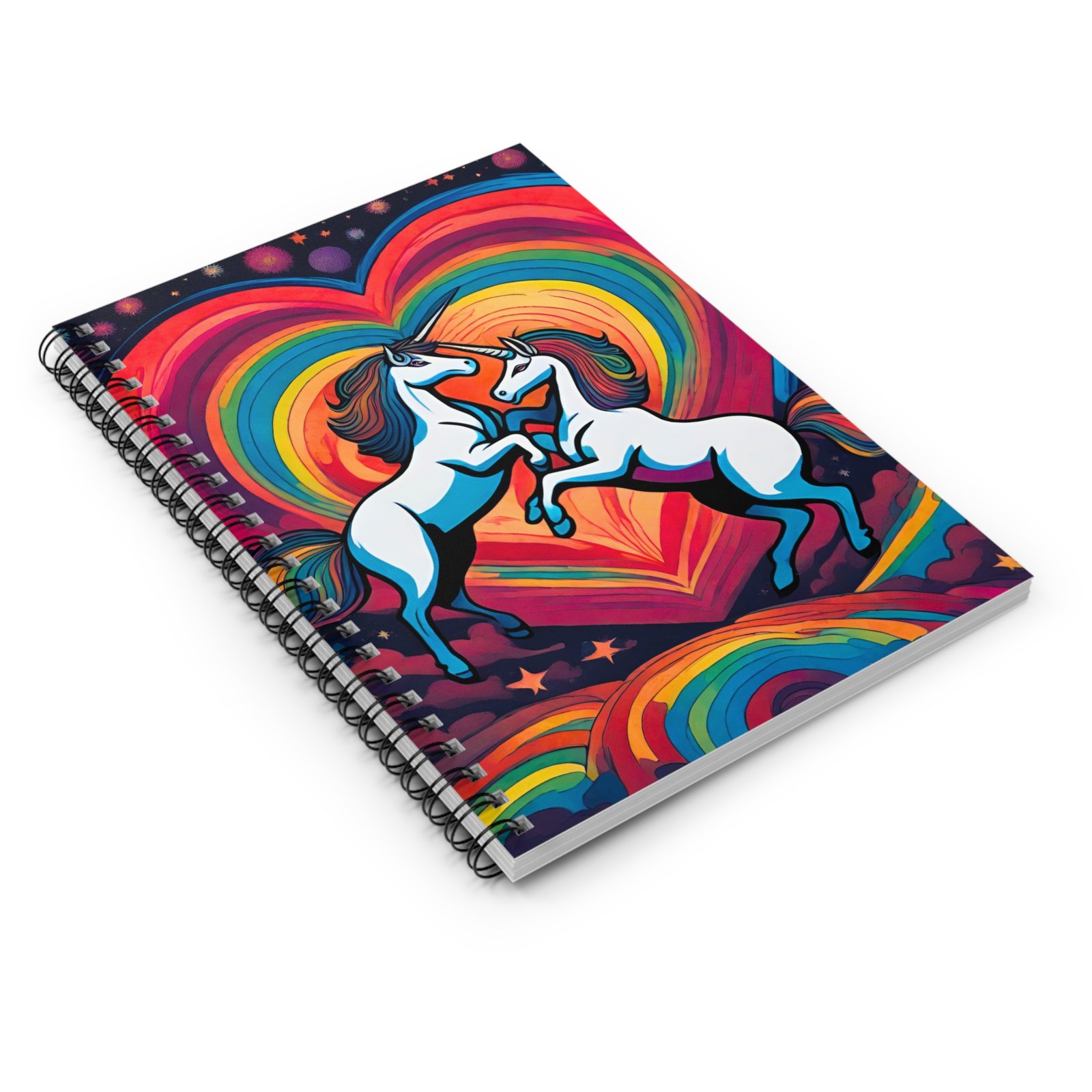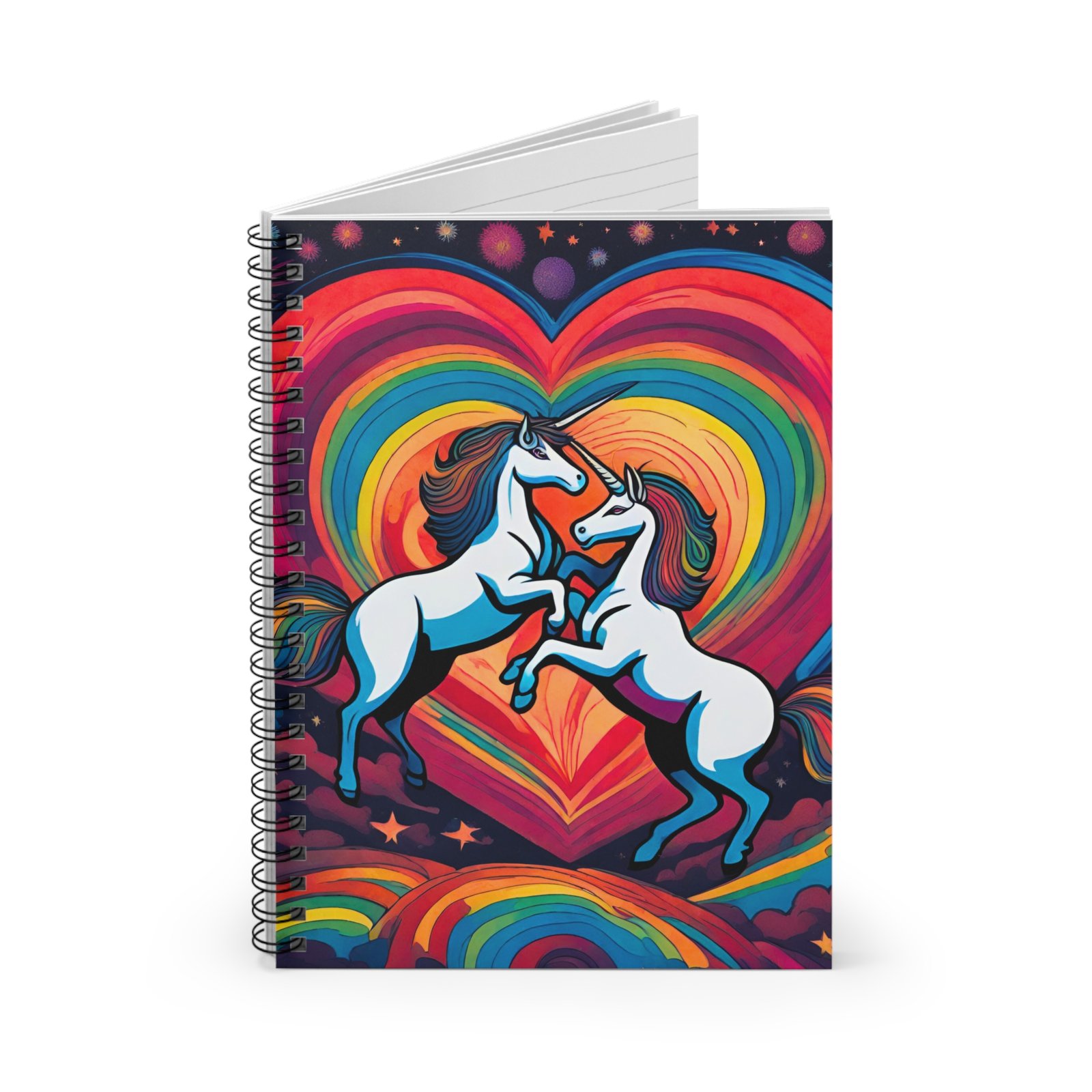 This spiral notebook brings bright, playful energy to everyday notes. Two prancing unicorns leap across a vivid rainbow heart on the front cover — a bold, joyful scene that invites doodles, lists, and ideas. The ruled pages use thicker 90gsm paper so pens and pencils glide without bleed-through, and a metal spiral lets the book fold flat or flip pages cleanly. Inside the back cover a document pocket tucks receipts, stickers, or loose sketches out of the way. Sized at 6″ x 8″, it slips into backpacks and tote bags for school, café work, or creative bursts on the go. Use it for journaling, class notes, planning, or as a colorful place to collect moments and small inspirations.