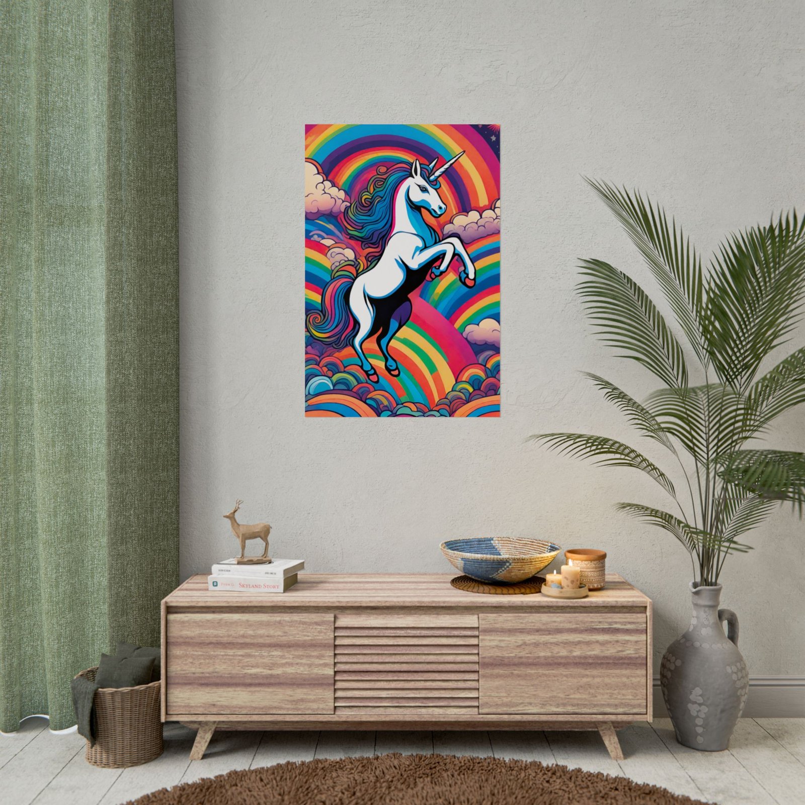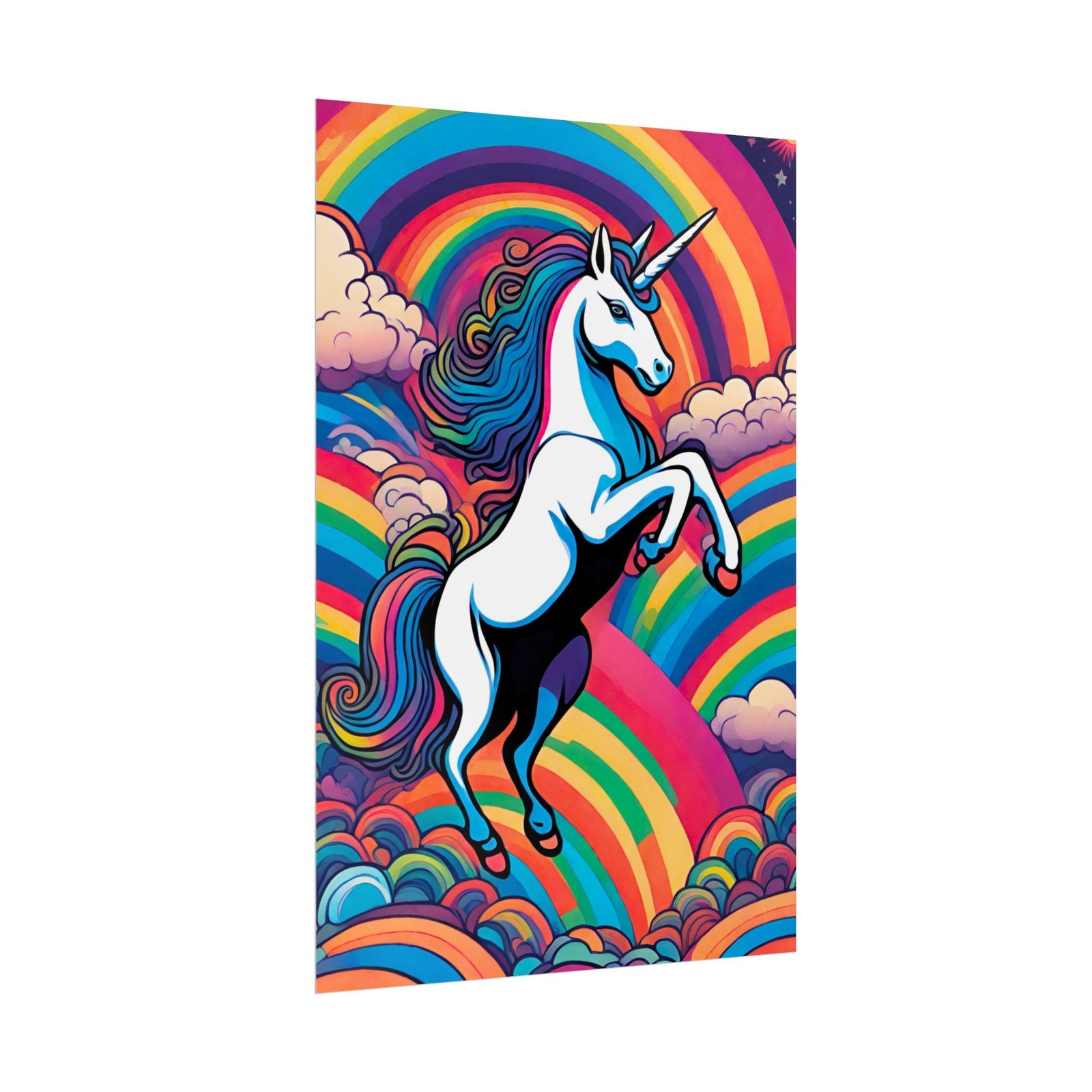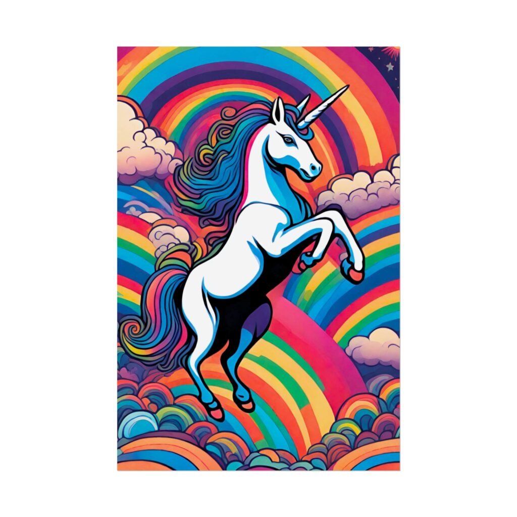 This rolled poster brings bold, playful color into a room with a vibrant unicorn leaping through layered rainbows and cottony clouds. The illustration carries a retro-pop energy—saturated hues, thick outlines, and whimsical movement—that livens up bedrooms, studios, or any creative corner. Choose from two high-quality paper types to match your display: semi-glossy for punchy, photo-like color, or matte for a softer, low-sheen look. This piece suits grown-up collectors of pop art, nostalgic fantasy fans, and anyone building a bold, colorful space for movie nights, gallery walls, or cozy creative sessions.