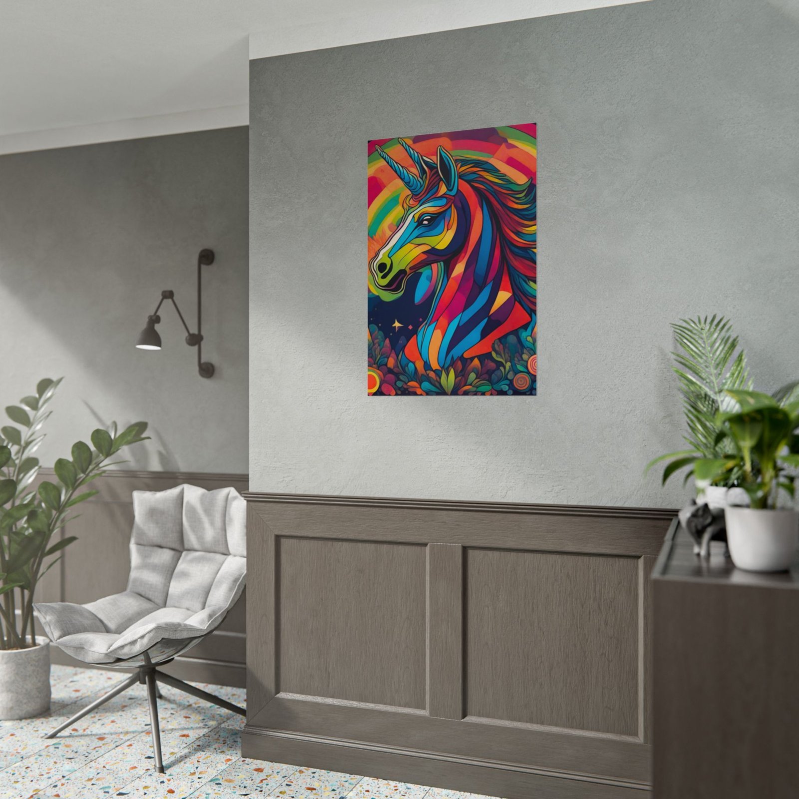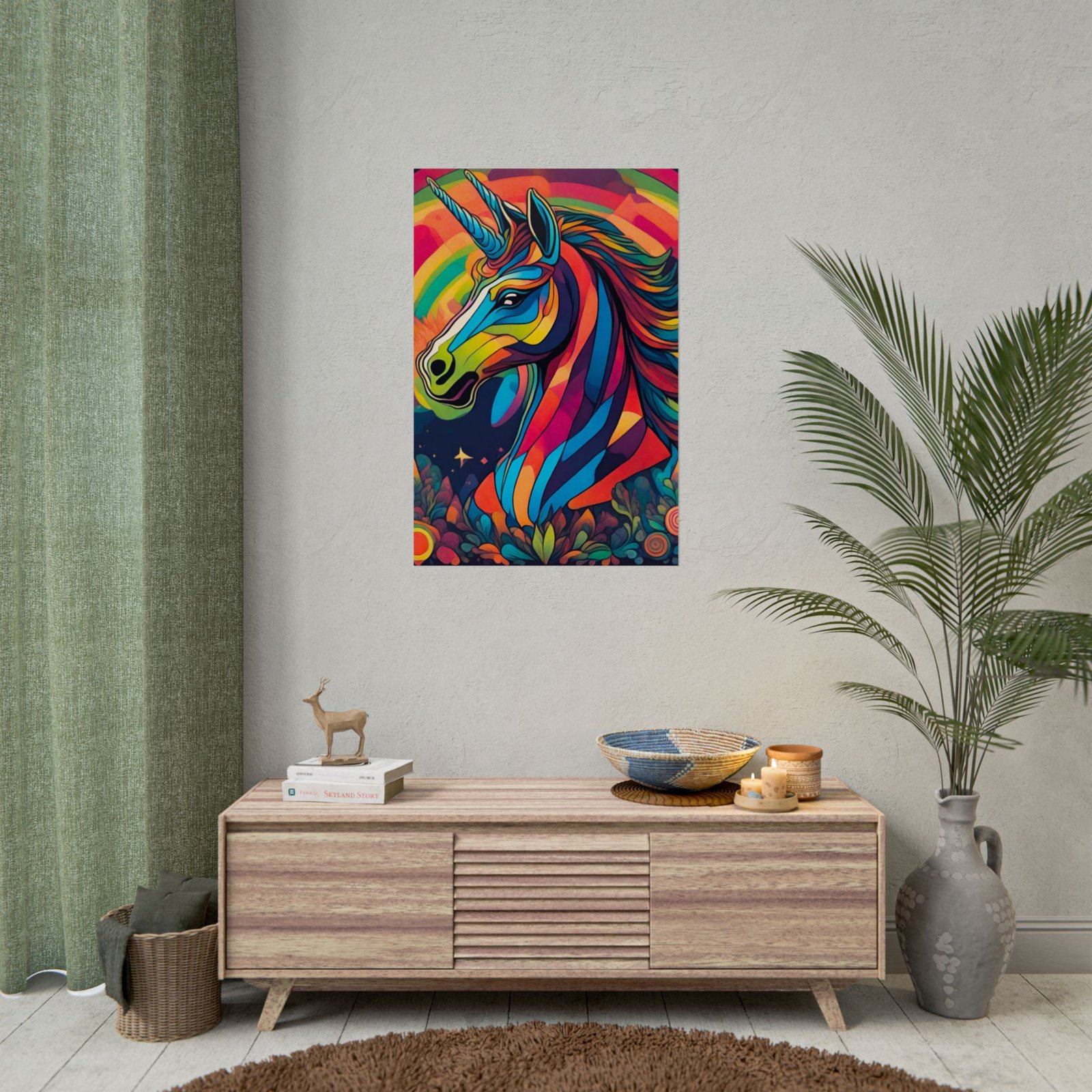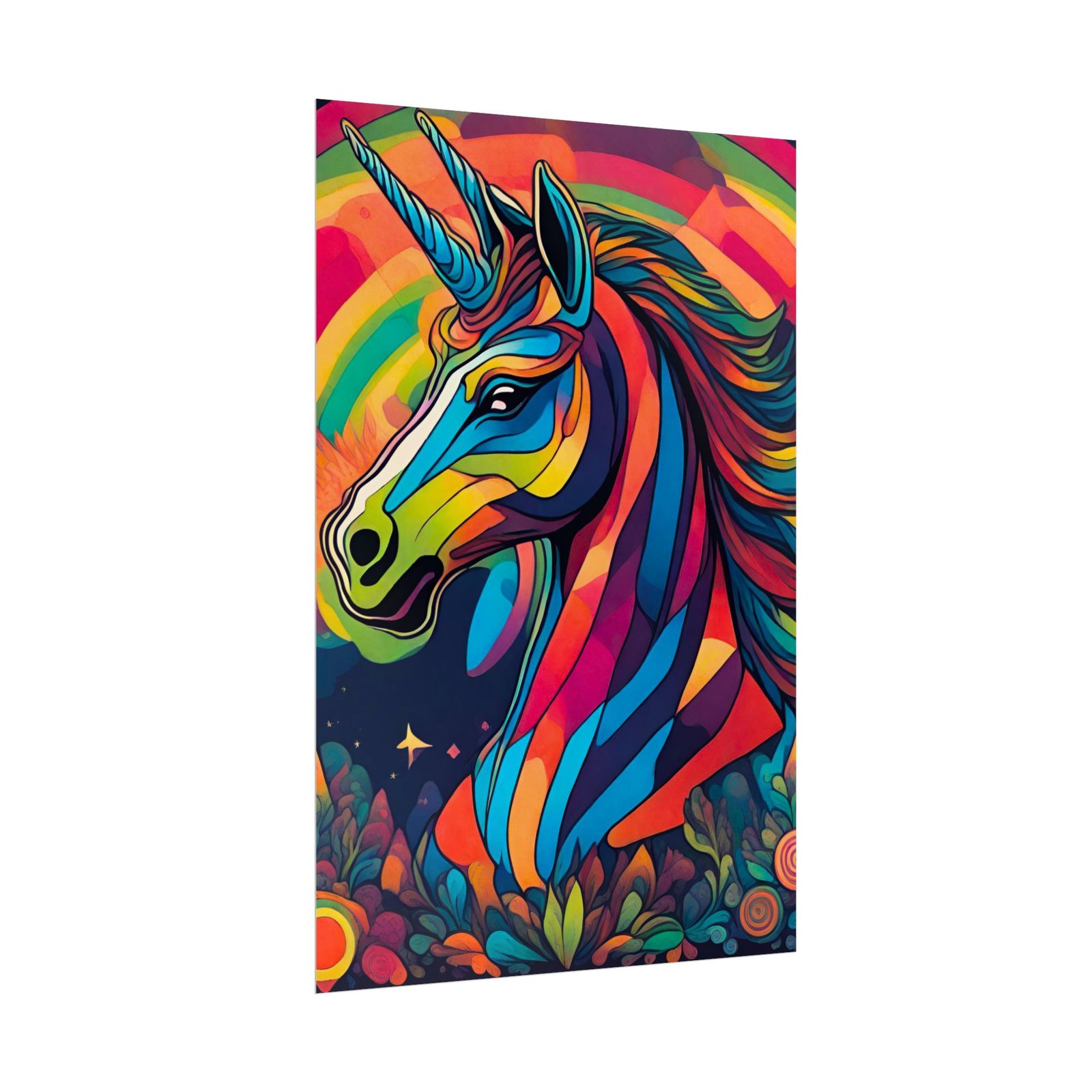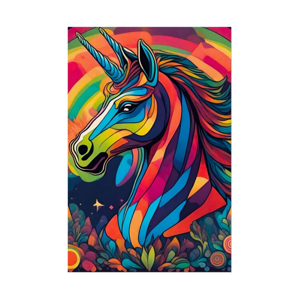 This rolled poster brings a burst of color and imagination to any wall. A vibrant, stylized unicorn rendered in bold, saturated hues sits against a rainbow sky and whimsical floral foreground. Printed with giclée-quality inks on your choice of paper, the image keeps its brightness and detail over time. matte offers a softer, low-sheen finish. Packaged rolled for safe delivery, it arrives ready for framing or mounting and adds an immediate mood lift to rooms that celebrate color, fantasy, and spirited design.