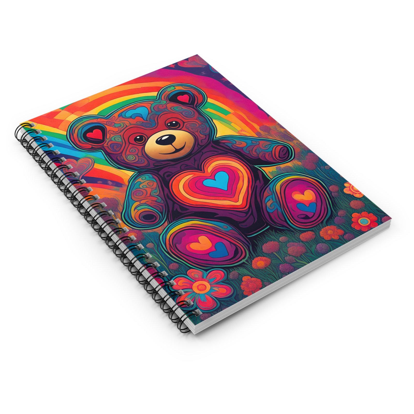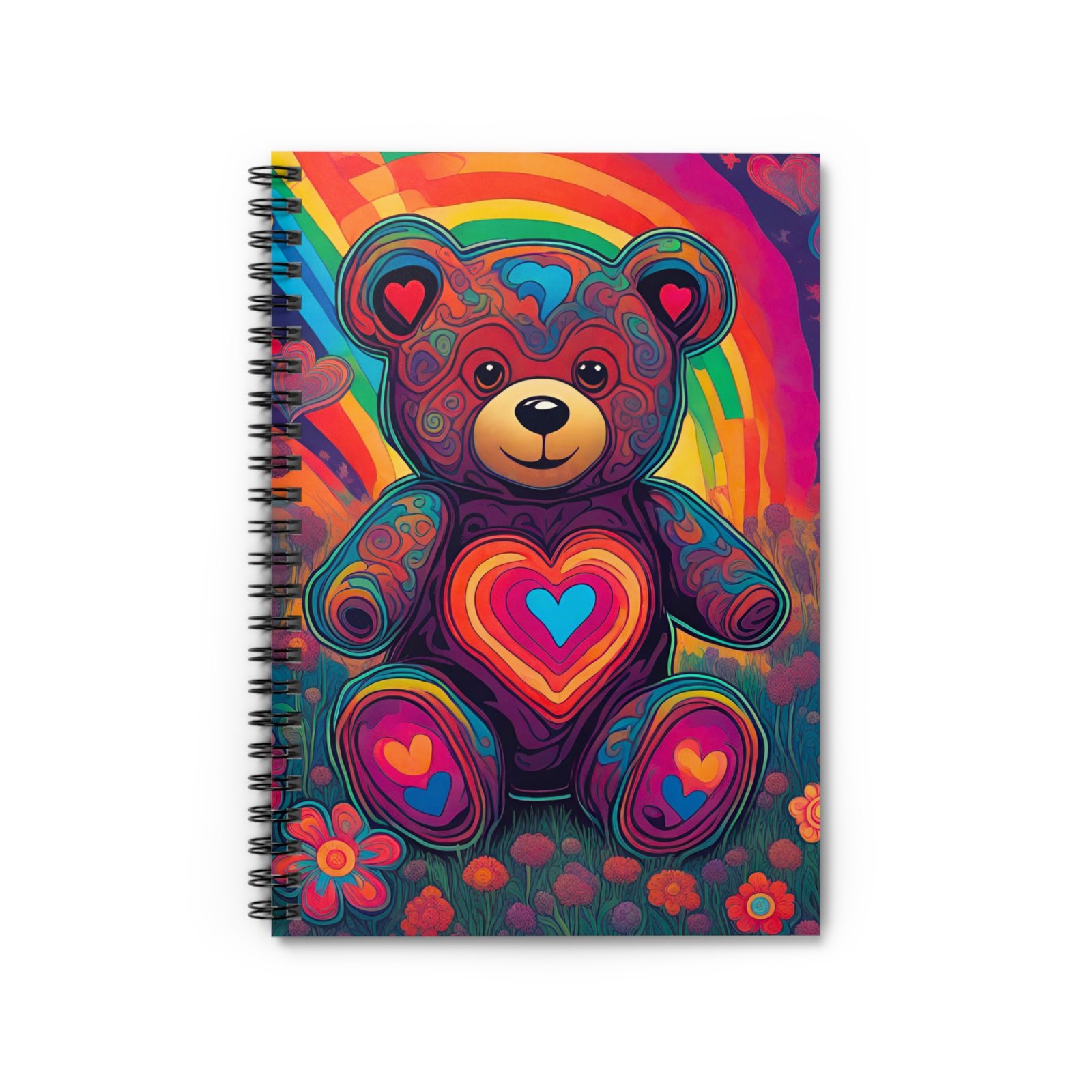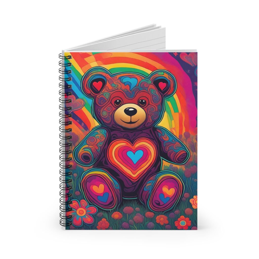 Bright, heart-filled spiral notebook with ruled pages made for everyday dreaming and focused notes. The front features a vibrant, rainbow-colored teddy bear surrounded by flowersโa playful, warm image that invites creativity. Inside, smooth 90 gsm ruled paper provides a comfortable writing surface across 118 lined pages, while a sturdy metal spiral lets the notebook lie flat or fold back for quick jotting. A dark grey back cover and an inner document pocket keep loose notes and small keepsakes secure. Compact 6 x 8 in size fits into bags and backpacks, ready for classes, journaling sessions, or bursts of inspiration on the go.