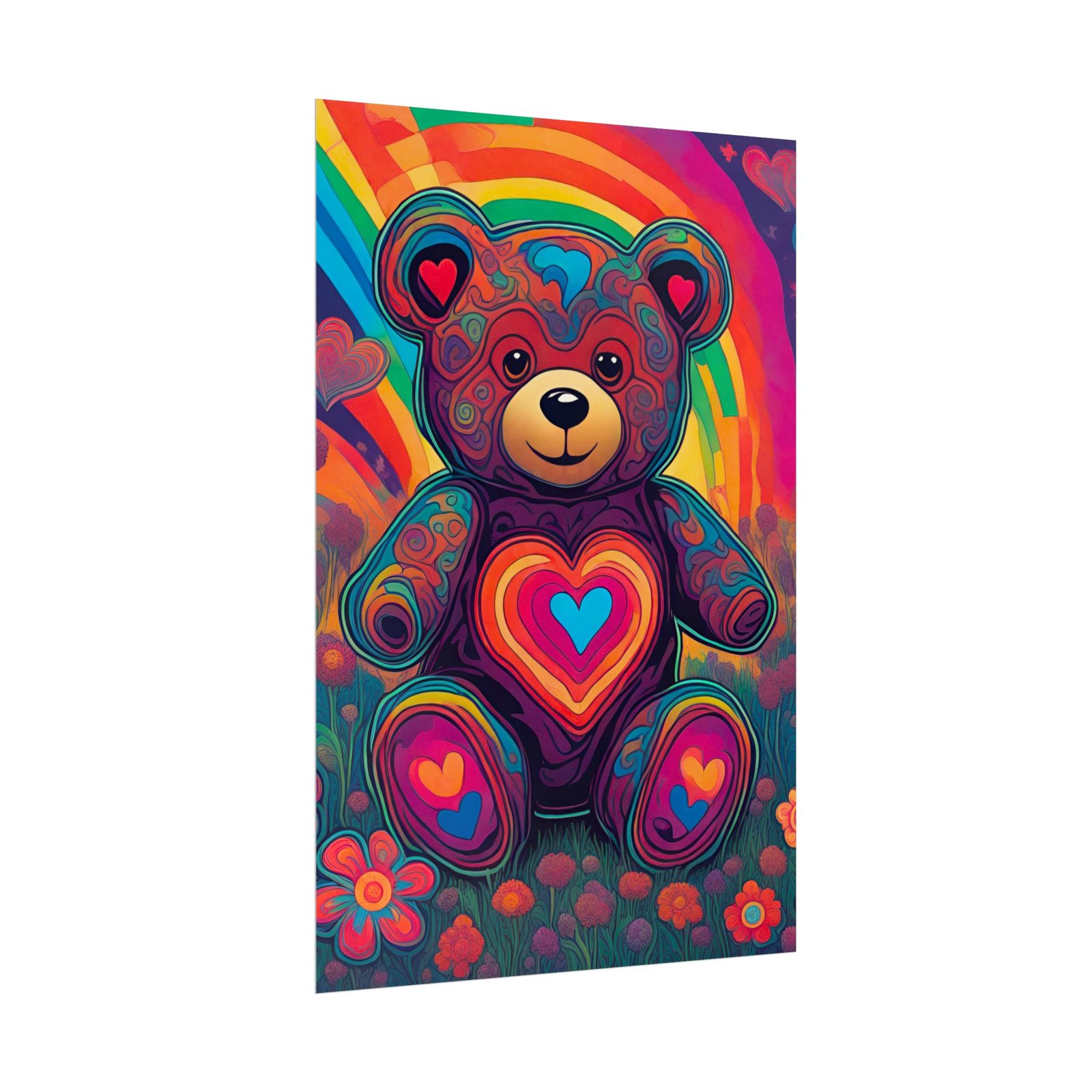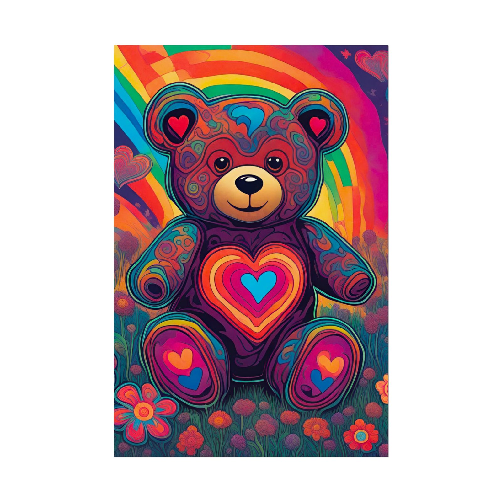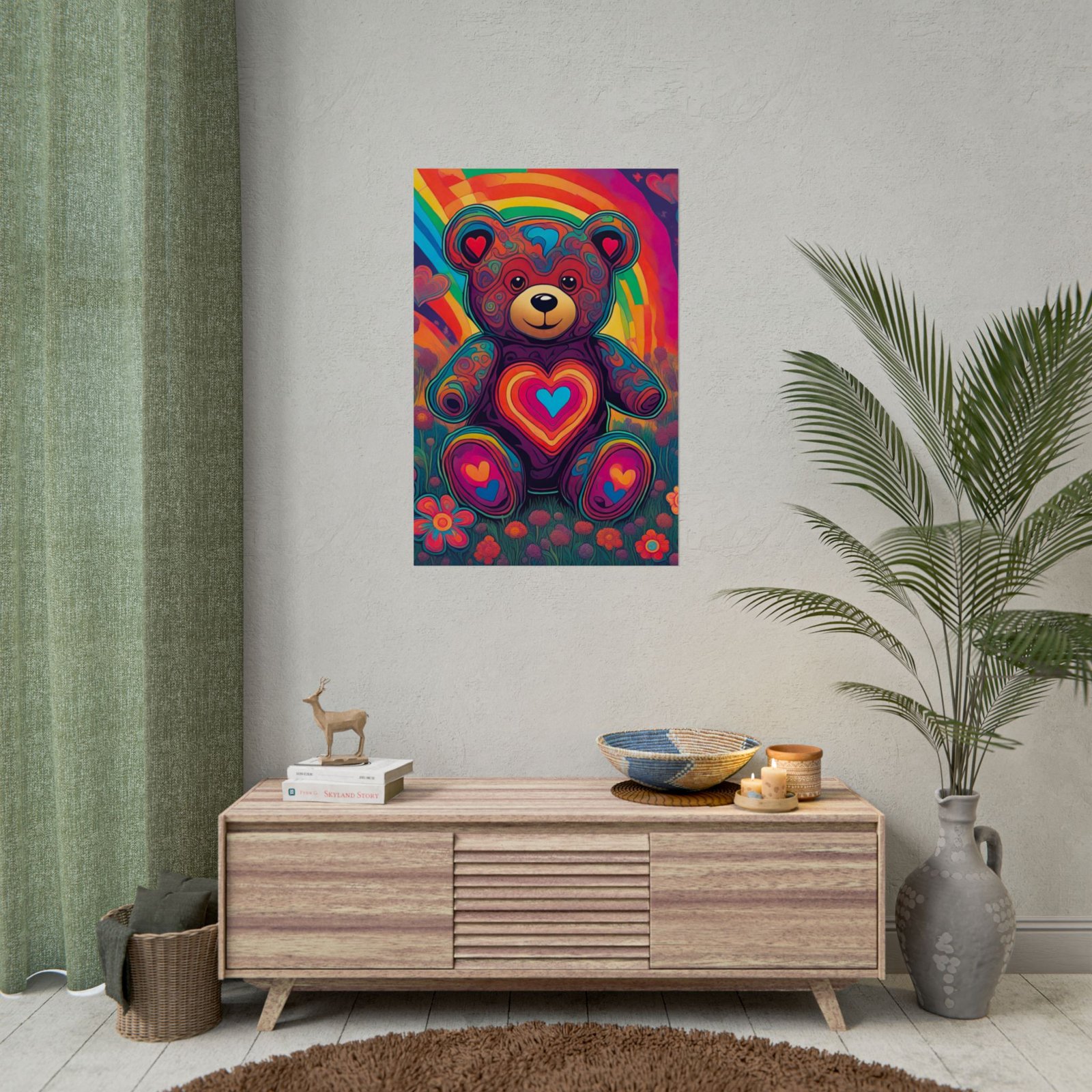 A rolled art poster that bursts with color and heart. Printed with giclée precision on your choice of semi-glossy, or matte paper, this print holds onto vivid hues and crisp detail so the rainbow teddy and layered hearts feel alive on your wall. Lightweight and shipped rolled, it arrives ready for framing or mounting — a bright, joyful focal point that warms a bedroom, studio, or playful living corner.