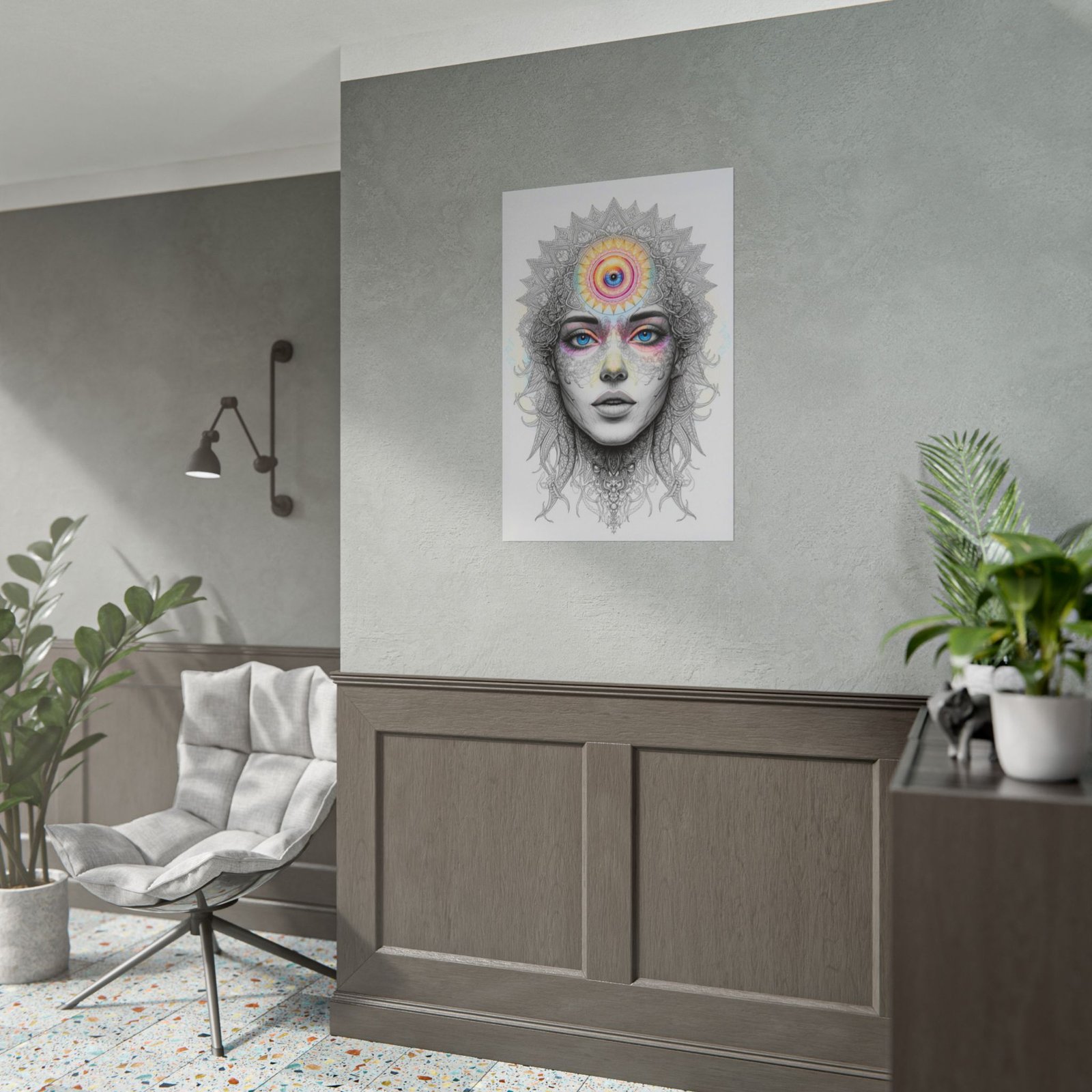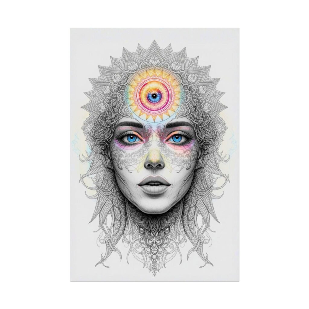 This rolled poster features a dreamlike portrait with delicate pencil-like linework and a vivid third-eye motif at the forehead. Soft grayscale shading frames the face while prismatic color accents draw the viewer to the eyes and the cosmic mandala above them. Hung on a blank wall it brings a quiet, mystical energy — a blend of fine-art illustration and subtle psychedelic color. It reads like a talisman for contemplation: intriguing in small doses, immersive at a glance. The choice of paper semi-glossy, or matte lets you tune the finish — semi-glossy for punchy color and crisp detail; or matte for a softer, museum-like mood.
