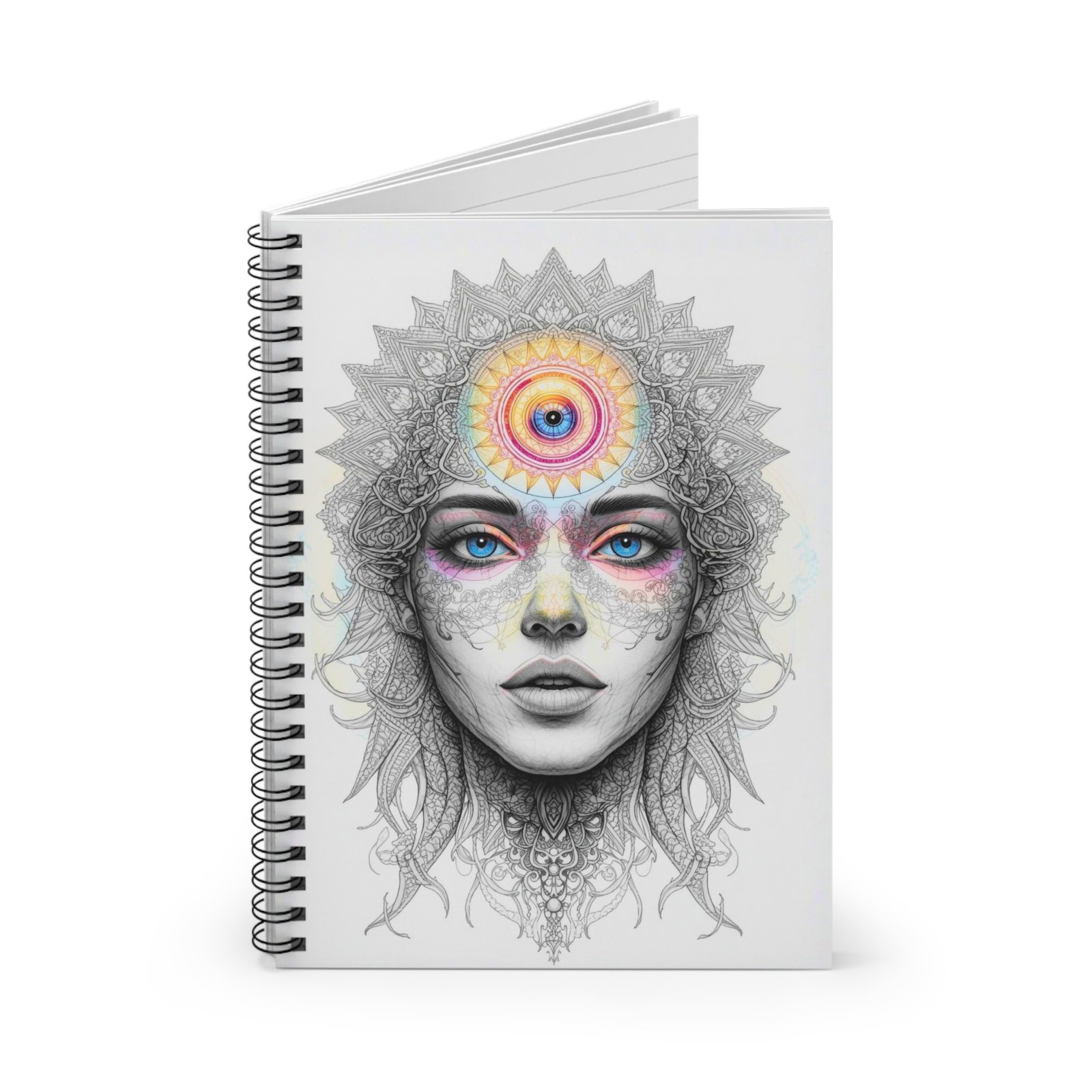 A spiral-bound ruled notebook that feels like a personal altar for ideas. The front cover shows a hand-drawn, ethereal face framed by intricate mandala linework and a soft, colorful third-eye motif. Opening it reveals 118 lined pages of smooth 90gsm paper—breathable enough for everyday journaling, sketch-notes, or ritual lists—with a dark grey back cover and a practical inner document pocket to hold loose pages or keepsakes. The metal spiral lies flat for comfortable writing and allows clean page removal when you want to share or archive a thought. Compact at 6 x 8 inches, it slips into backpacks or tote bags and invites quiet moments of reflection, creative planning, or study.