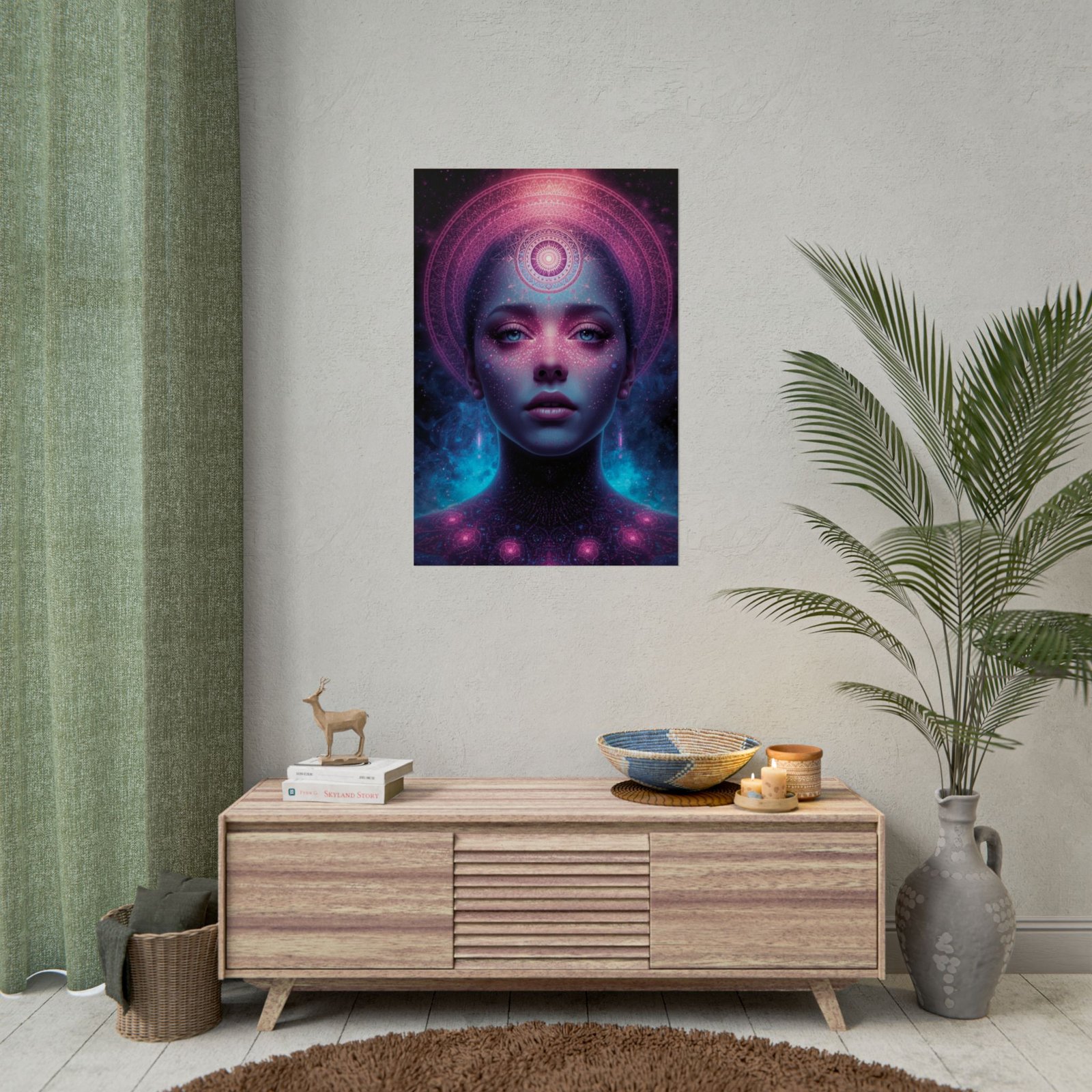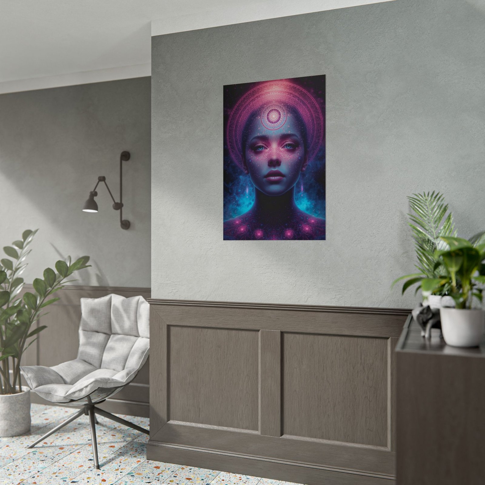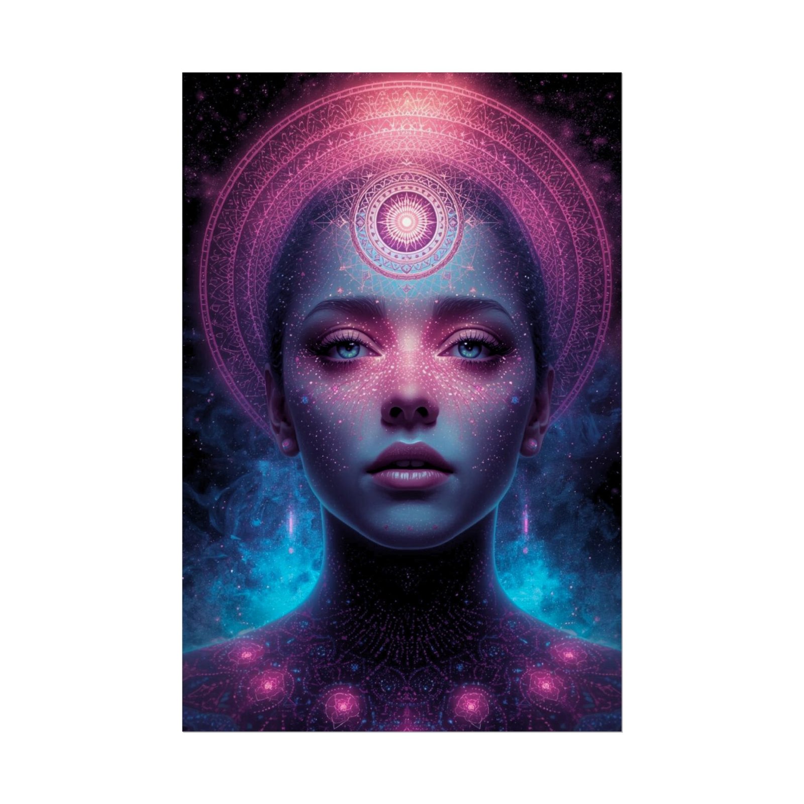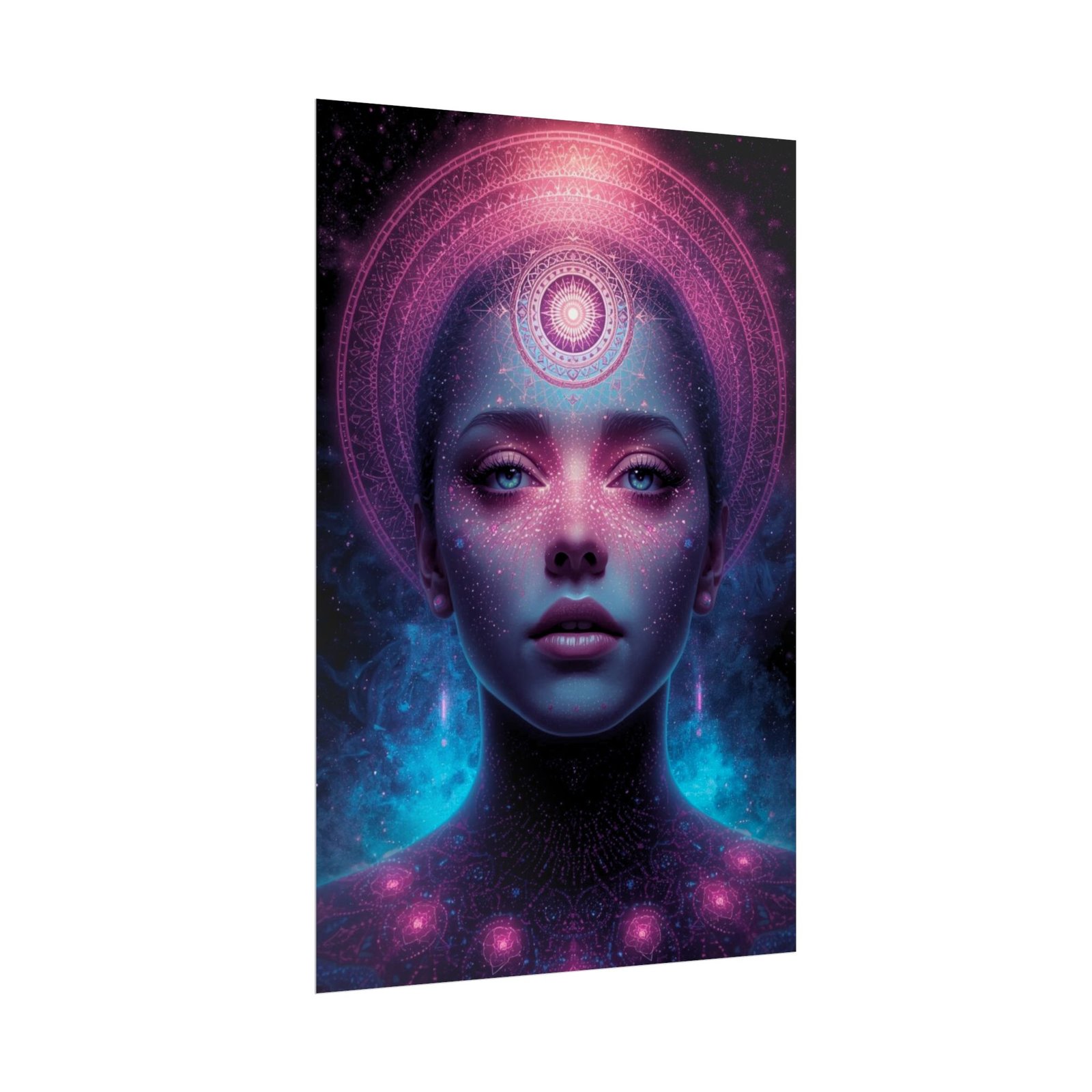 A luminous art poster that pulls the cosmos into any room. This print features a serene, otherworldly portrait bathed in pinks, purples, and electric blues — a meditative focal point that feels both futuristic and spiritual. The semi-glossy choice makes colors pop with photographic clarity; and the matte sheet offers a softer, art-studio look. This poster slips easily into modern, eclectic, or bohemian spaces and suits anyone who collects visionary, cosmic, or surreal artwork. Hung alone or layered with other pieces, it creates an intimate, contemplative atmosphere that invites long looks and quiet reflection.