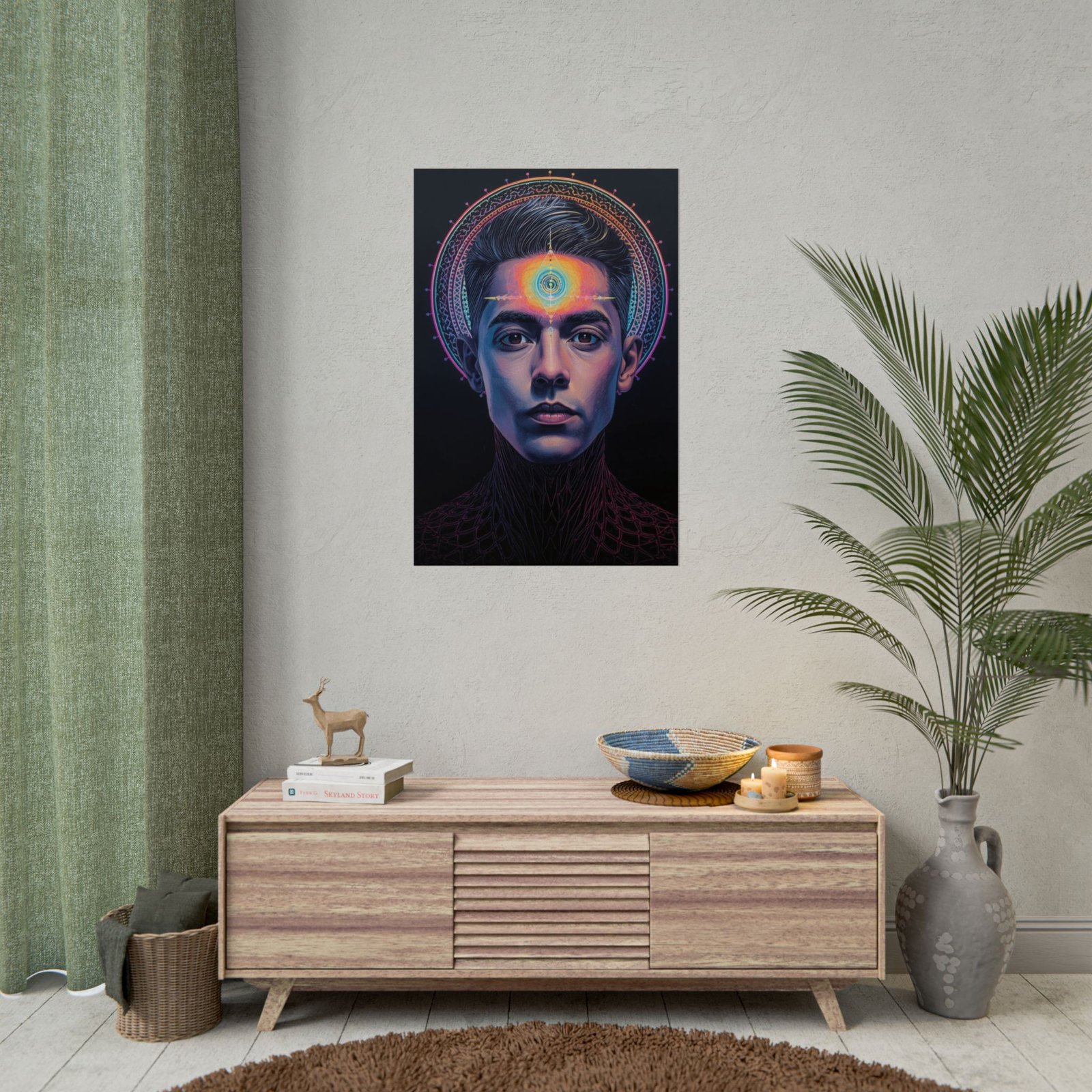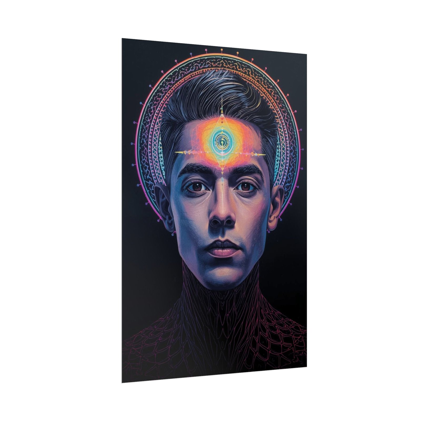 A rolled art poster that brings quiet intensity and luminous color into a meditative space. The portrait centers a calm, focused face crowned by a radiant third‑eye halo rendered in neon-bright giclée inks. Printed on your choice of semi-glossy photo, or muted matte paper, the image retains deep blacks and vivid highlights so the glow reads across dim light and daylight alike. Rolled for safe shipping, this piece slips easily into a tube for transport or framing. Hang it in a studio, altar corner, or living room to anchor moments of reflection and creative focus.