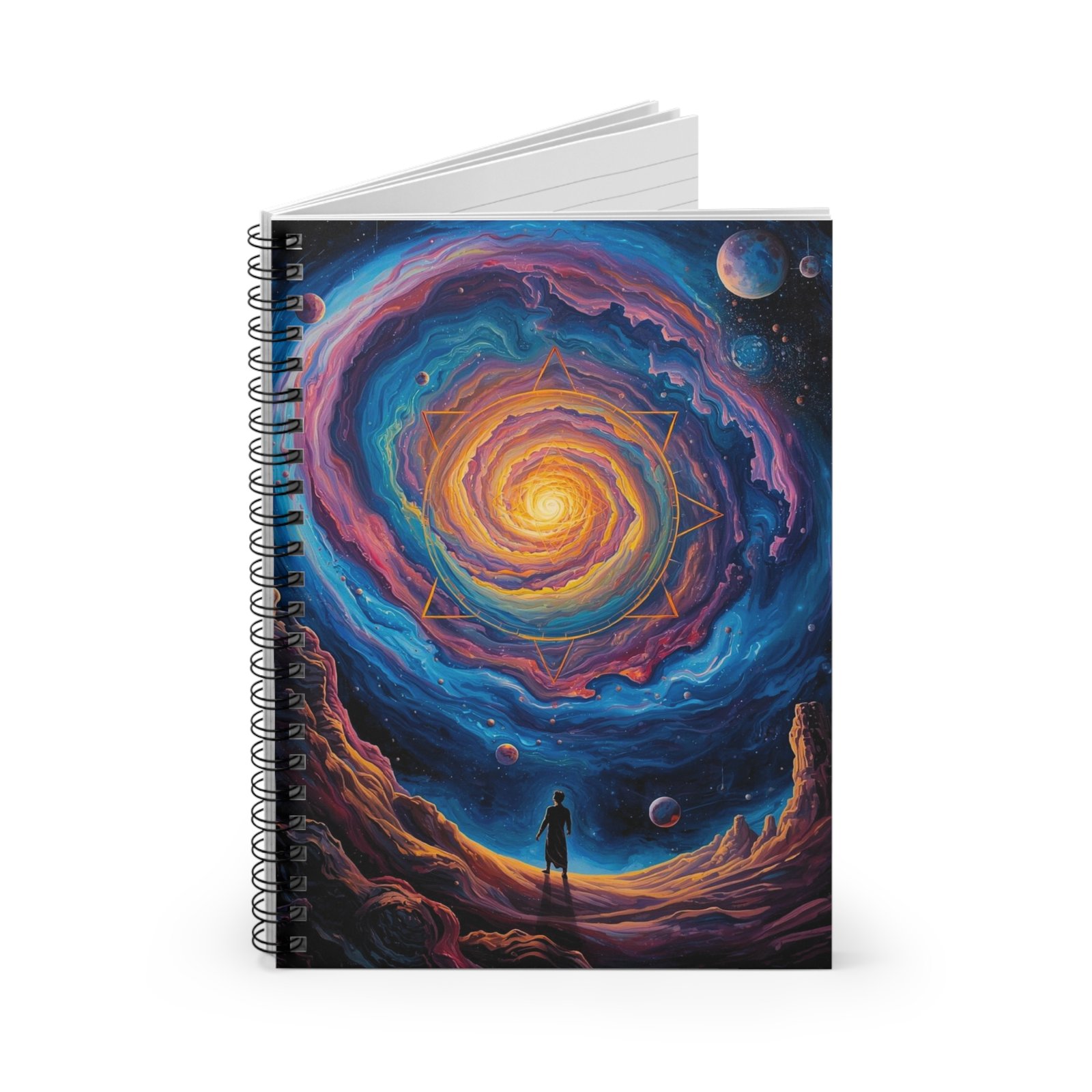 This spiral-ruled notebook invites quiet exploration. The cover artโan orbiting vortex of color with a lone figure beneath swirling galaxiesโsets a mood of wonder before a single line is written. Inside, smooth 90gsm ruled pages take ink and pencil with little bleed, while a metal spiral lets the book lie flat for uninterrupted thought. A hidden document pocket in the back keeps notes, ticket stubs, or reference sheets close at hand. At 6″ x 8″, it slips into backpacks and tote bags for journaling on the go, sketching plans, or mapping out ideas inspired by the cosmos.