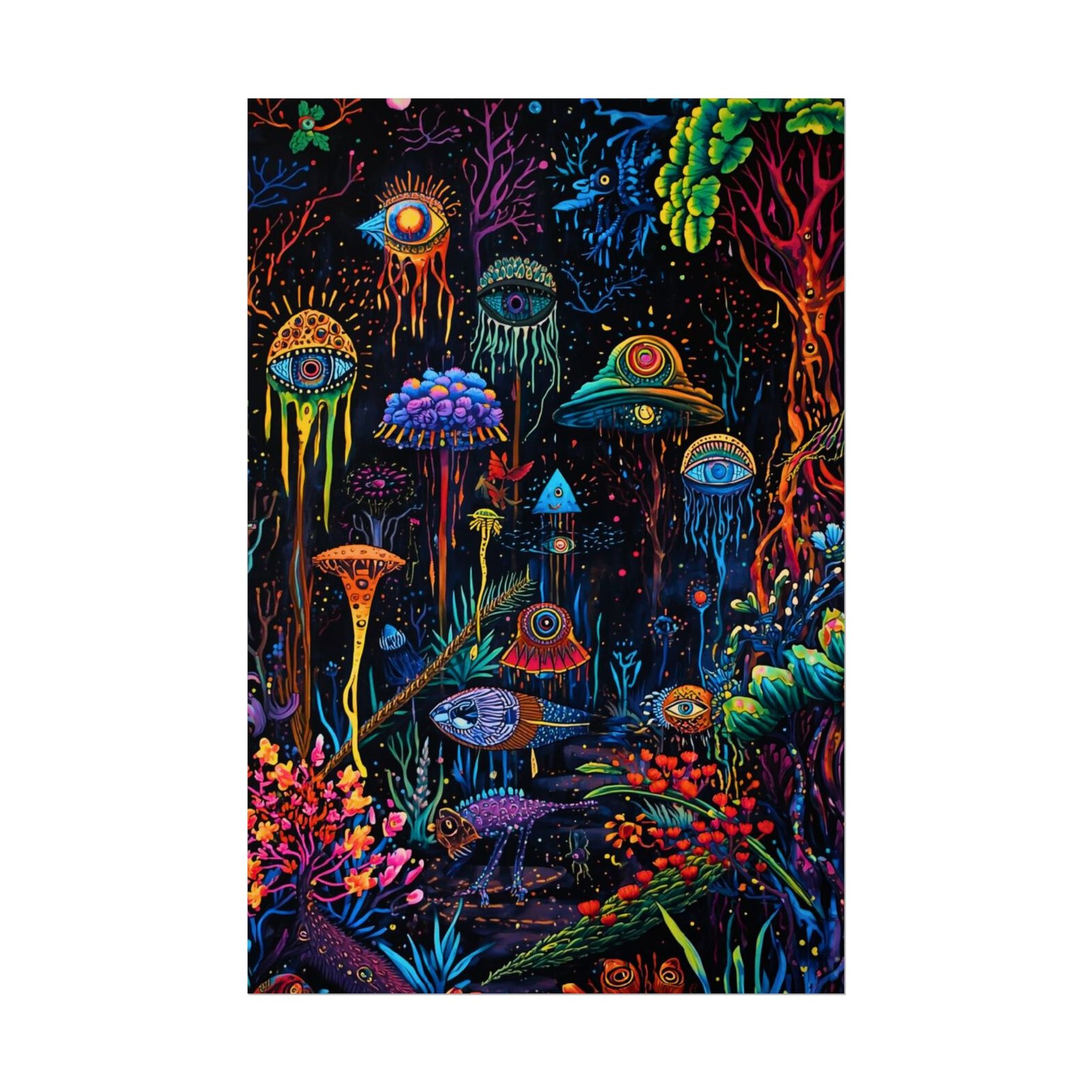 Rolled poster printed with vivid giclée inks on your choice of fine art, semi-glossy, or matte paper. The design is a glowing, psychedelic underwater/forest fantasia—bright neon fungi, watchful eyes, and swirling organic forms that feel alive. Hung above a reading nook or taped to studio walls, this poster brings saturated color and a dreamlike atmosphere that invites long looks and quiet, curious moments. Choose semi-glossy for punchy, sharp color; or matte for a softer, painterly finish.