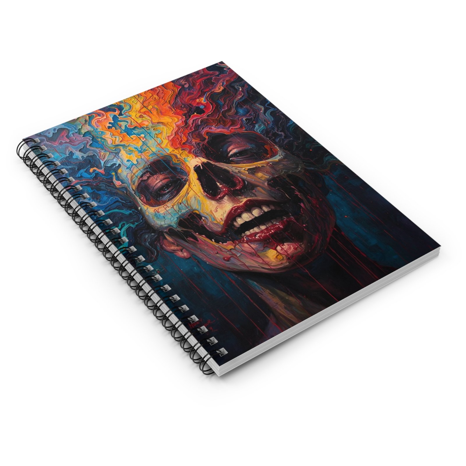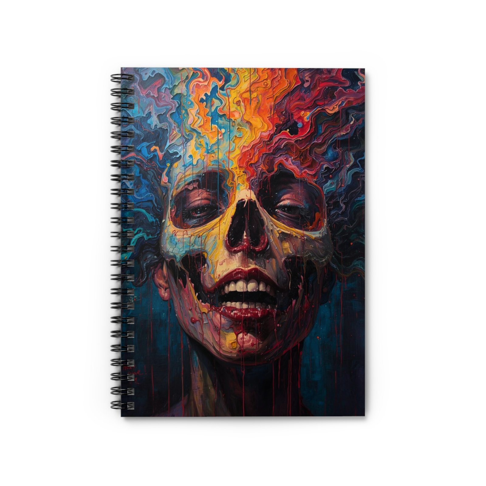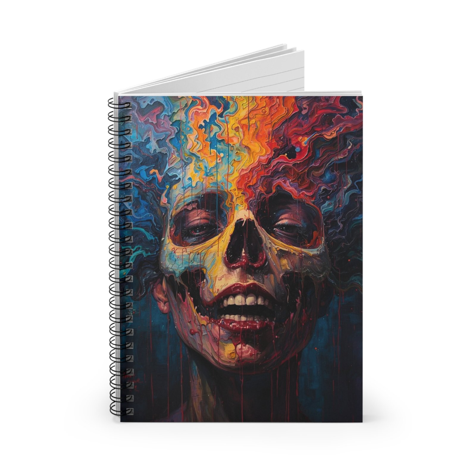 This 6″ x 8″ ruled spiral notebook pairs bold, painterly skull art with practical everyday use. The vibrant front-cover print bursts with saturated color and flowing brushstrokes that feel alive on every page turn. Inside, 118 ruled pages on 90gsm stock handle fountain pens, gel pens, and heavy note-taking without too much bleed. A sturdy 350gsm cover and metal spiral binding keep the notebook flat while you write, and a dark grey back cover with an inner document pocket gives a tidy place for receipts, sketches, or loose notes. Wear it on a daily commute, sketch mood studies, or keep it at your desk as a small but striking source of creative energy.