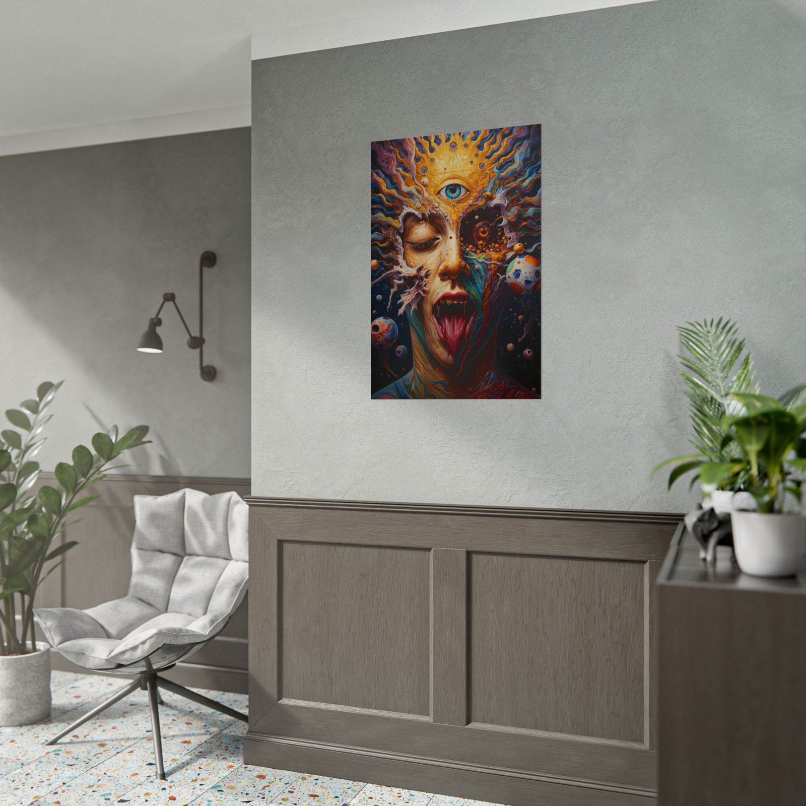 This rolled poster brings a wild, visionary energy to any wall. Vivid giclée inks render every surreal detail — a third eye, cosmic orbs, and fluid, melting textures — with bright, lasting color. Pick semi-glossy for punchy contrast and photographic clarity; or go matte for a gentler, art-studio look that tames glare. Hung in a studio, dorm room, or shared creative space, it becomes a focal point that sparks conversation and invites long, curious looks.