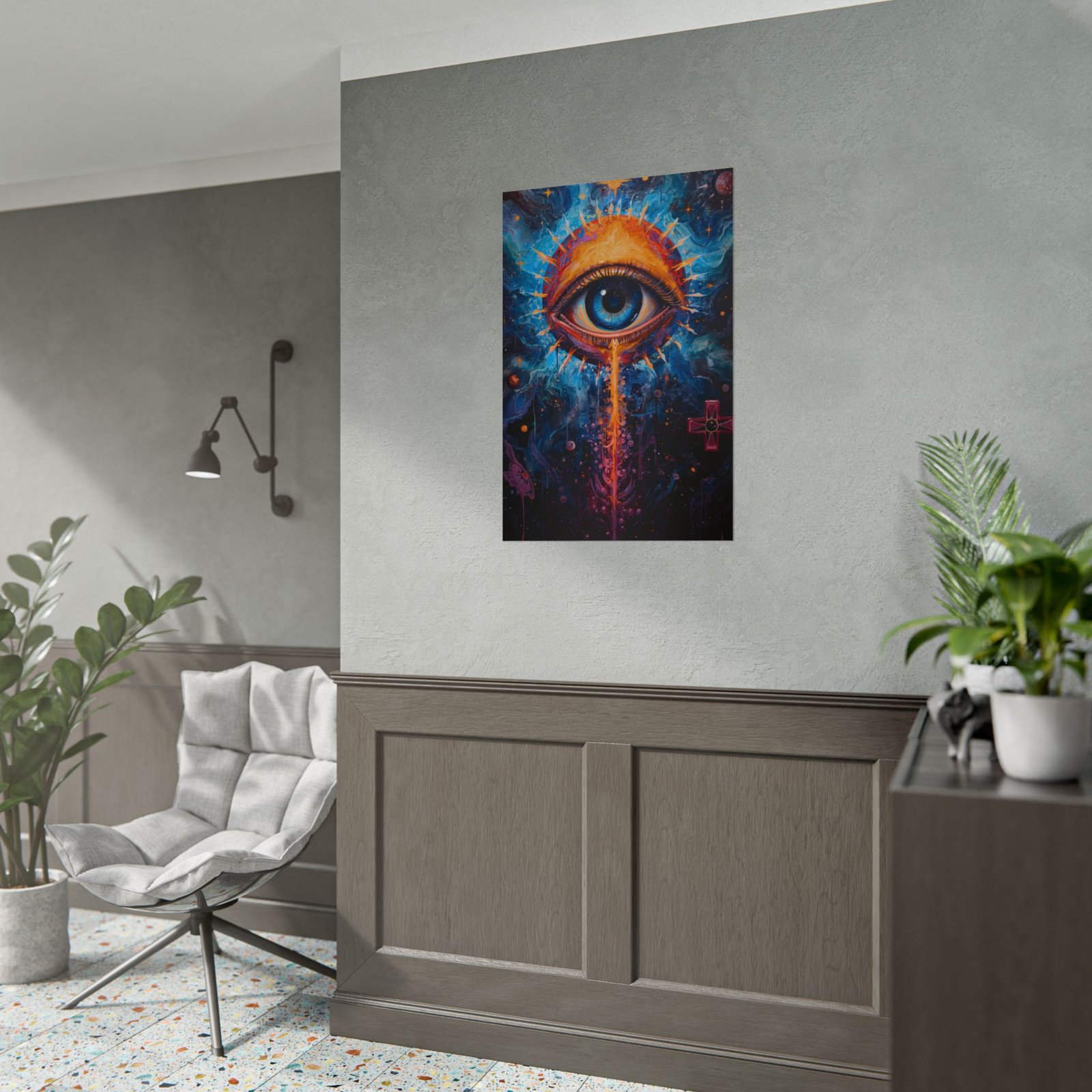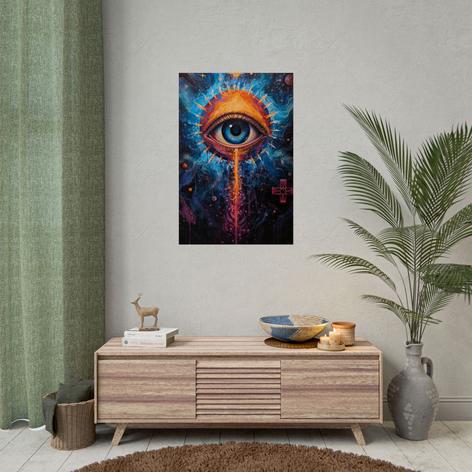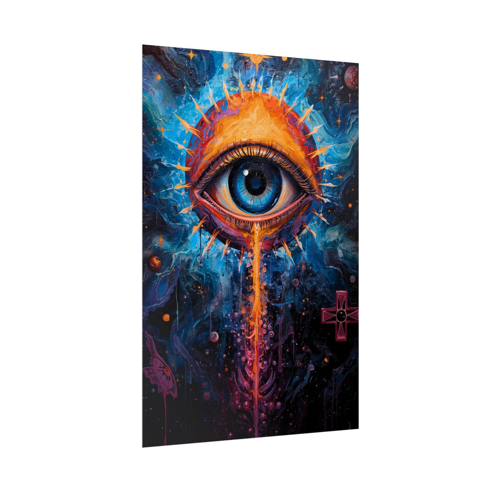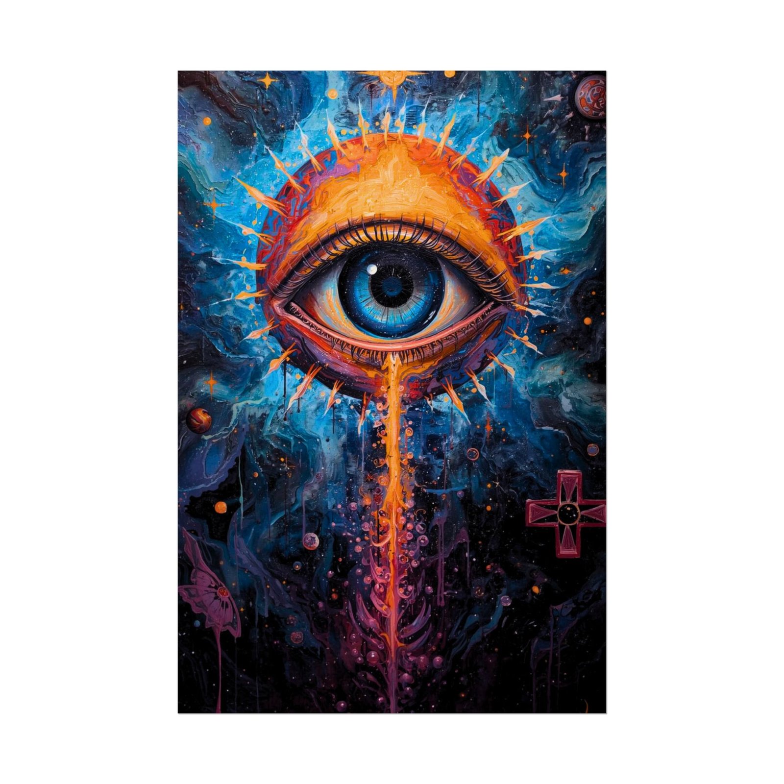 A vivid rolled poster that brings a cosmic, visionary painting into your space. Deep blues and radiant oranges converge around a single, luminous eye, drawing the room inward. Choose from two paper finishes— semi-glossy for punchy color and satin sheen, or matte for a softer, artistic look. The giclée printing preserves rich, saturated hues and archival quality so the imagery stays striking over time. This poster ships rolled for easy framing or mounting and fits the rhythm of studios, meditation corners, or eclectic living spaces.
