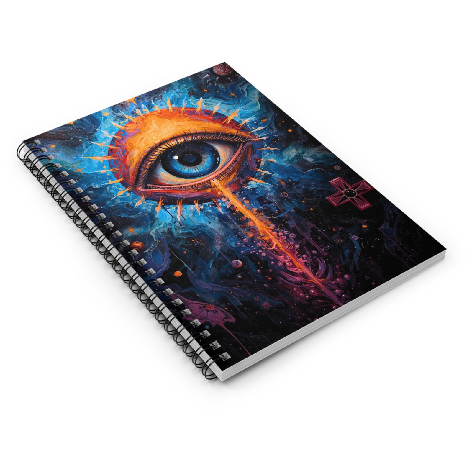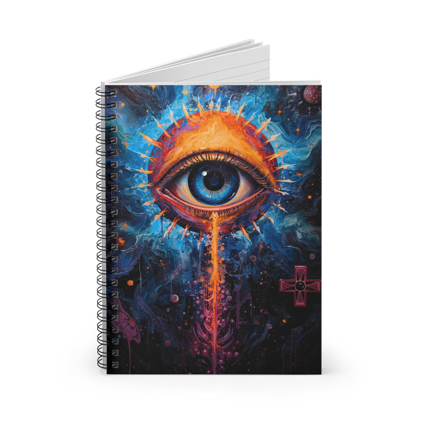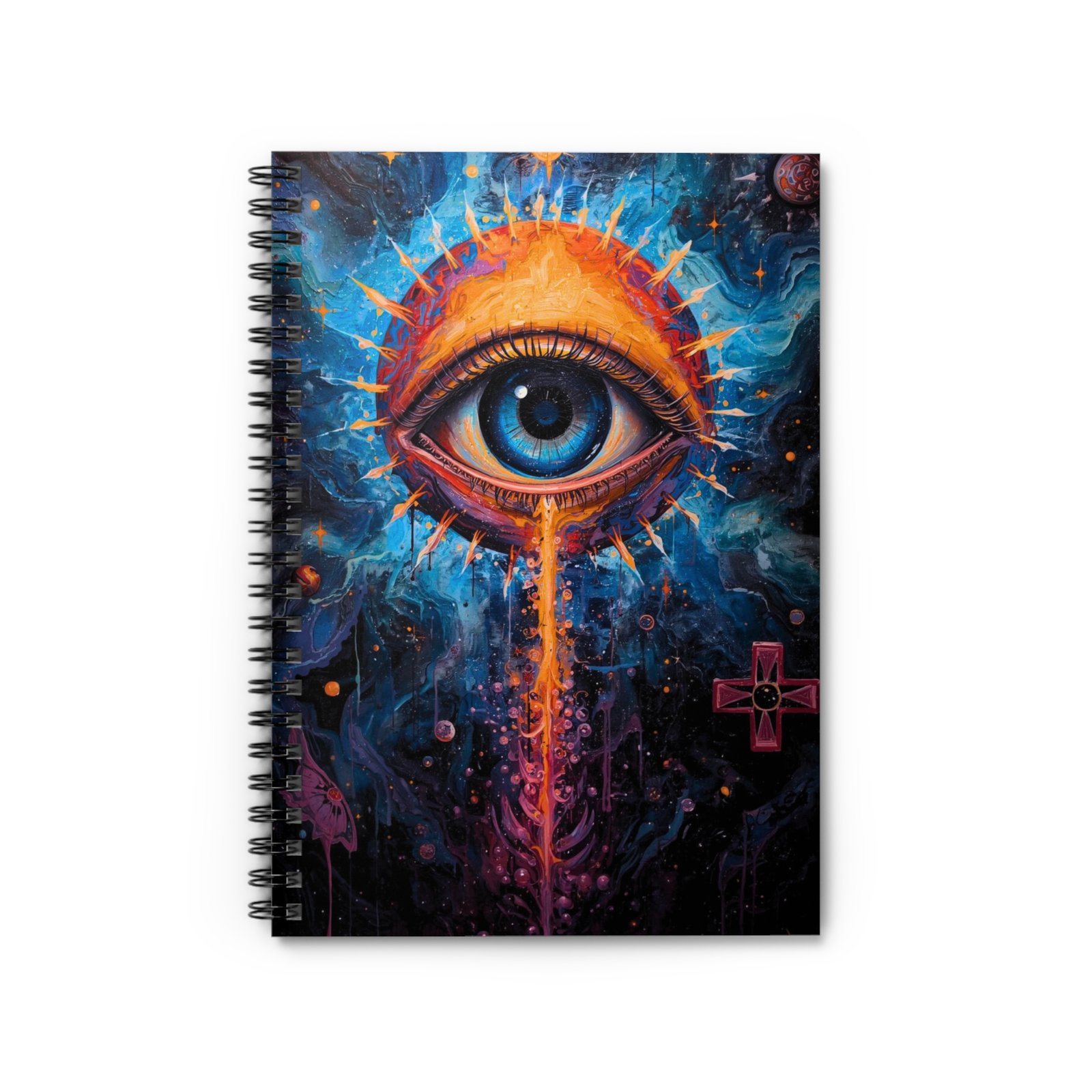 A compact spiral notebook wrapped in a vivid, surreal eye illustration โ a little portal for thoughts, sketches, and late-night revelations. The ruled 90gsm pages take ink and pen smoothly, so ideas flow instead of skipping. The sturdy 350gsm covers protect whatever you carry inside, while the metal spiral lets the book lie flat or fold back for quick notes on the go. A built-in document pocket in the back keeps loose papers, tickets, or reference clippings within reach. This is for people who keep their notebooks close: sketching between trains, tracking projects at a cafรฉ, or writing down the insights that arrive at two in the morning. The coverโs intense colors and cosmic eye invite curiosity every time you open it โ a small, powerful companion for creative routines and reflective moments.