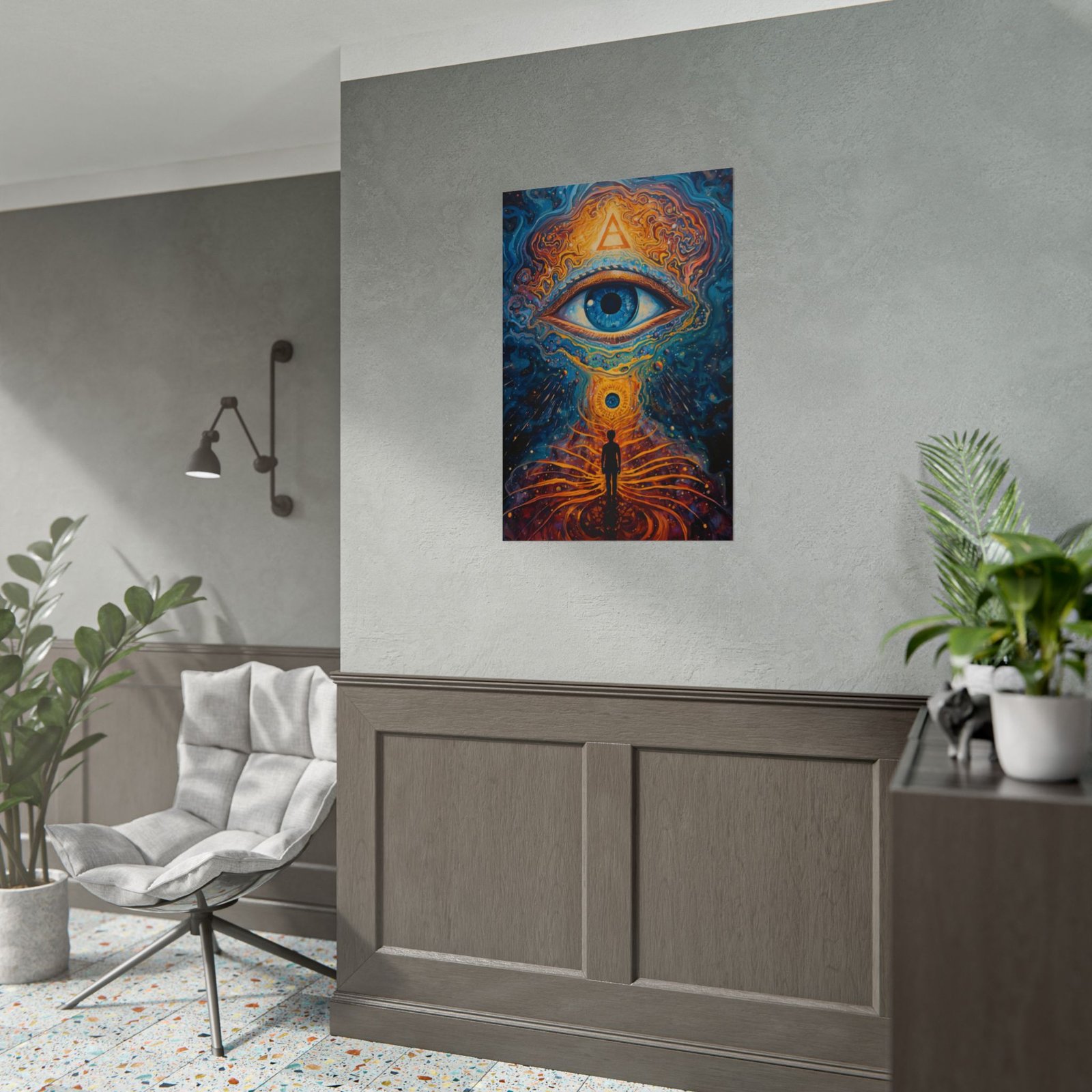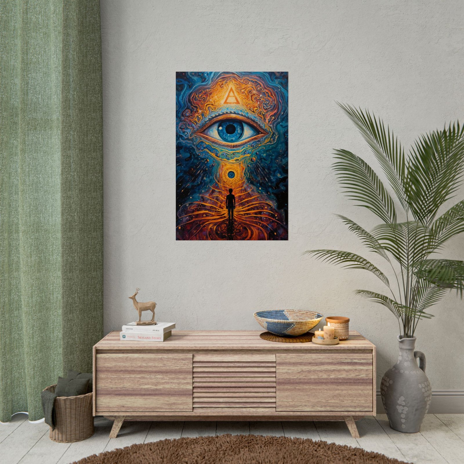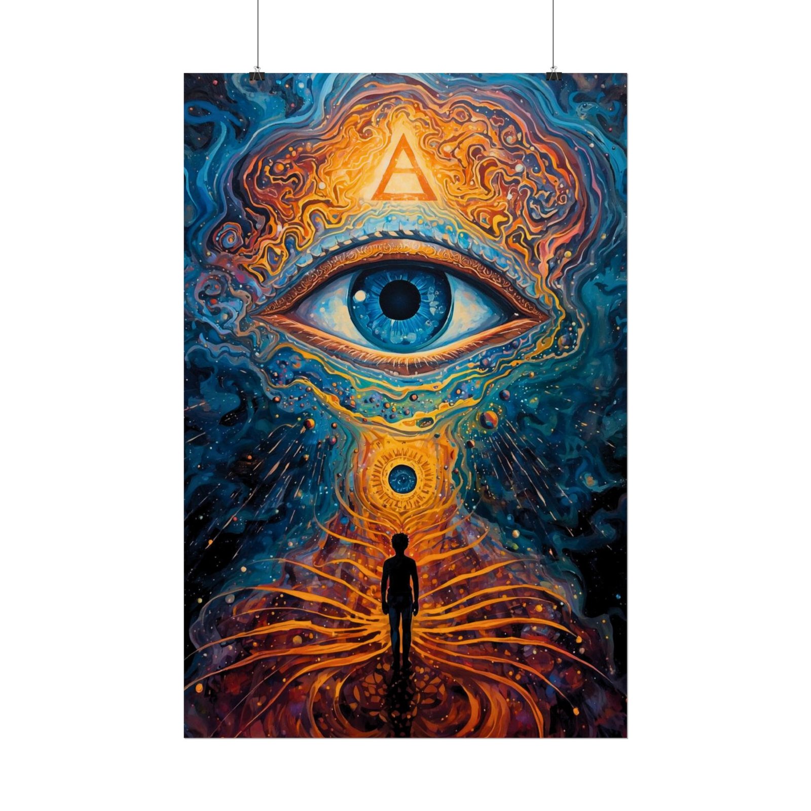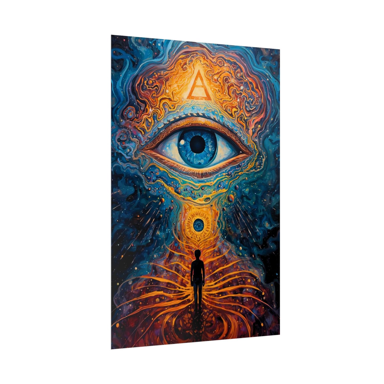 A rolled art poster that pulls the inner eye outward and the soul inward. Swirling indigo and molten gold converge around a single, luminous eye and a solitary figure standing at the center of a cosmic pathway. The imagery feels like an invitation to long quiet nights of reflection, meditation corners, or a studio wall where creativity and introspection meet. Choose from satin semi-gloss, or low-sheen matte finishes. Each print uses archival giclée inks for vivid, lasting color and arrives rolled for safe, easy framing or mounting.